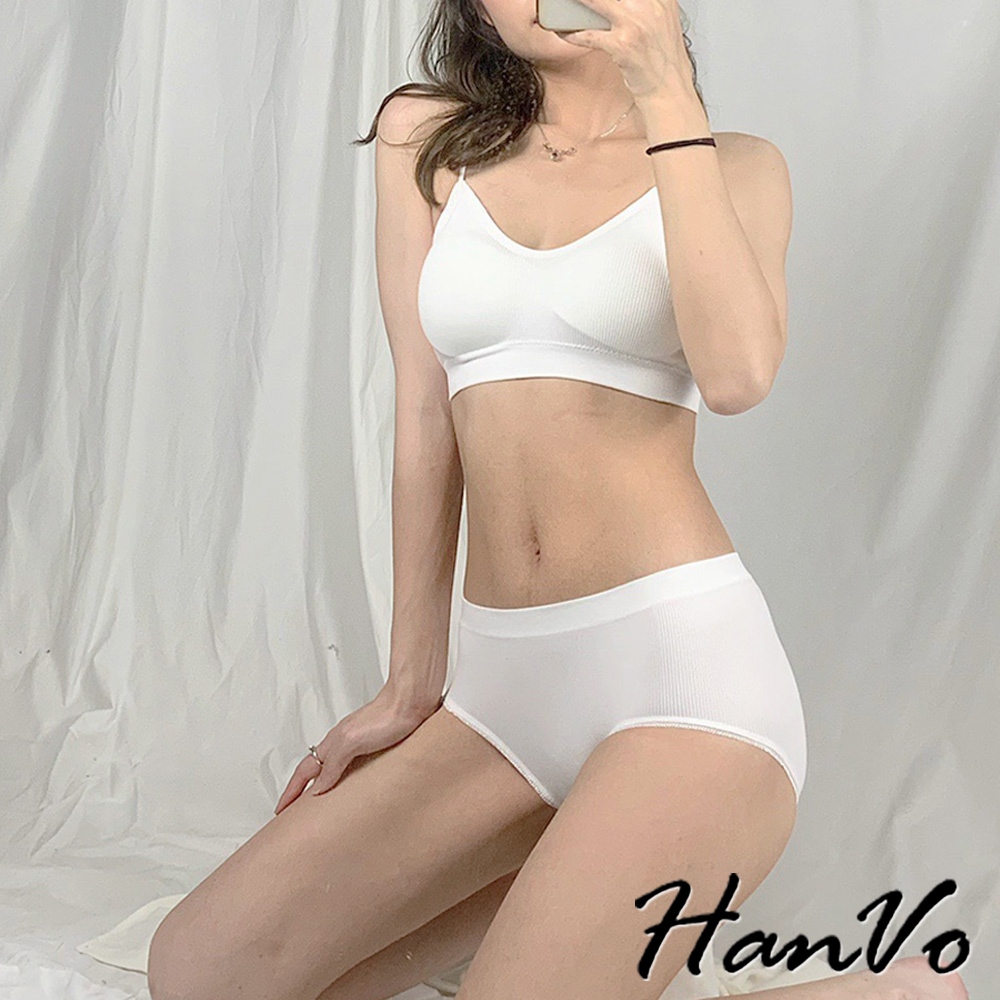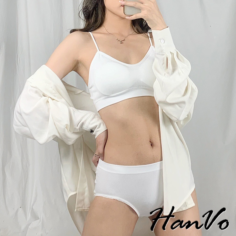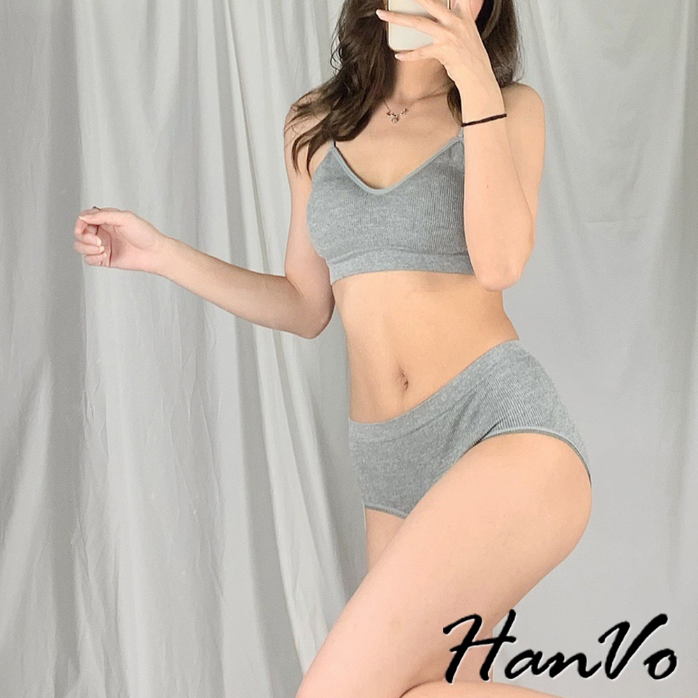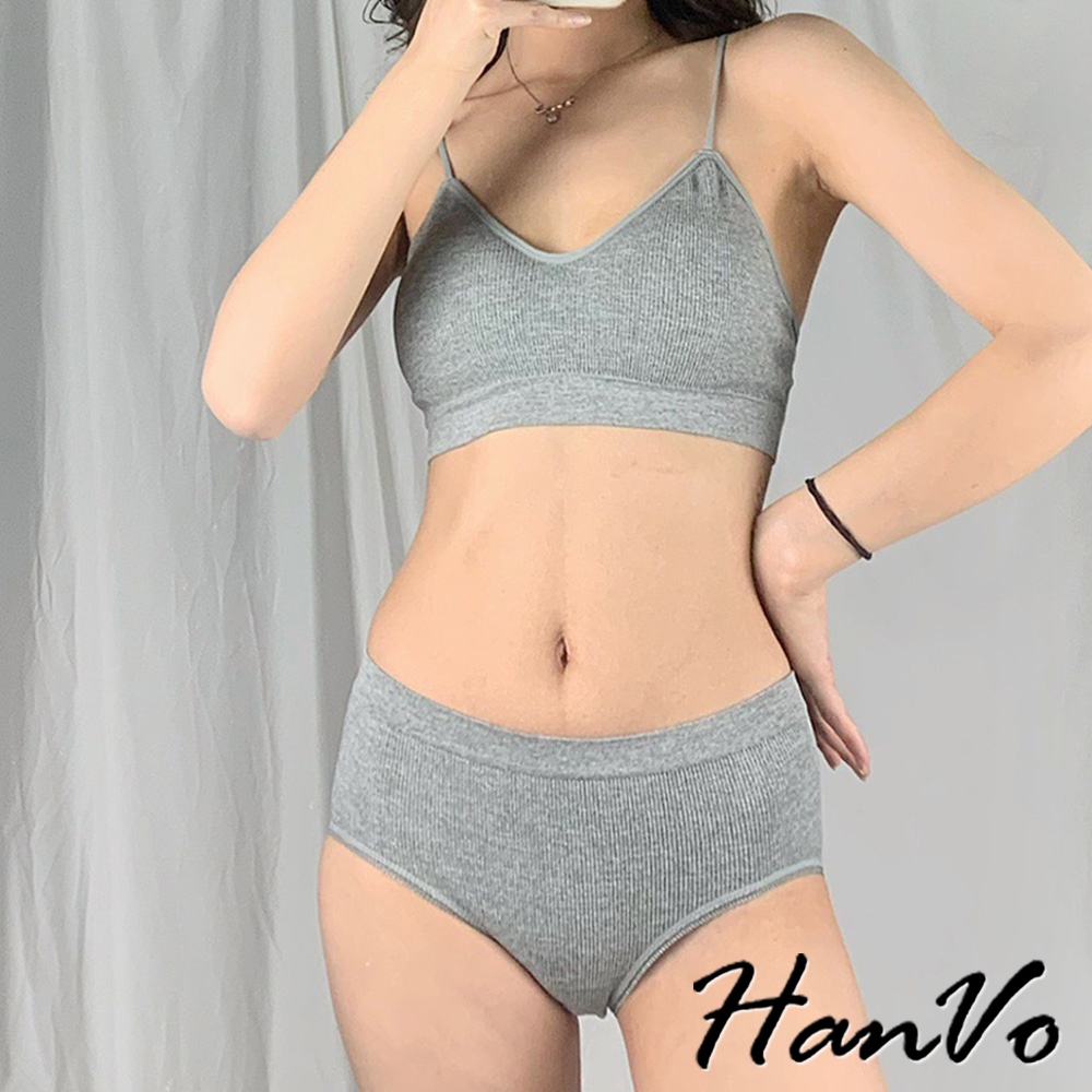 【HanVo】簡約螺紋小可愛內褲套裝 親膚透氣彈性小可愛 附可拆式胸墊 居家內搭 女生衣著 A09-5068黑色|白色|灰色SetsHanVo Wear Collection