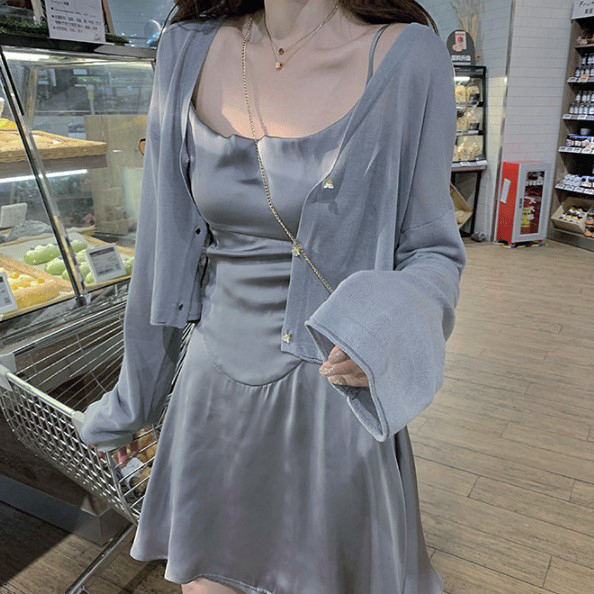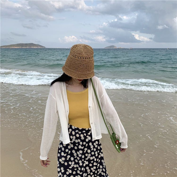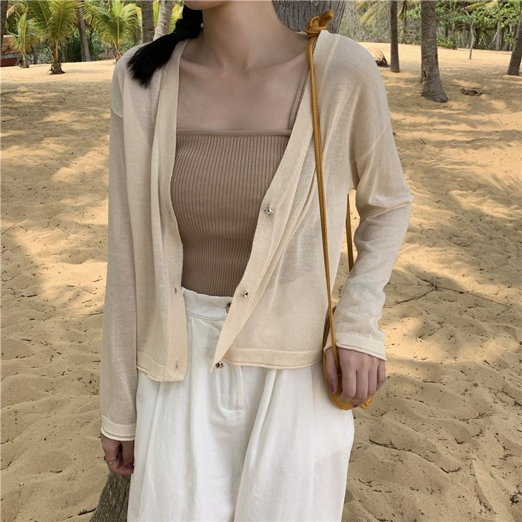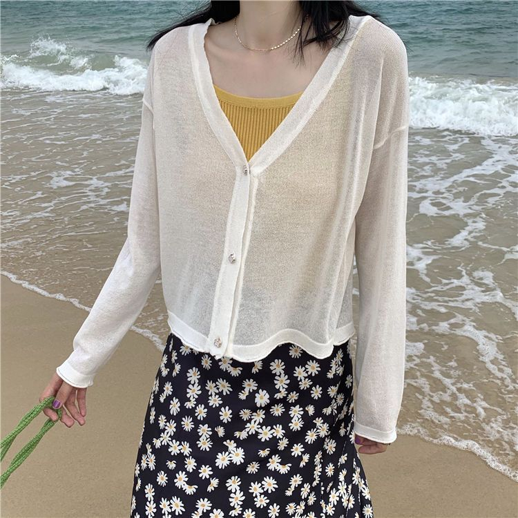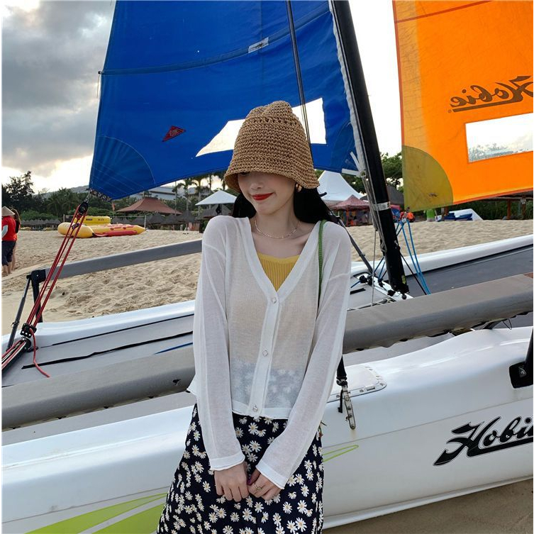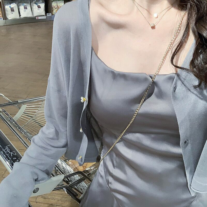 【HanVo】日系小花鈕釦薄款針織罩衫 薄外套冷氣房必備空調衫 冰絲涼感透膚外套上衣 女生衣著 A07-1605灰色|杏色|米白JacketsHanVo Wear Collection