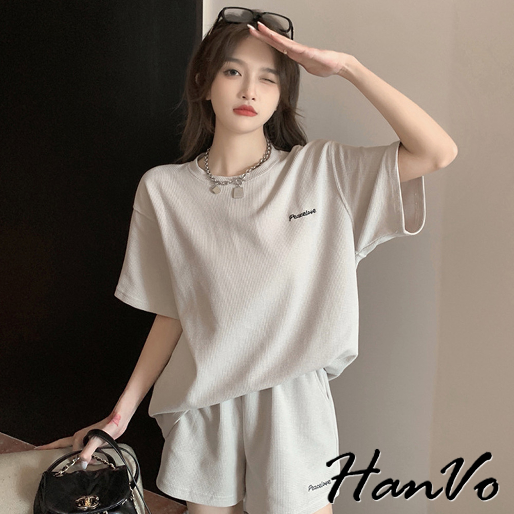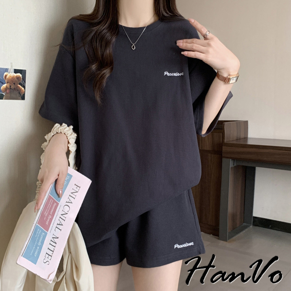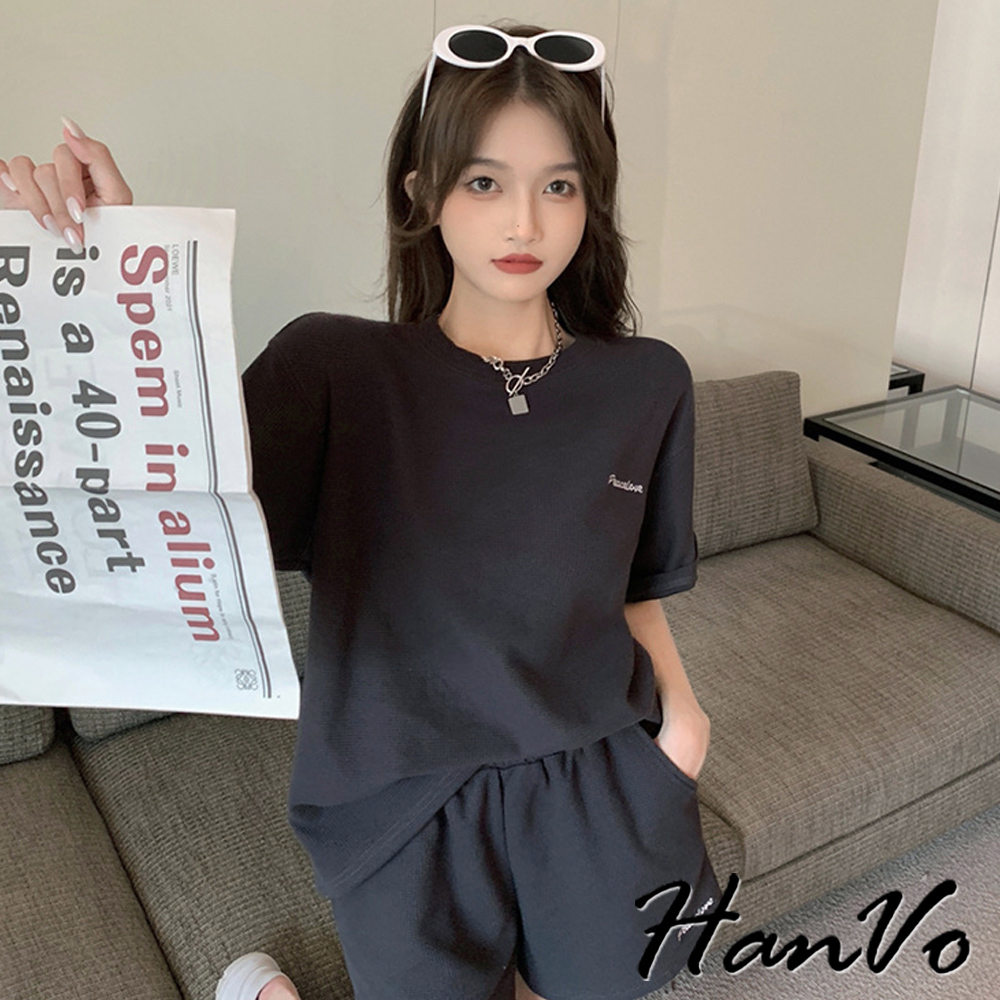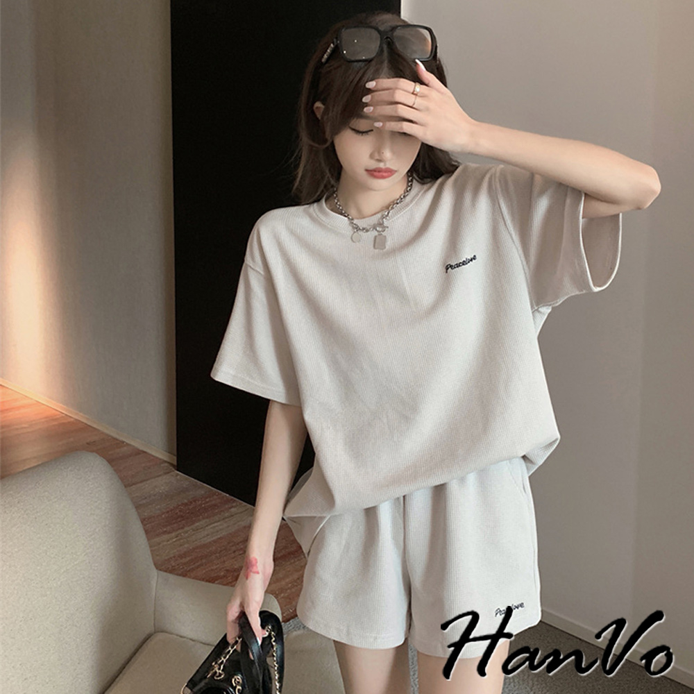 【HanVo】歐美風華夫格寬鬆休閒套裝 舒適親膚休閒運動套裝 日常韓系女裝 女生衣著 A08-5965黑色|深灰色|米杏色Individual SetsHanVo Wear Collection