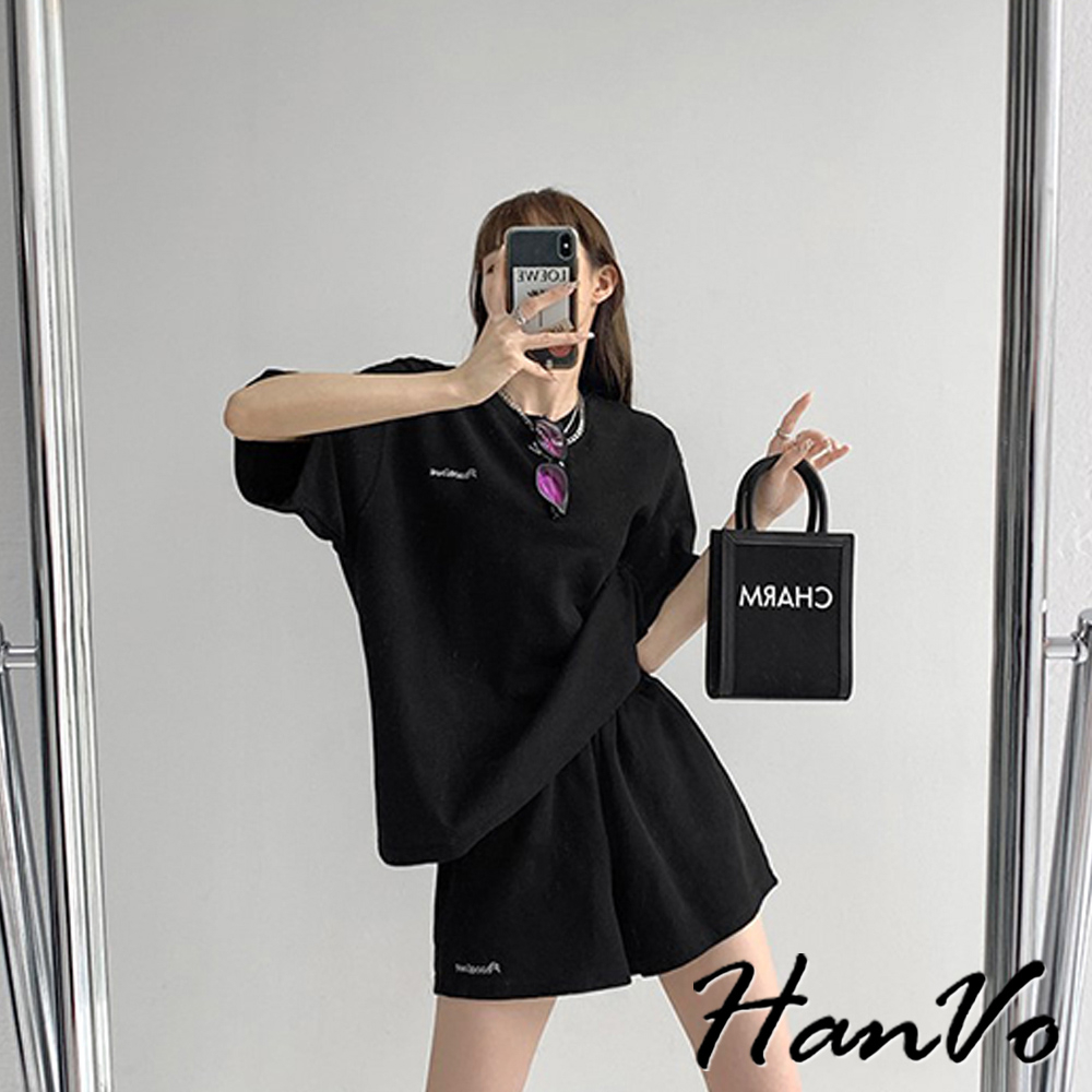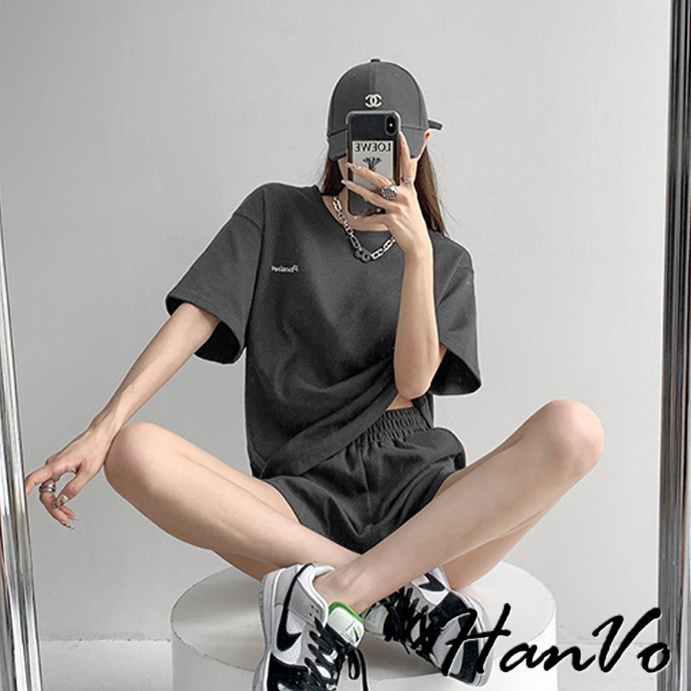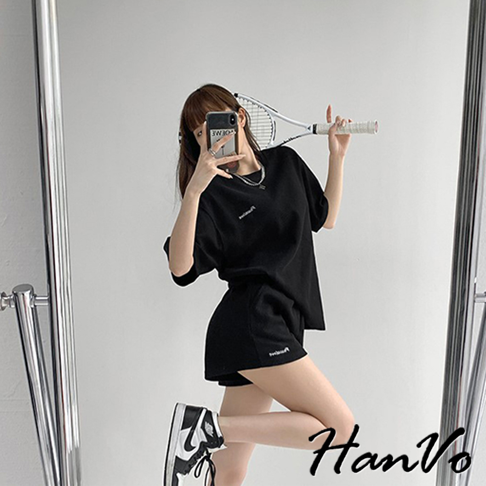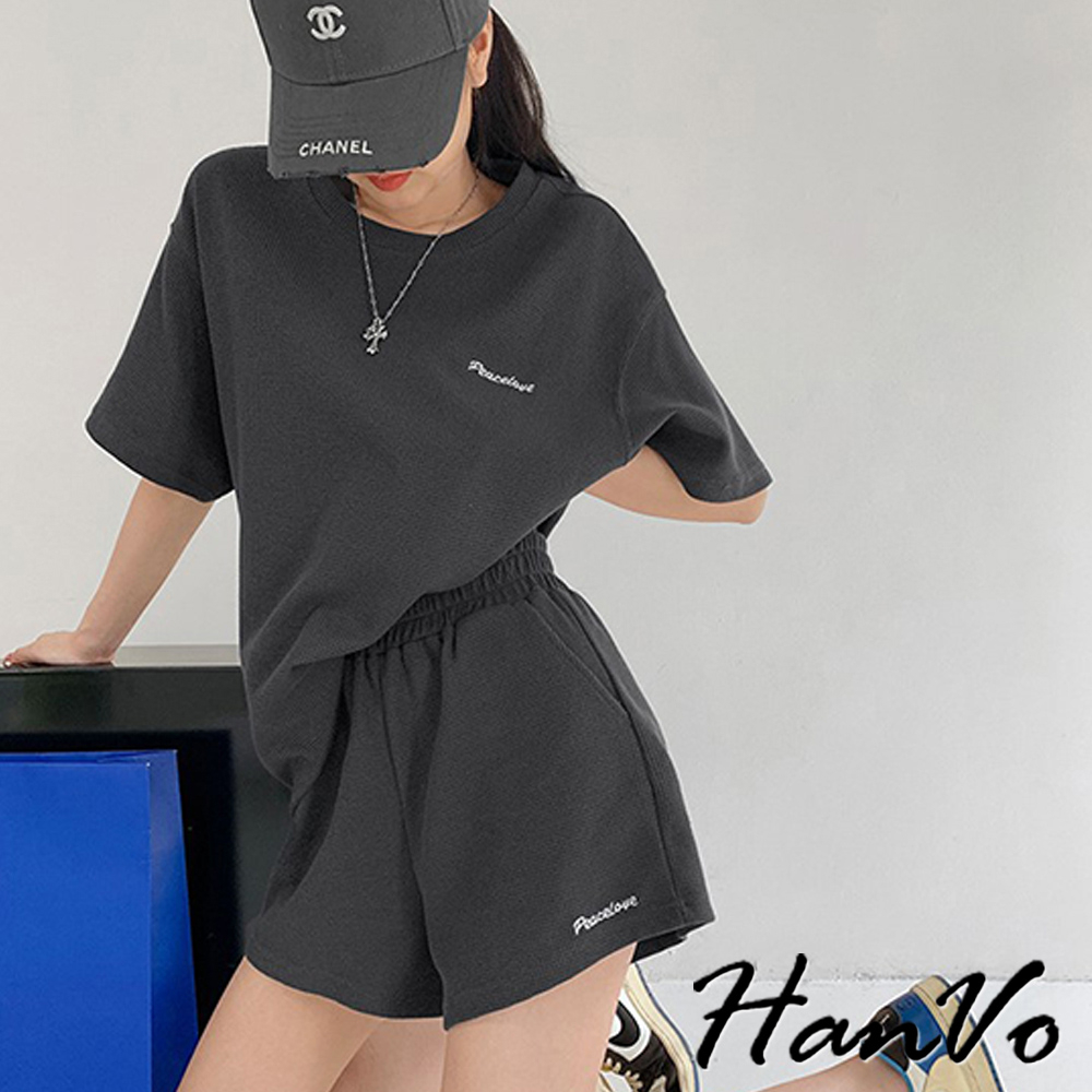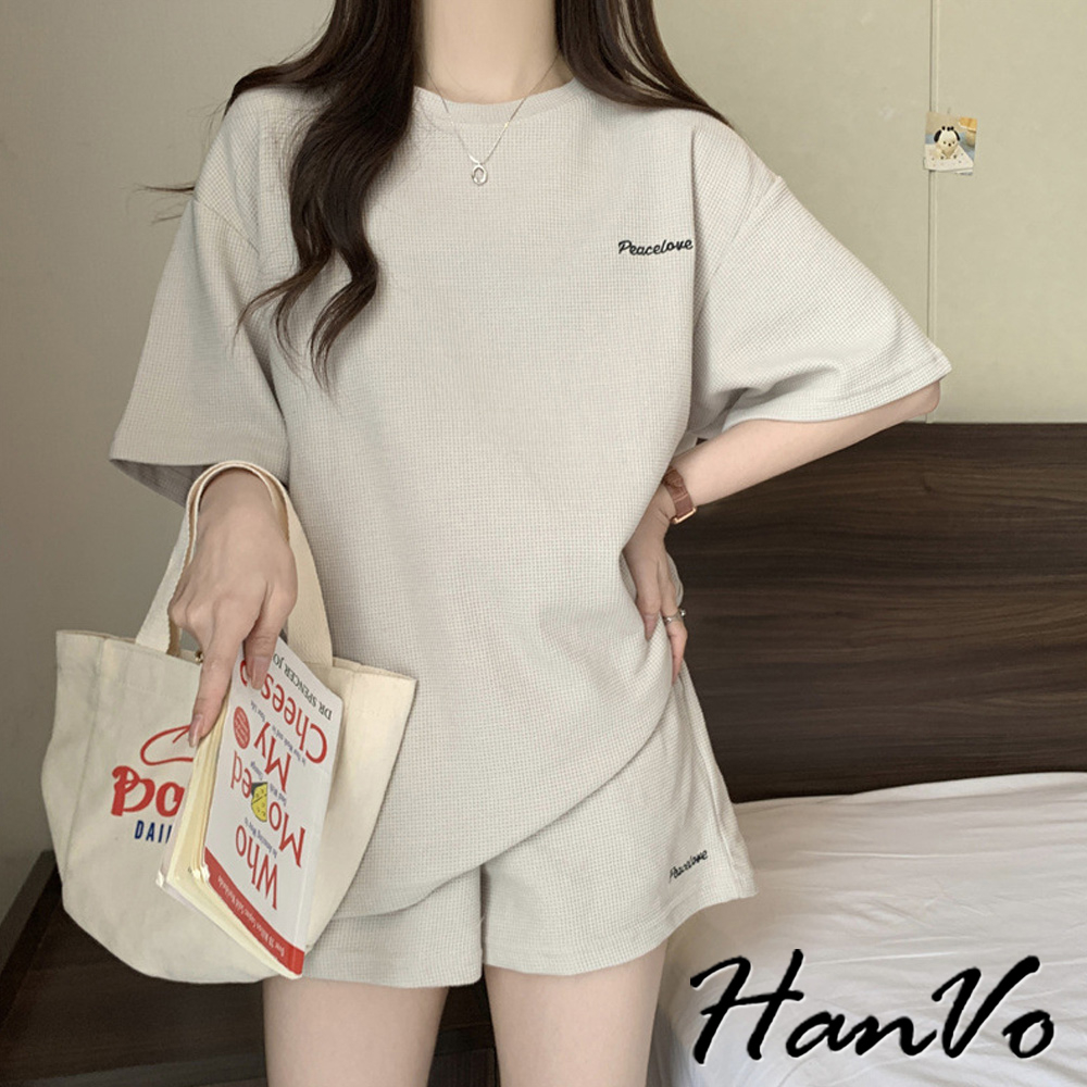 【HanVo】歐美風華夫格寬鬆休閒套裝 舒適親膚休閒運動套裝 日常韓系女裝 女生衣著 A08-5965黑色|深灰色|米杏色Individual SetsHanVo Wear Collection