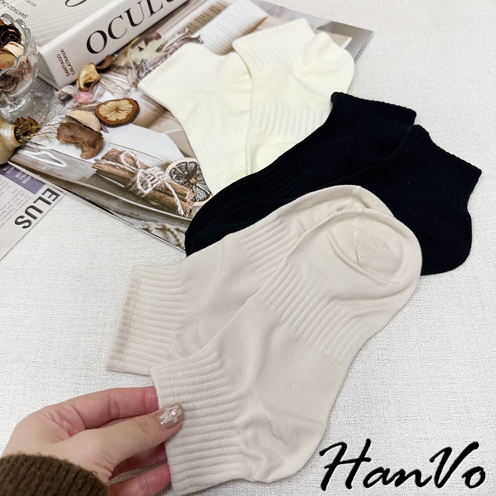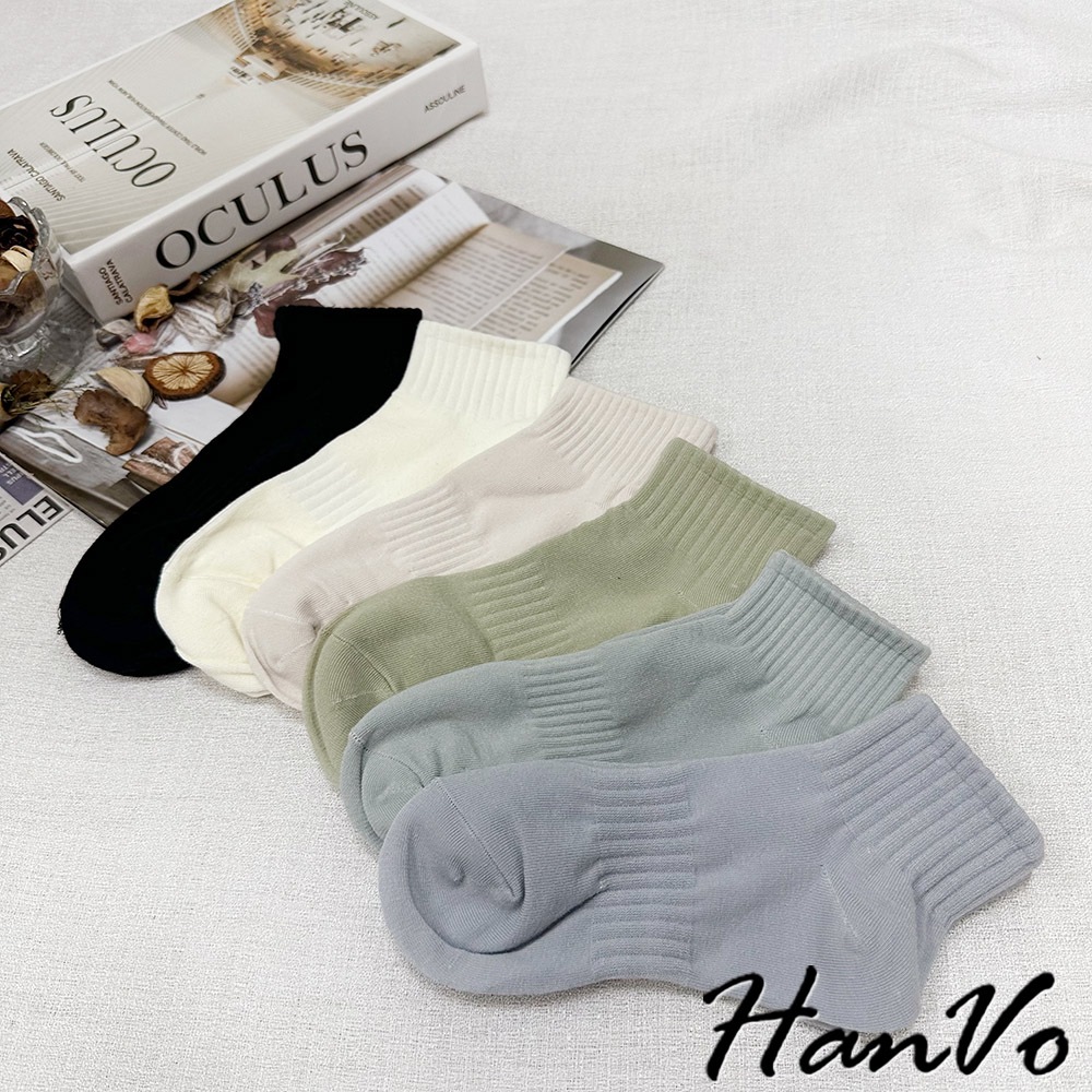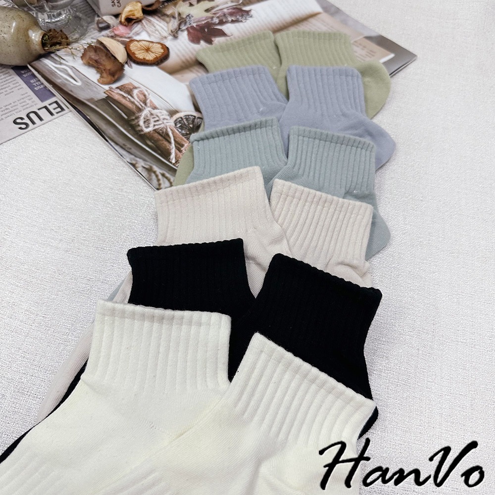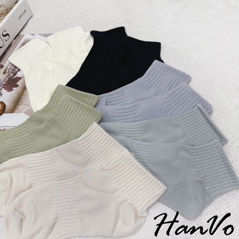 【HanVo】束腰休閒運動棉質短襪 簡約百搭舒適親膚船襪 韓系襪子 襪子 女襪 女生配件 A12-6305霧灰藍|天空藍|奶油白|芝麻黑|冷調灰|蜜瓜綠|燕麥杏SocksHanVo Wear Collection