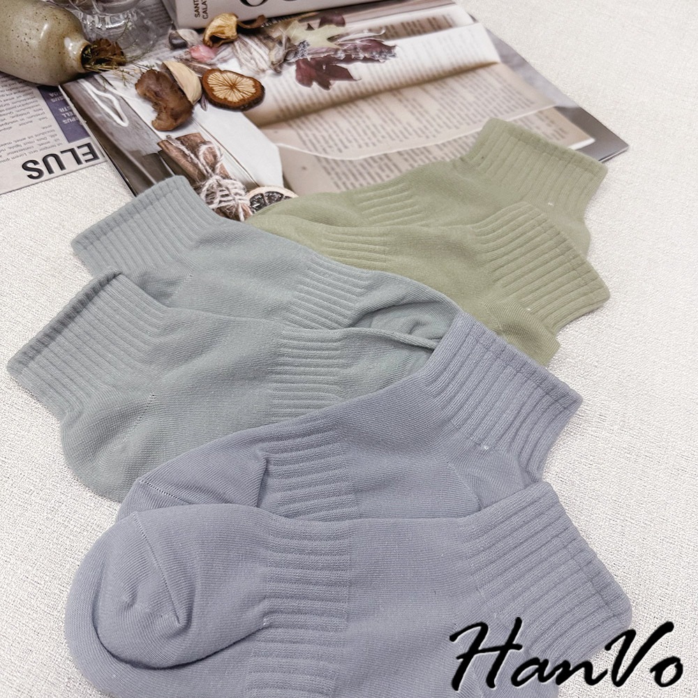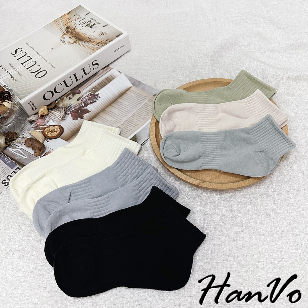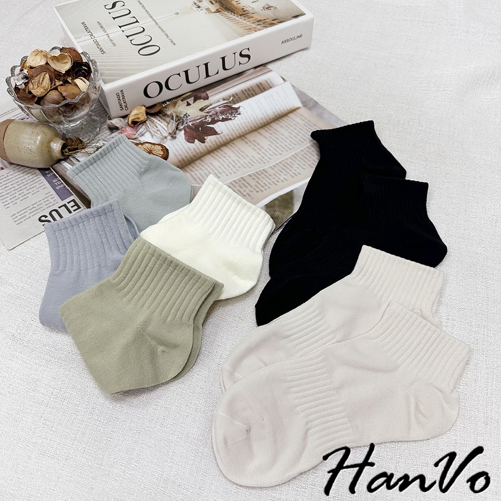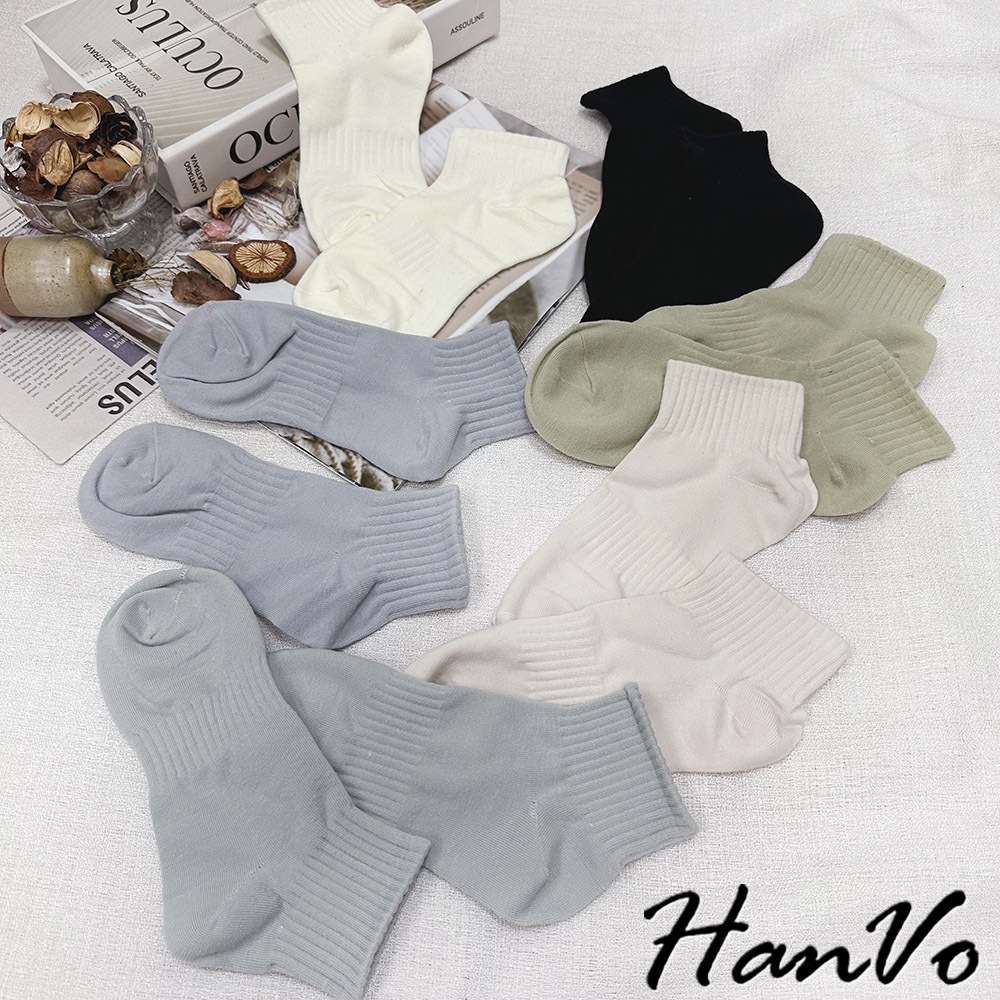 【HanVo】束腰休閒運動棉質短襪 簡約百搭舒適親膚船襪 韓系襪子 襪子 女襪 女生配件 A12-6305霧灰藍|天空藍|奶油白|芝麻黑|冷調灰|蜜瓜綠|燕麥杏SocksHanVo Wear Collection