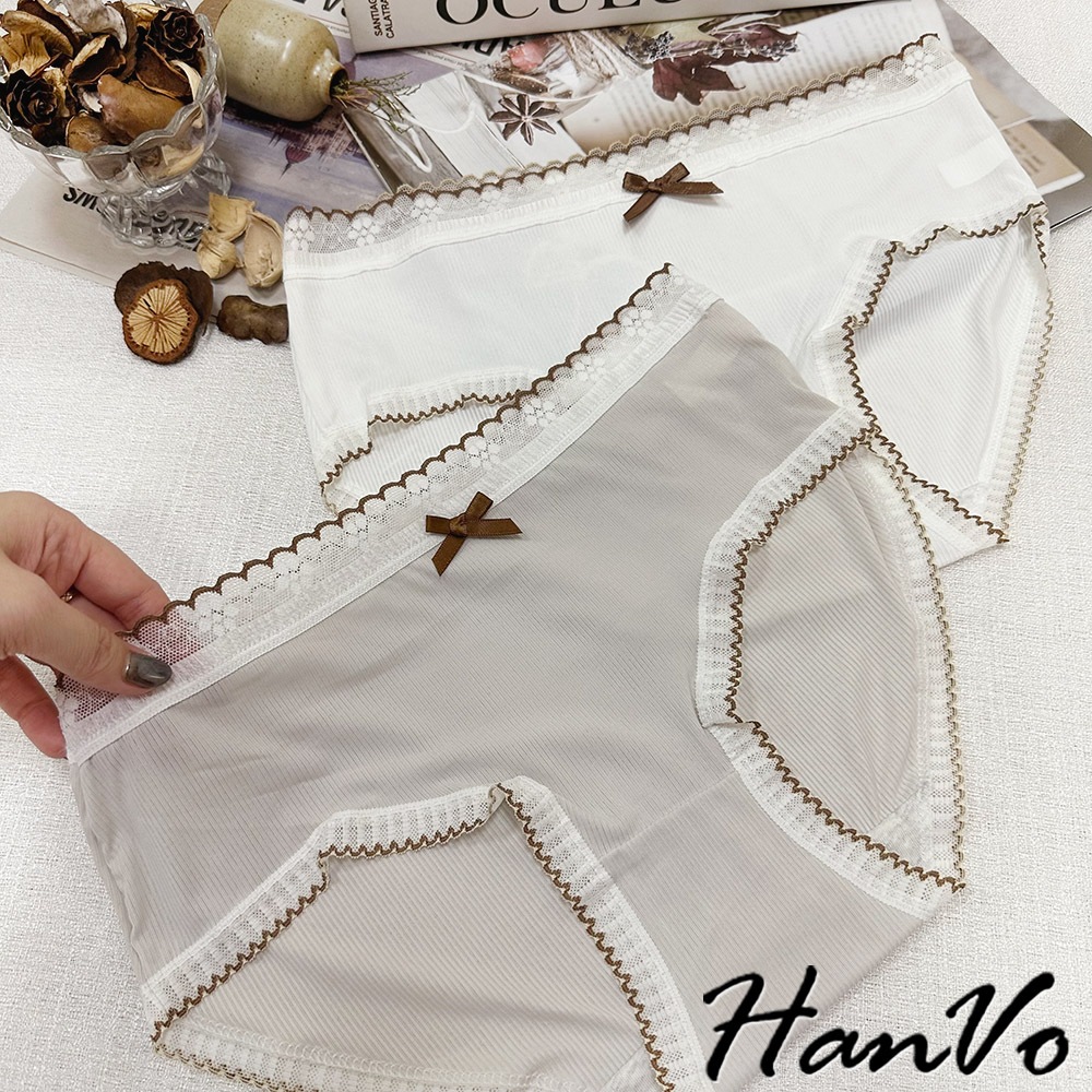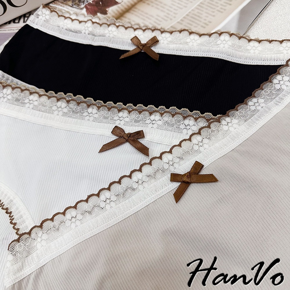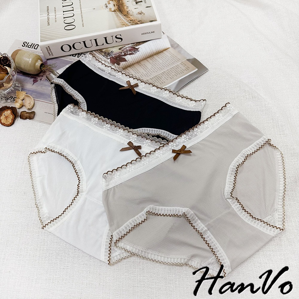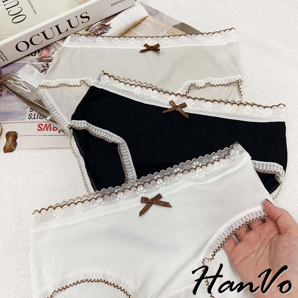 【HanVo】典雅蕾絲花邊蝶結透膚內褲 透氣裸感包覆 獨立包裝 中腰 純棉底襠 透氣內褲 女內褲 內褲 A11-5864天使白|質感灰|夜幕黑PantiesHanVo Wear Collection