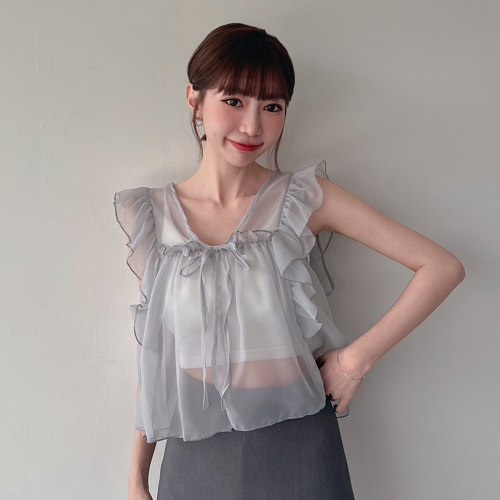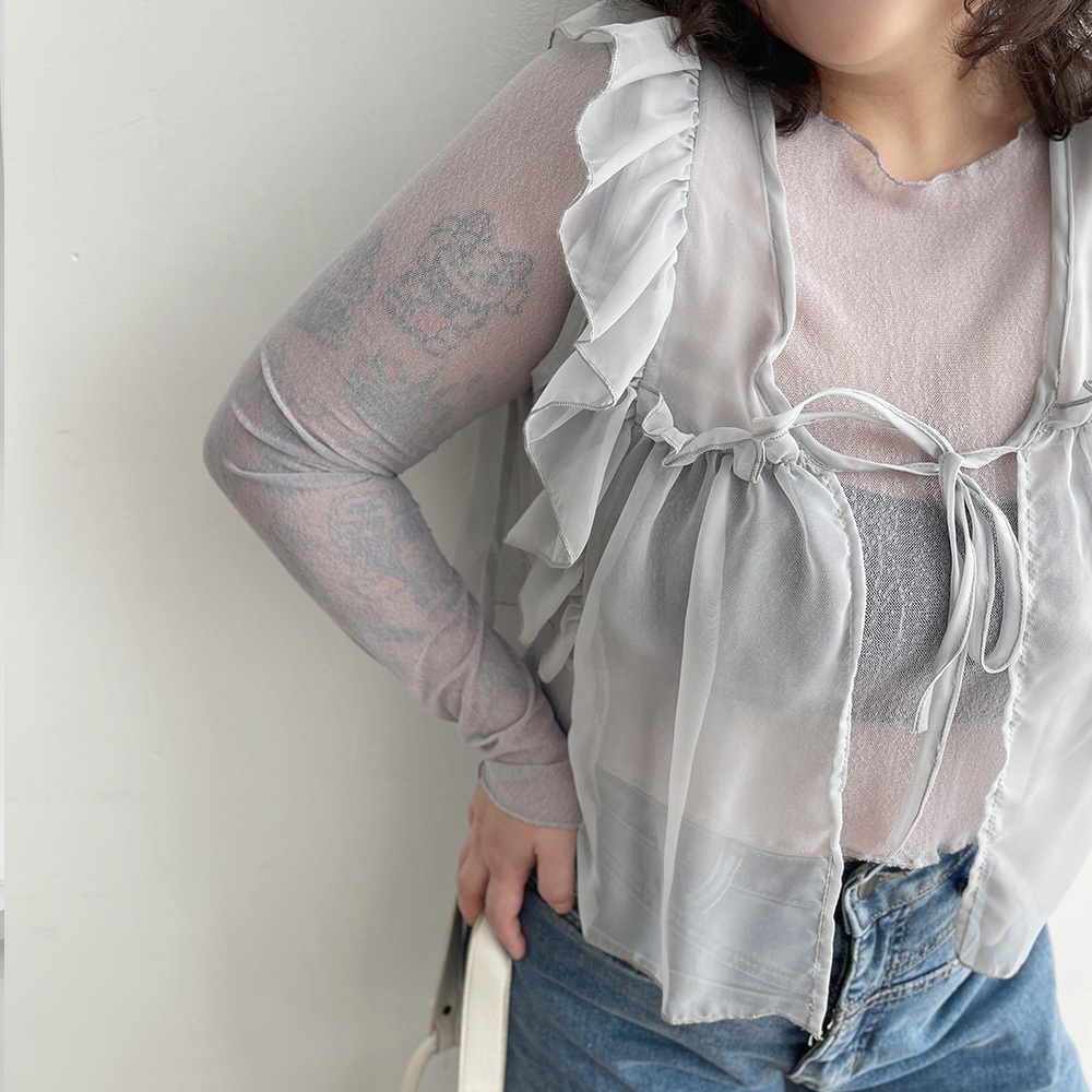 LULUS/PLUS/中大尺碼/前綁帶荷葉透膚背心罩衫3色【A03250005】雪紡紗 240213淺灰|黑|白JacketsLULUS