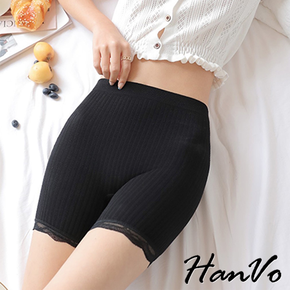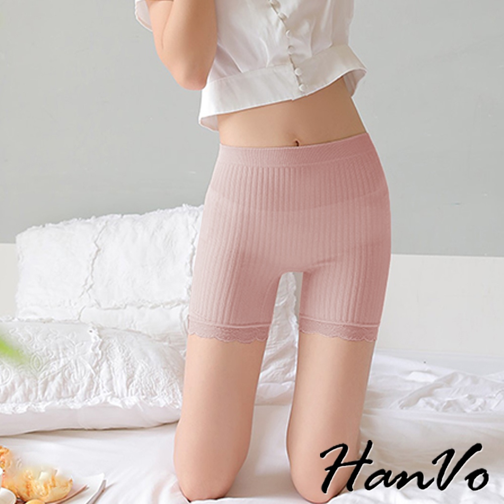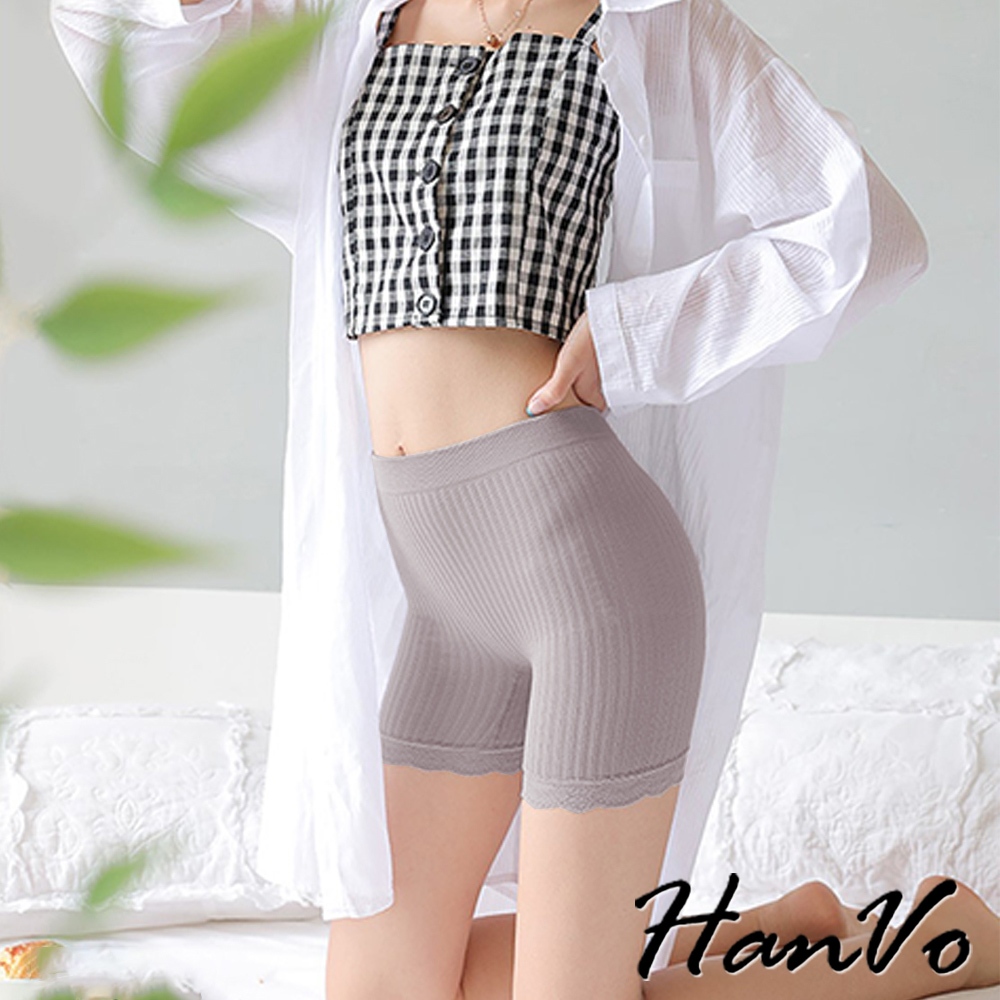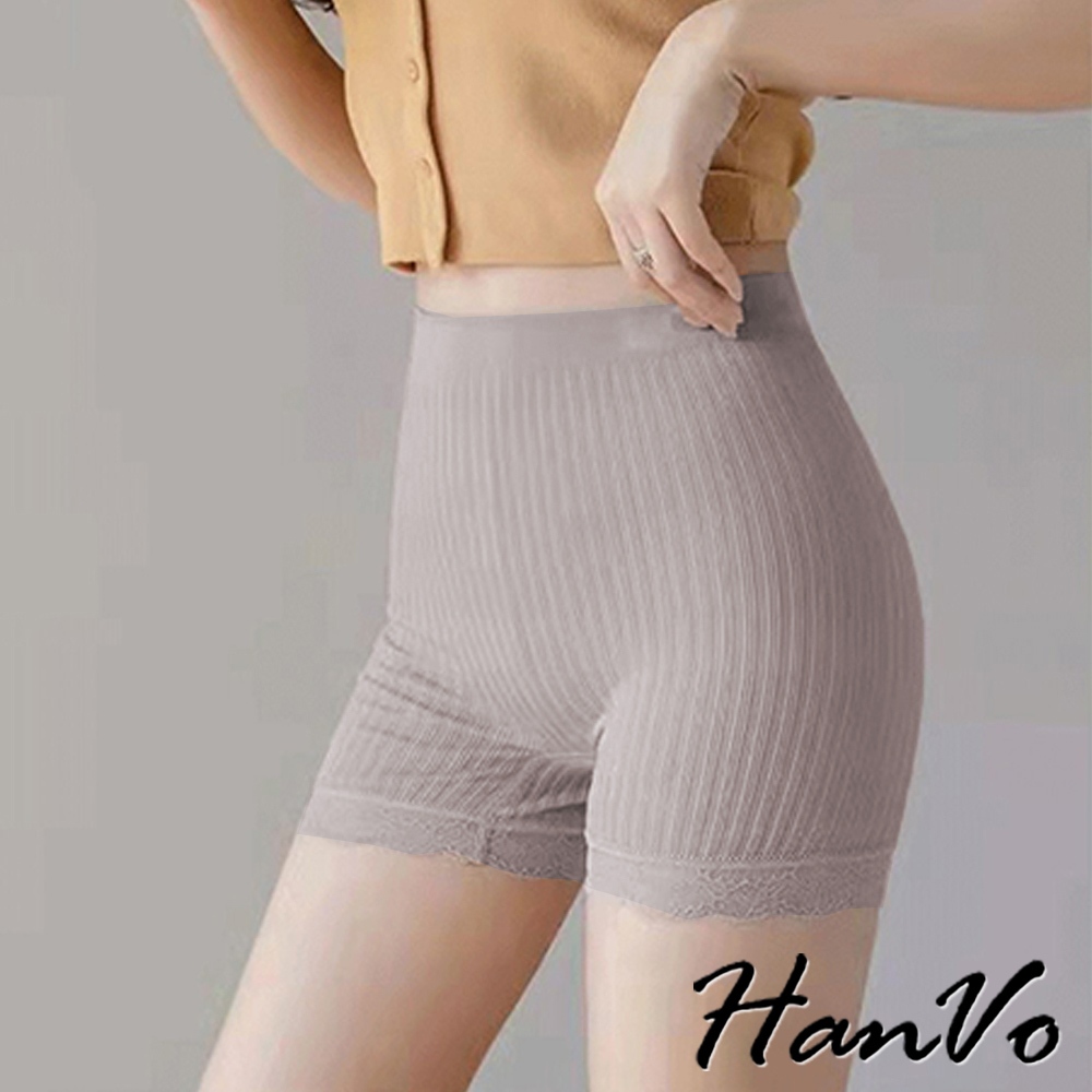 【HanVo】彈力豎條紋蕾絲安全褲 防走光貼身不捲邊 高腰收腹顯瘦 女生下著 A13-2920黑色|灰色|粉色Safety PantsHanVo Wear Collection