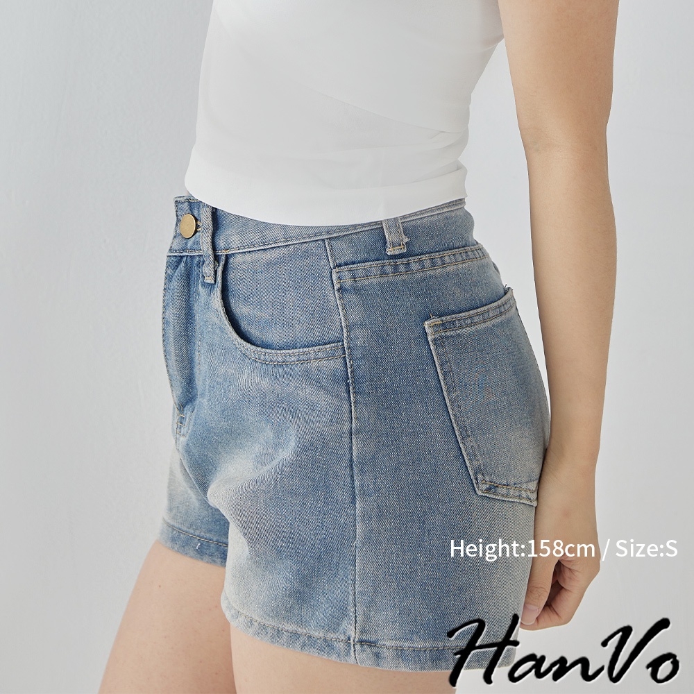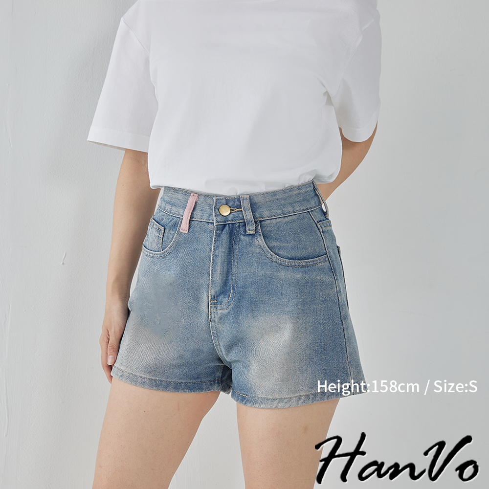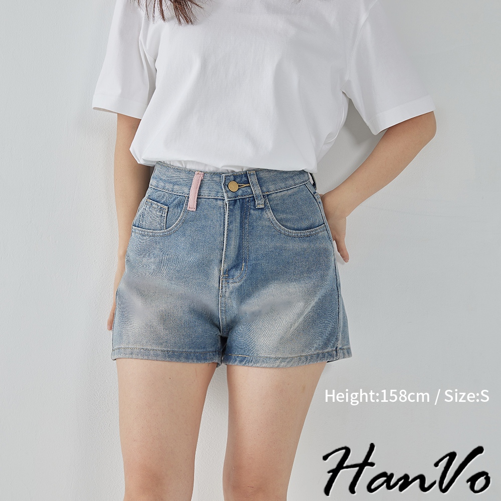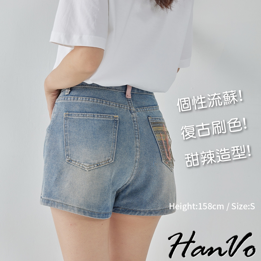 【HanVo】後口袋個性流蘇造型牛仔短褲 甜辣設計感高腰A字褲 韓系女裝 女生下著 A03-2099藍色XL|藍色S|藍色M|藍色LShortsHanVo Wear Collection