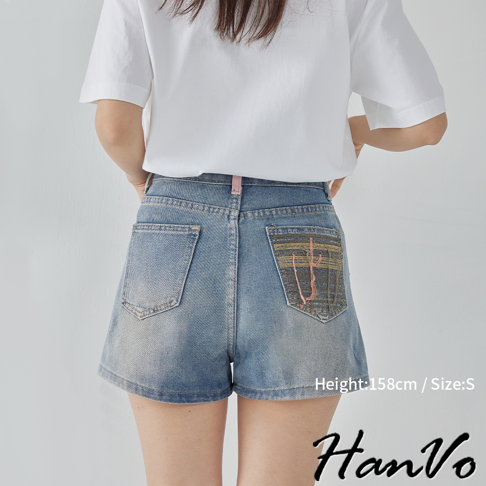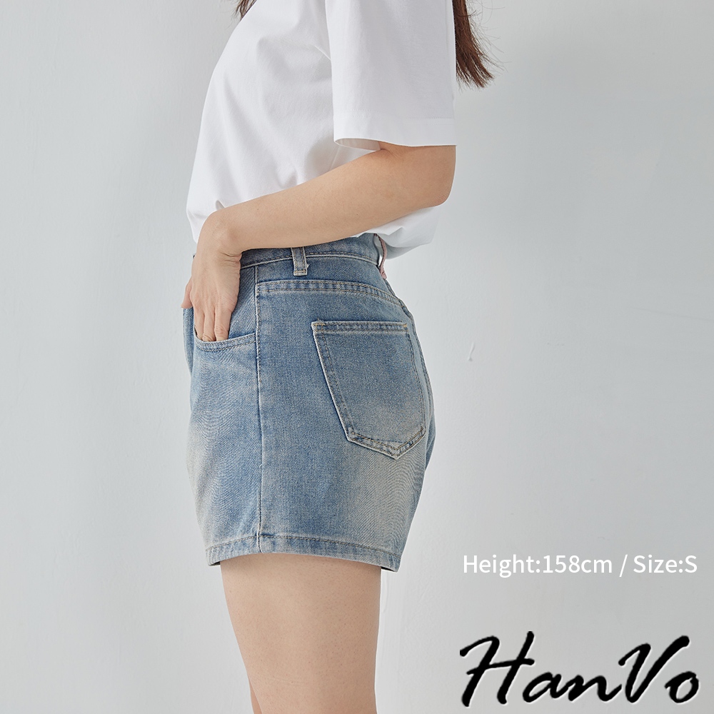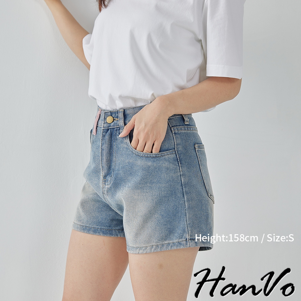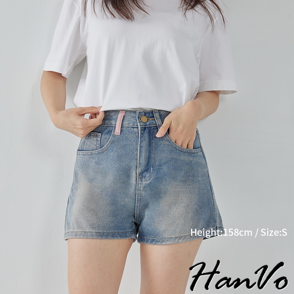 【HanVo】後口袋個性流蘇造型牛仔短褲 甜辣設計感高腰A字褲 韓系女裝 女生下著 A03-2099藍色XL|藍色S|藍色M|藍色LShortsHanVo Wear Collection
