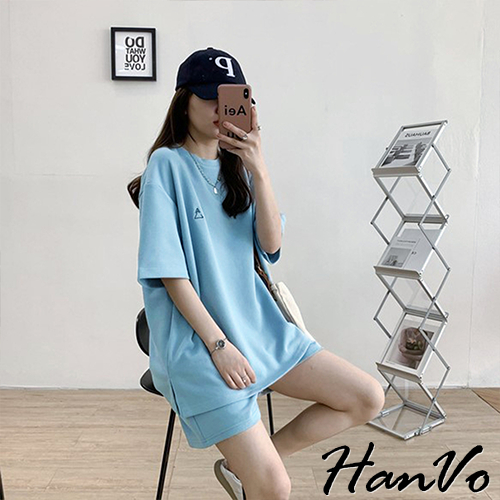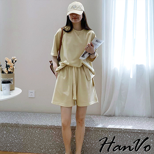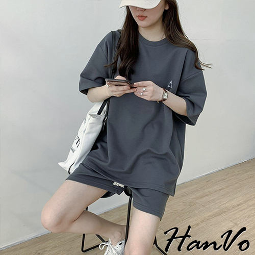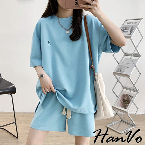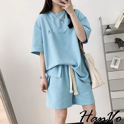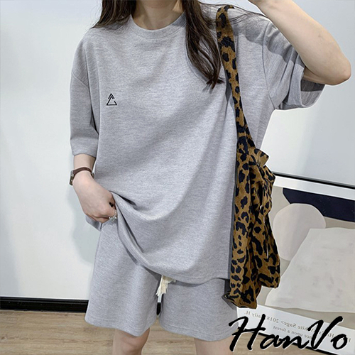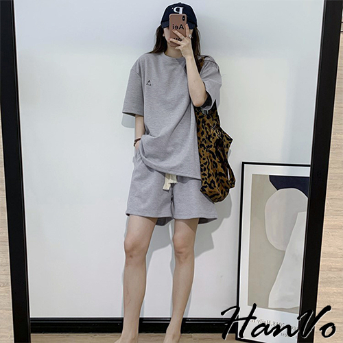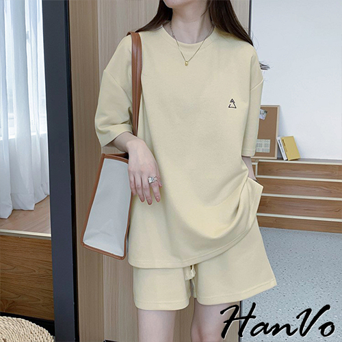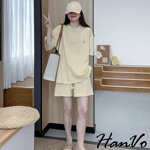 【HanVo】一套出遊!小三角刺繡兩件休閒套裝 休閒圓領舒適短袖短褲套裝 日常百搭 女生衣著 A08-5940雲霧灰|奶油黃|晴空藍|炭灰色Individual SetsHanVo Wear Collection