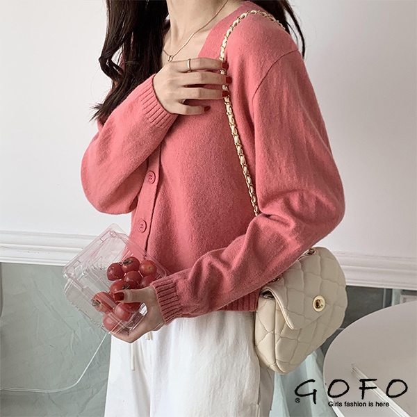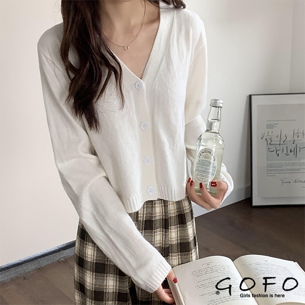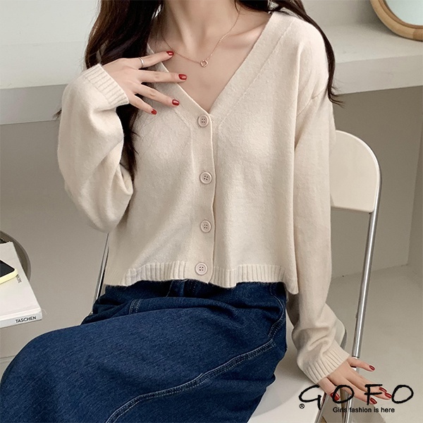 GOFO 針織外套 韓系顯瘦 性感V領 短版毛衣外套 短腰外套 女生上衣 女生衣著 秋季服飾 秋天 冬天女裝粉色|黃色|咖啡|杏色|黑色|白色GOFO 台灣賣家 台灣出貨 台灣現貨