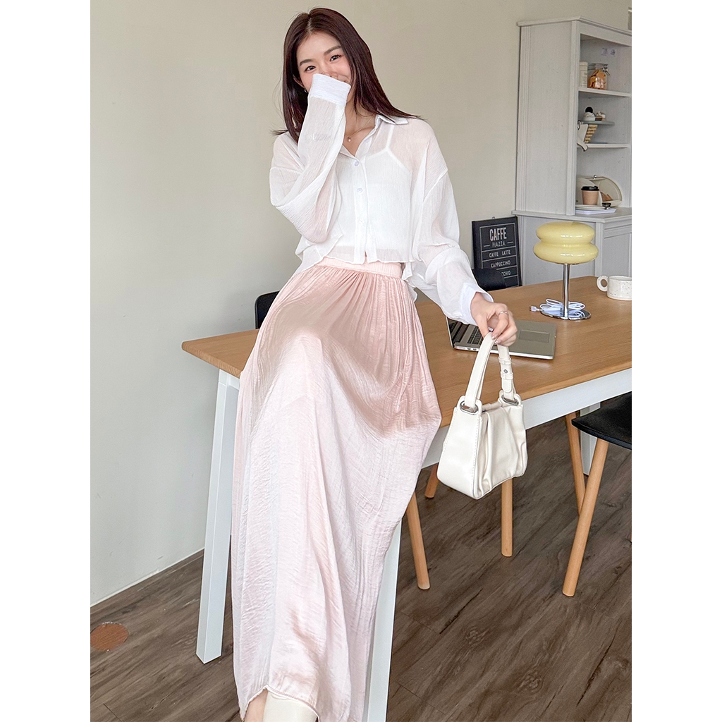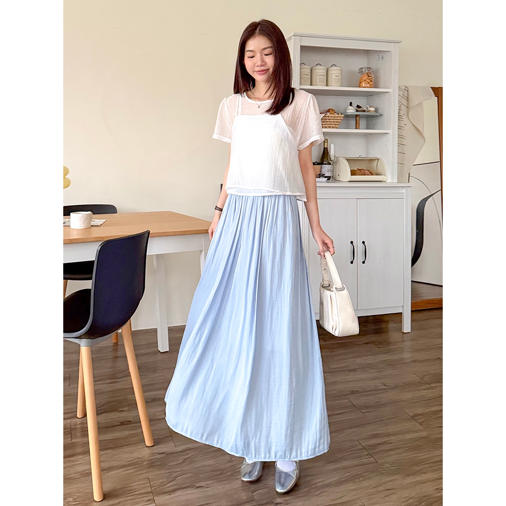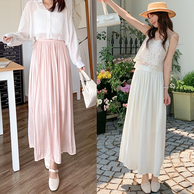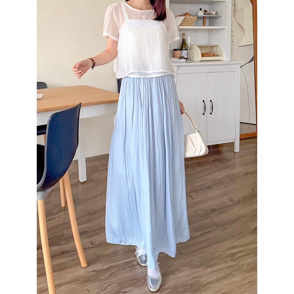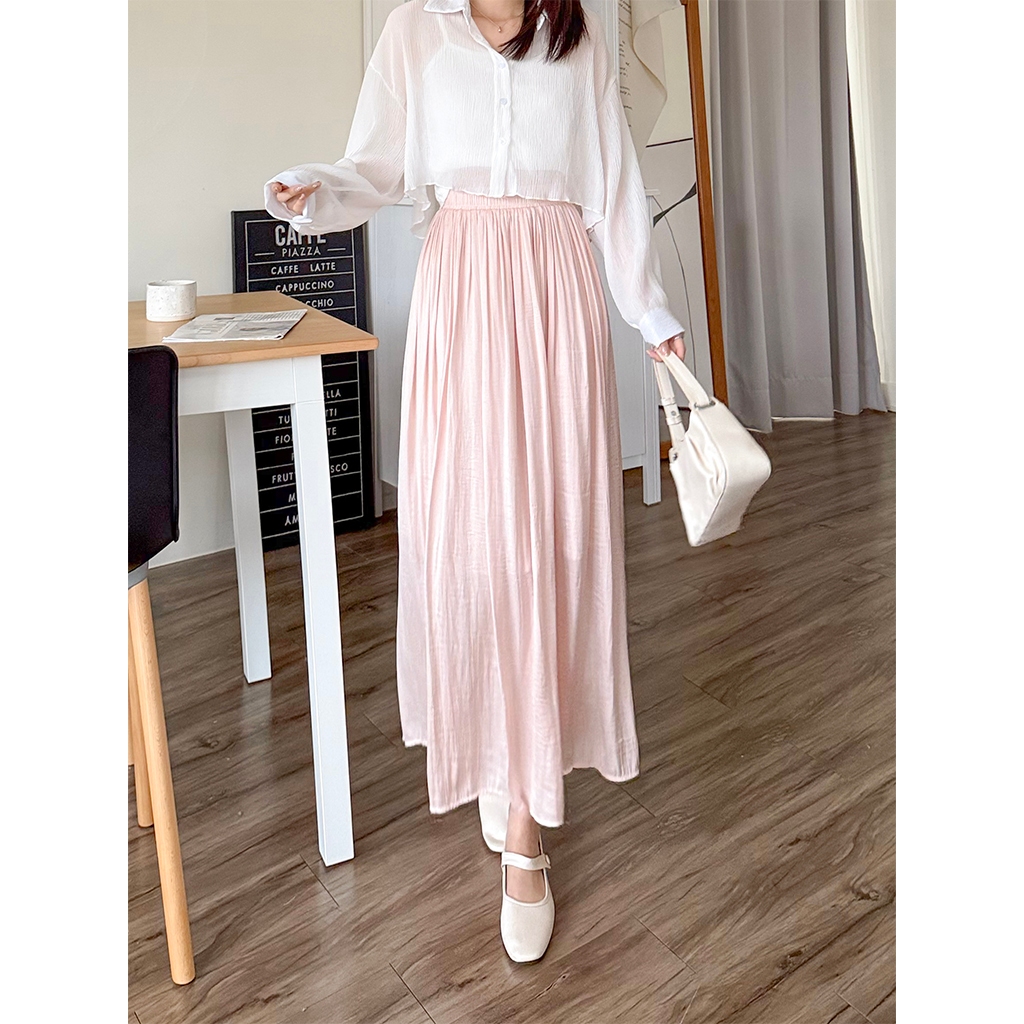【HARPER】輕盈涼感壓褶長裙 有內裏 | 現貨 中長裙 裙子 涼感【SKE33216J】米杏,F|柔和桃,F|冰晶藍,FHARPER