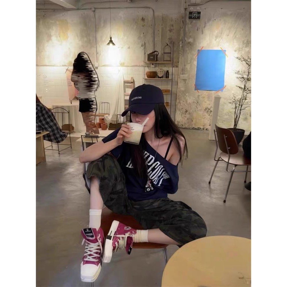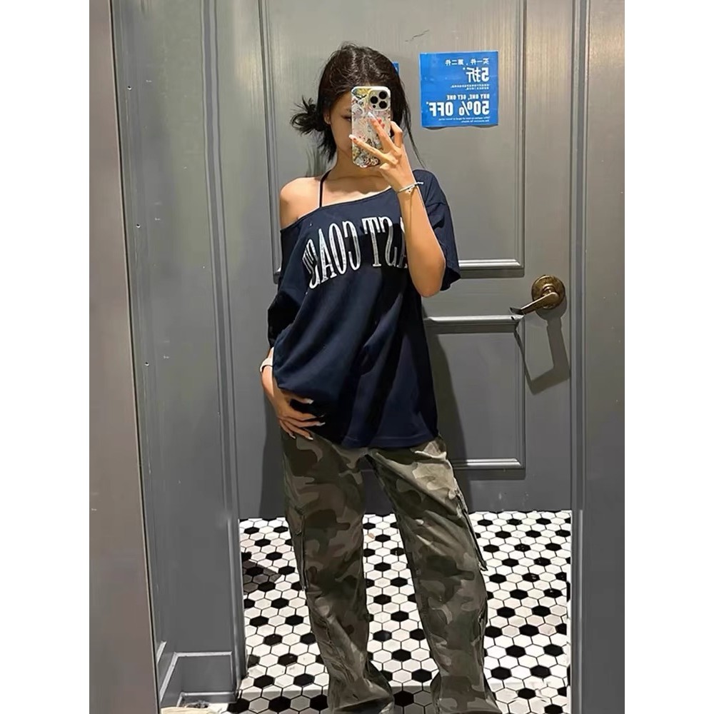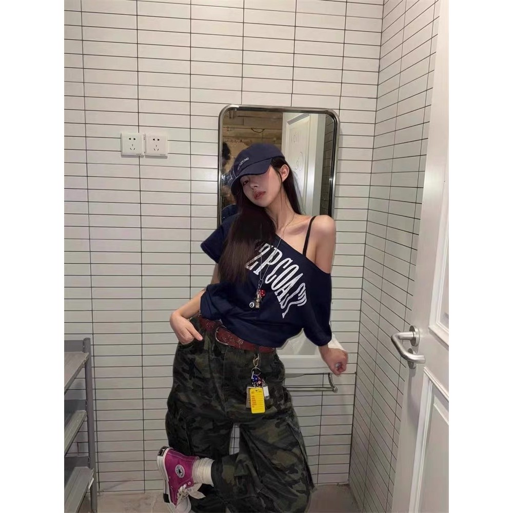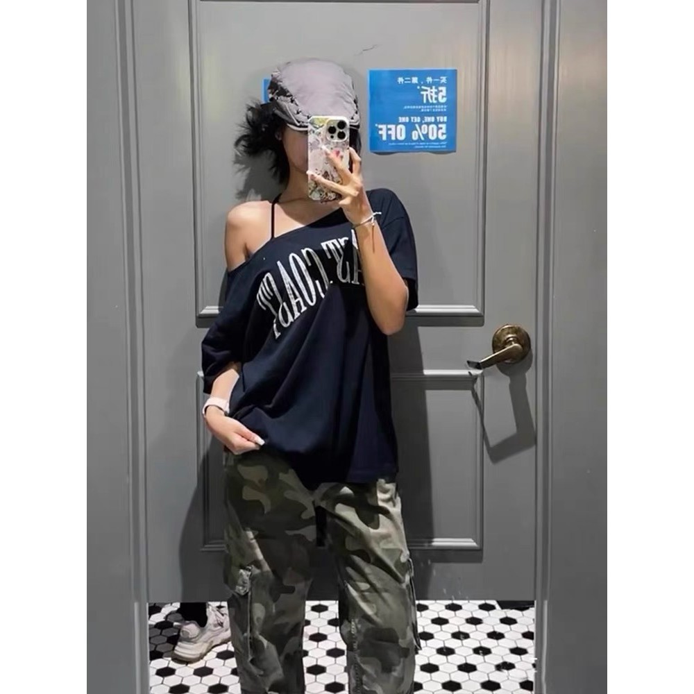 【HOT 本舖】 原版面料冰瓷棉32支純棉拉架200克95棉5氨綸滑斜露肩短袖T恤女藏青色,S|藏青色,M|藏青色,L|藏青色,XL|藏青色,2XLT-shirtsHOT本舖|女裝館