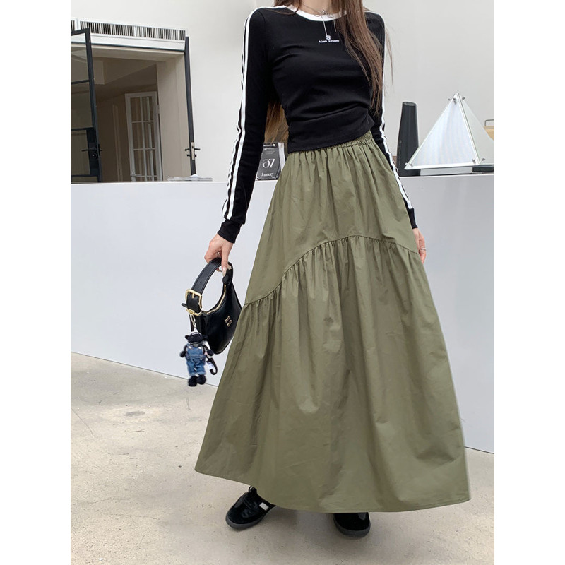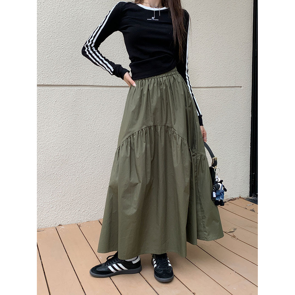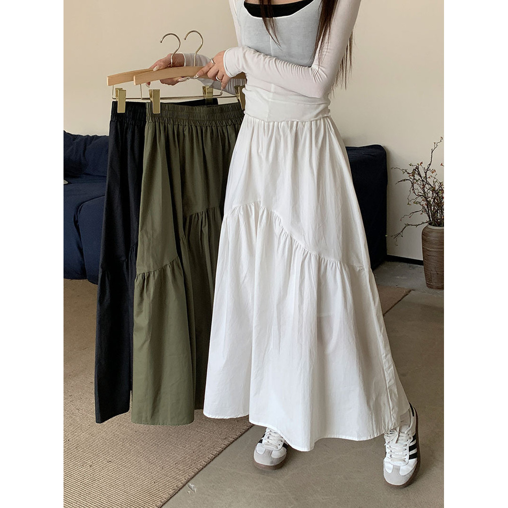 【HOT 本舖】 實拍~2023秋季新款韓版鬆緊腰時尚設計感褶皺拼接長裙女潮軍綠色,S|軍綠色,M|軍綠色,L|黑色,S|黑色,M|黑色,L|白色,S|白色,M|白色,LHOT本舖|女裝館