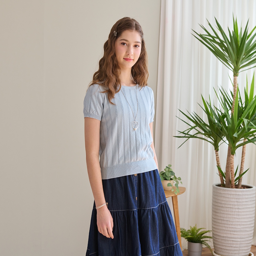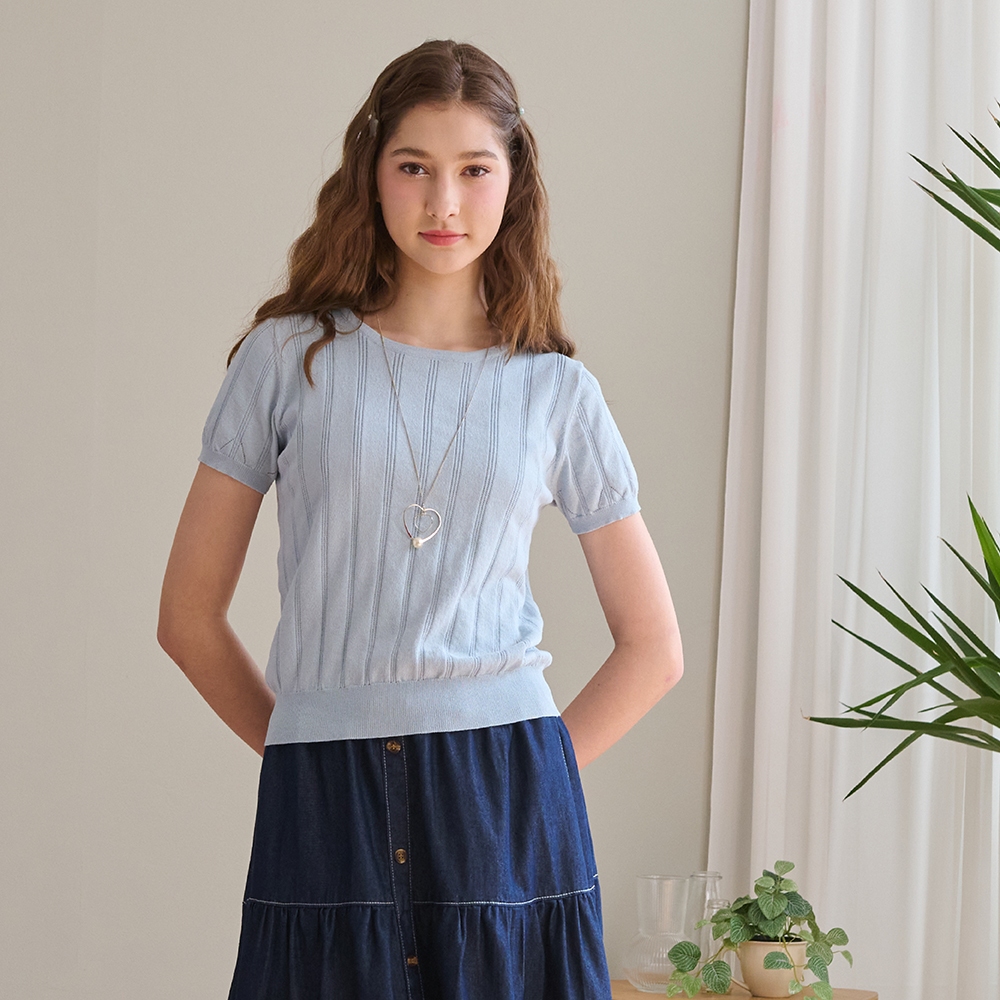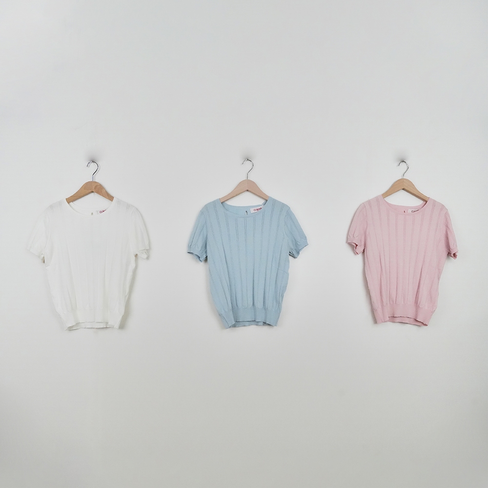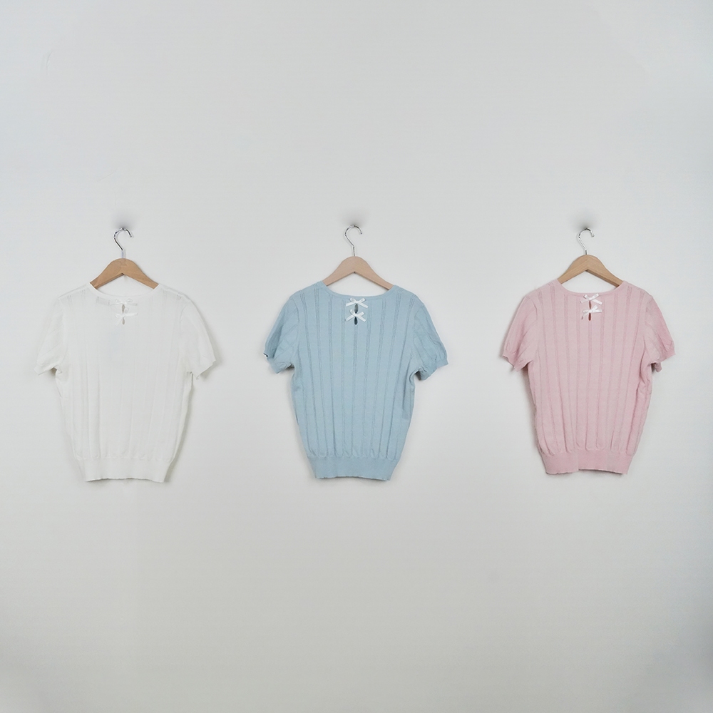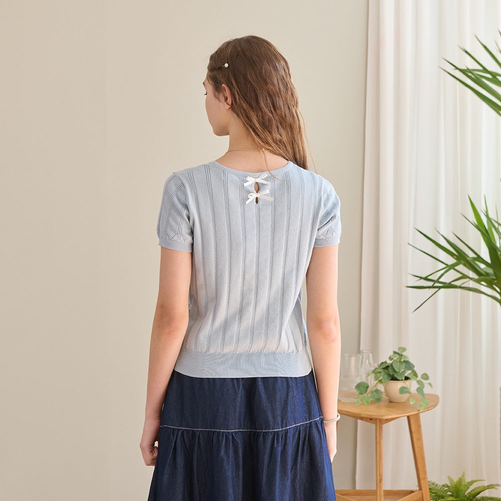 【CUMAR】涼感紗坑條後領開孔裝飾蝴蝶結針織衫 藍 白 粉(魅力商品)藍/F|白/F|粉/FINLook 流行女裝品牌旗艦店