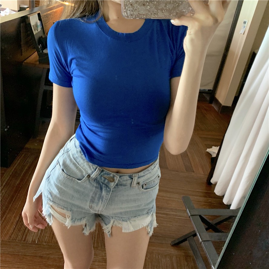 短袖T 短版上衣 短袖上衣 修身顯瘦露臍短袖修身短款T恤 012198黑|白|灰|杏|紅|寶藍|深藍T-shirtsLeenaSui ~台灣賣家 隔日到貨