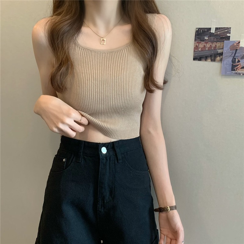 針織性感背心 短版上衣 女生大U領上衣小可愛 無袖背心 美式短款露臍內搭吊帶針織上衣 022256