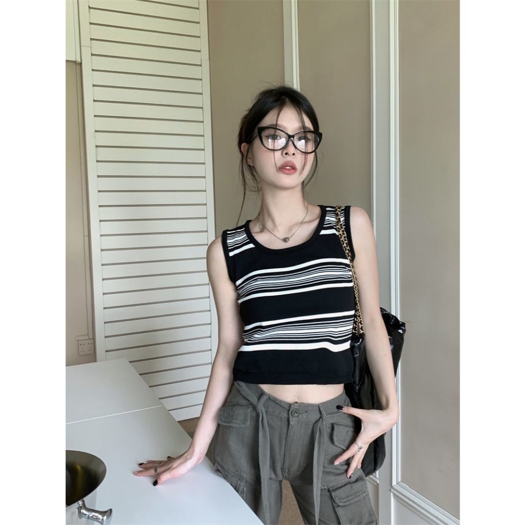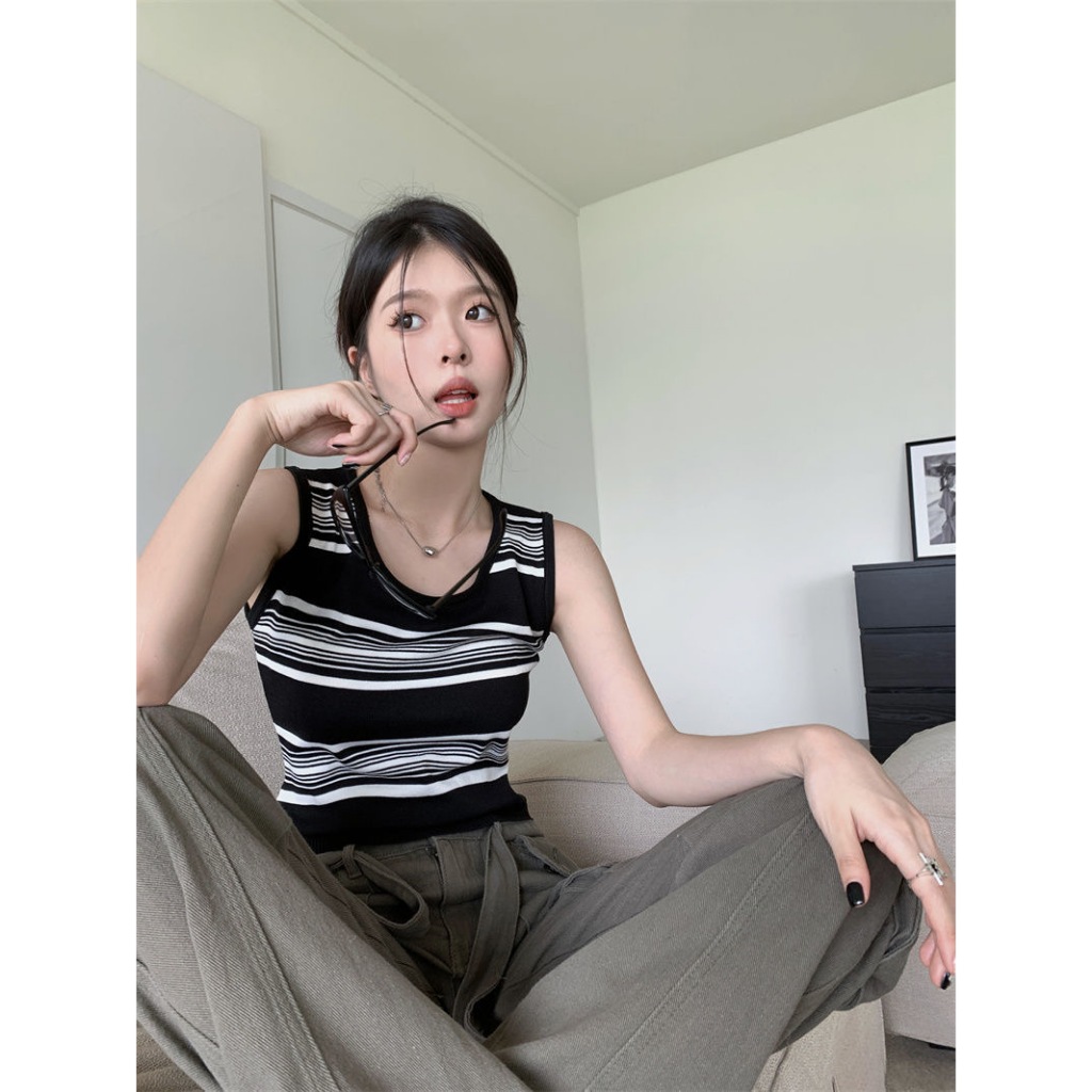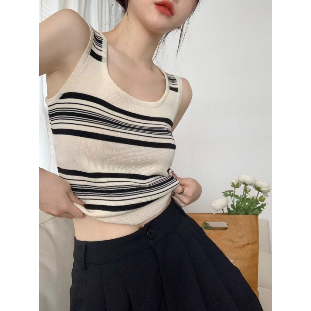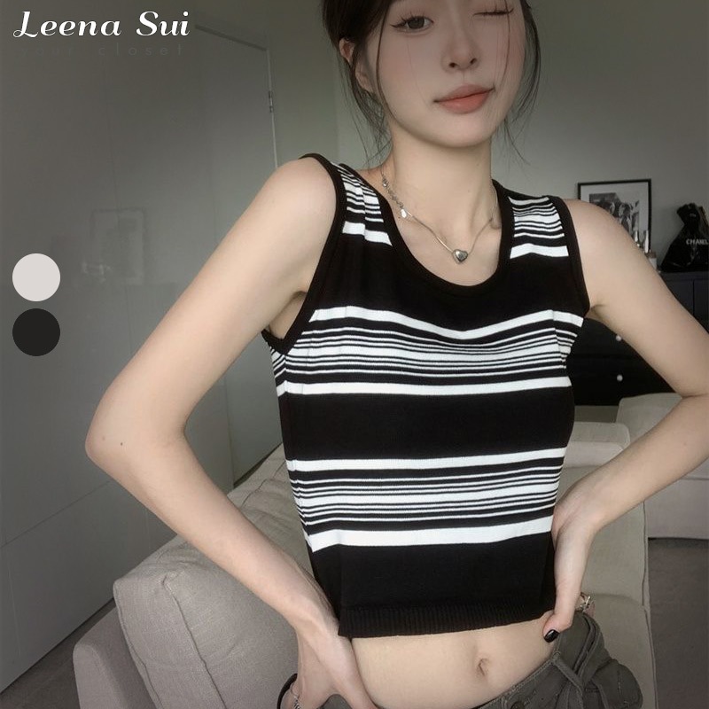 短版上衣 撞色條紋吊帶背心 無袖背心 內搭針織無袖外穿無袖上衣 024753黑|杏Tanks & CamisolesLeenaSui ~台灣賣家 隔日到貨