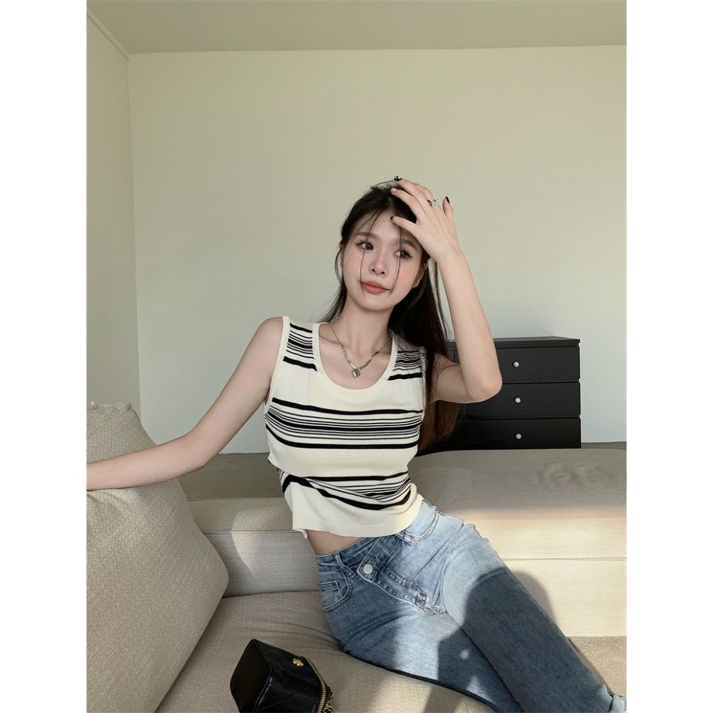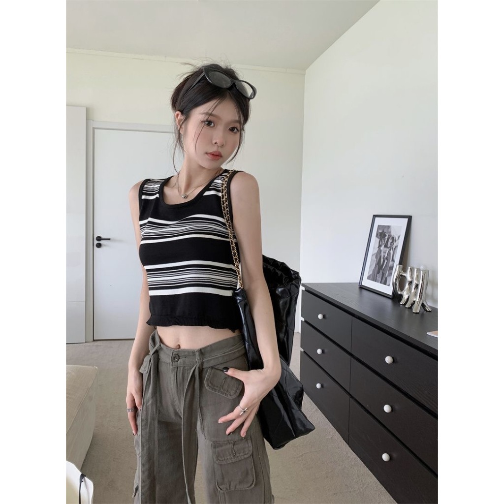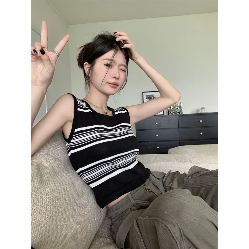 • 短版上衣 撞色條紋吊帶背心 無袖背心 內搭針織無袖外穿無袖上衣 024753