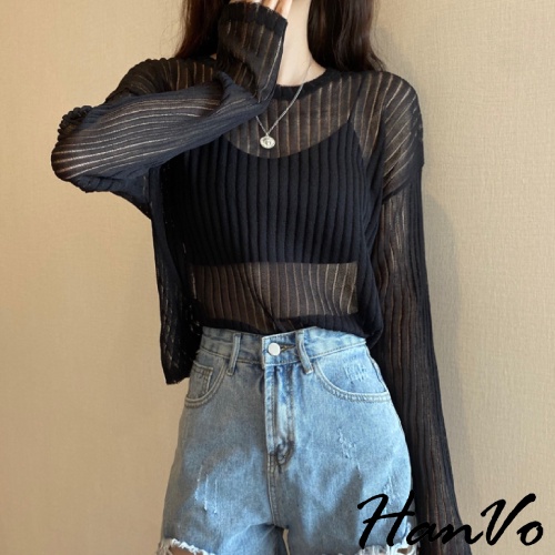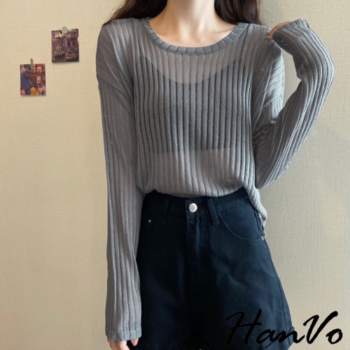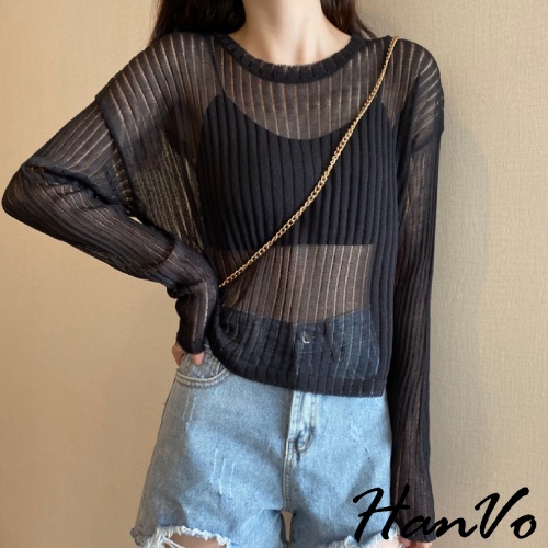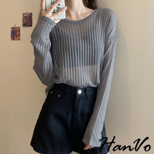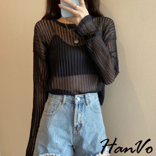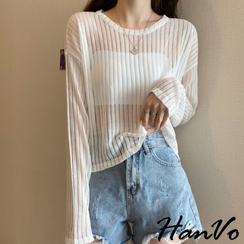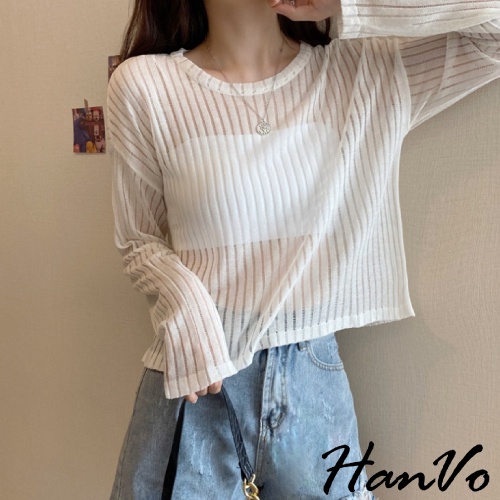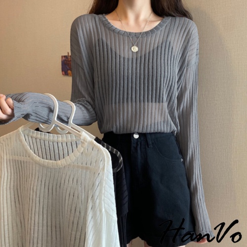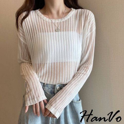 【HanVo】唯美透膚直紋針織短版上衣 甜美百搭針織上衣 寬鬆休閒涼感透膚上衣 女生衣著 A02-1627黑色|白色|灰色HanVo Wear Collection