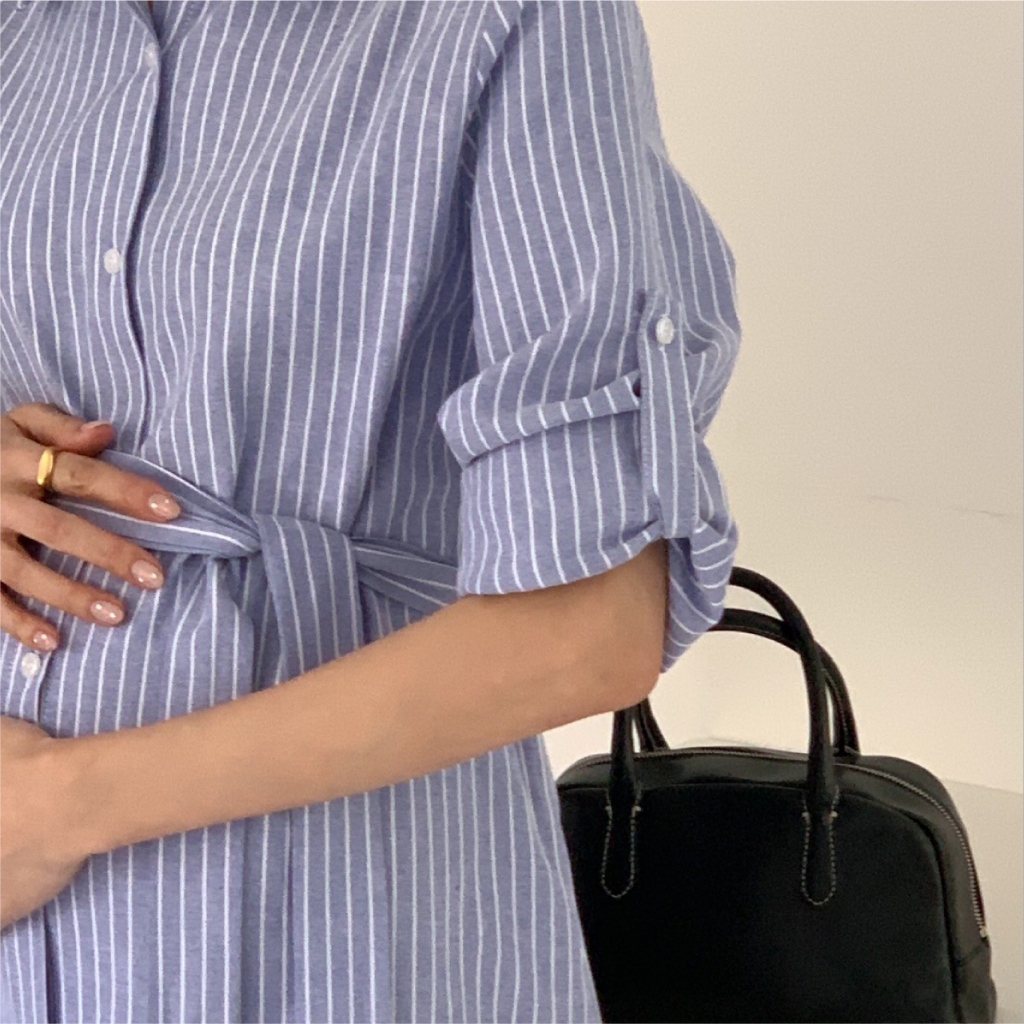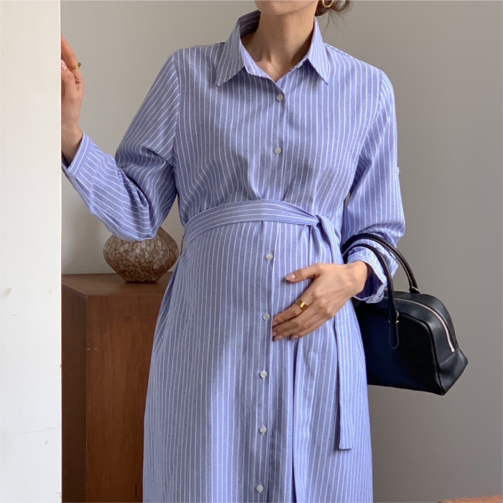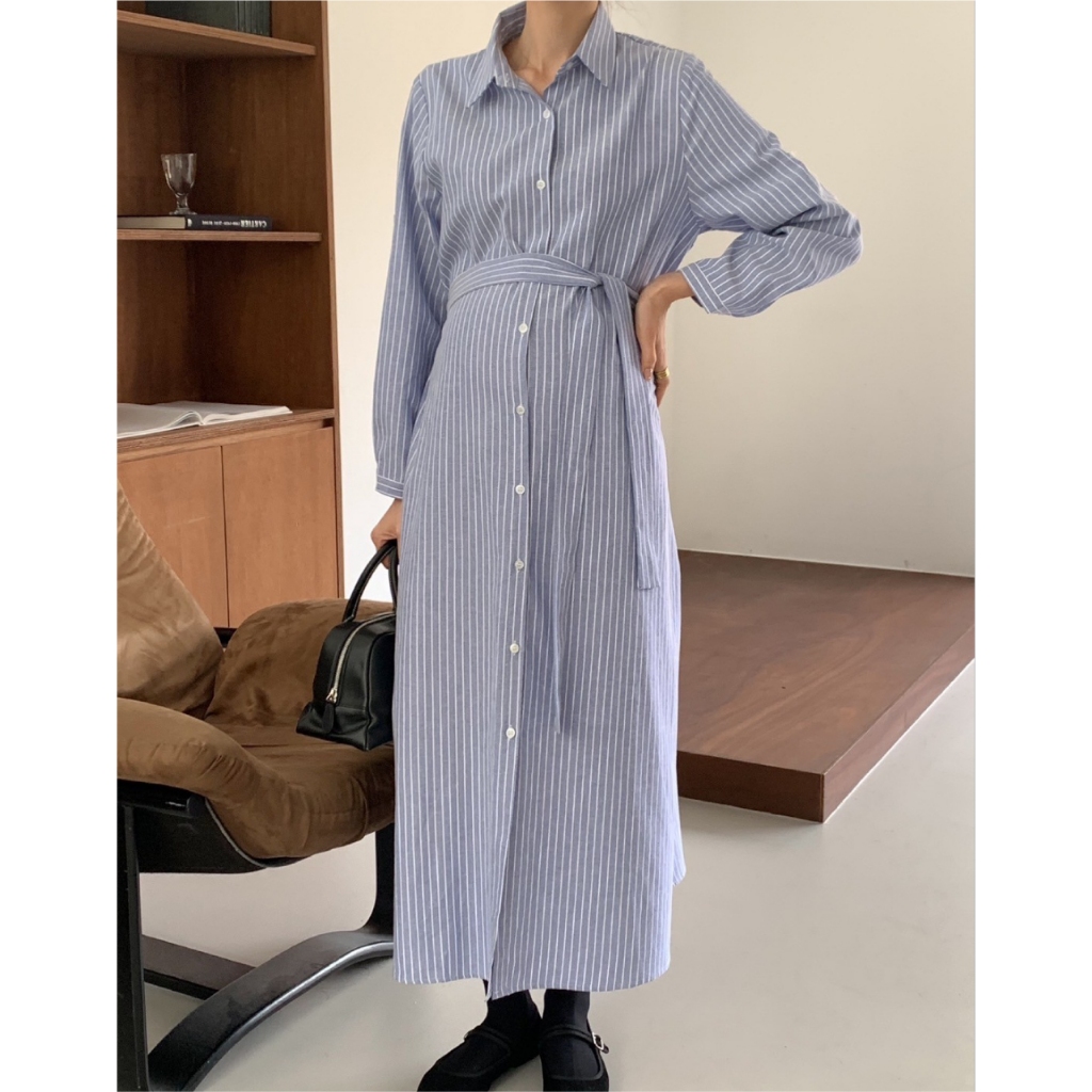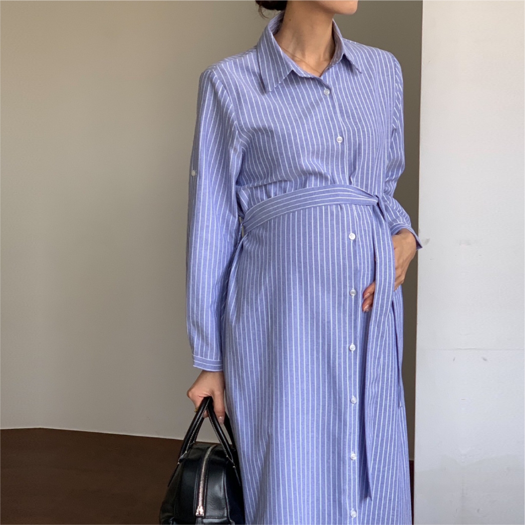 Mamamia孕婦裝 精緻女孩直條紋襯衫哺乳洋裝 正韓製 哺乳衣 孕婦洋裝 孕婦裝 孕婦裙 哺乳洋裝 [A1923]藍|杏Breastfeeding WearMamamia孕婦裝