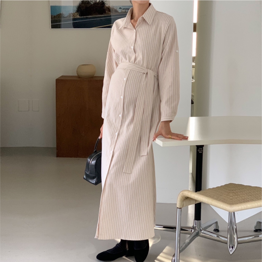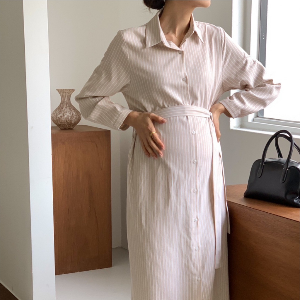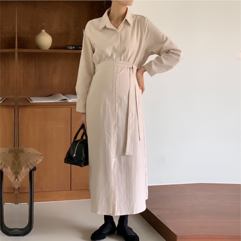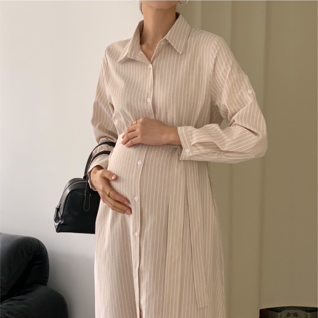Mamamia孕婦裝 精緻女孩直條紋襯衫哺乳洋裝 正韓製 哺乳衣 孕婦洋裝 孕婦裝 孕婦裙 哺乳洋裝 [A1923]藍|杏Breastfeeding WearMamamia孕婦裝