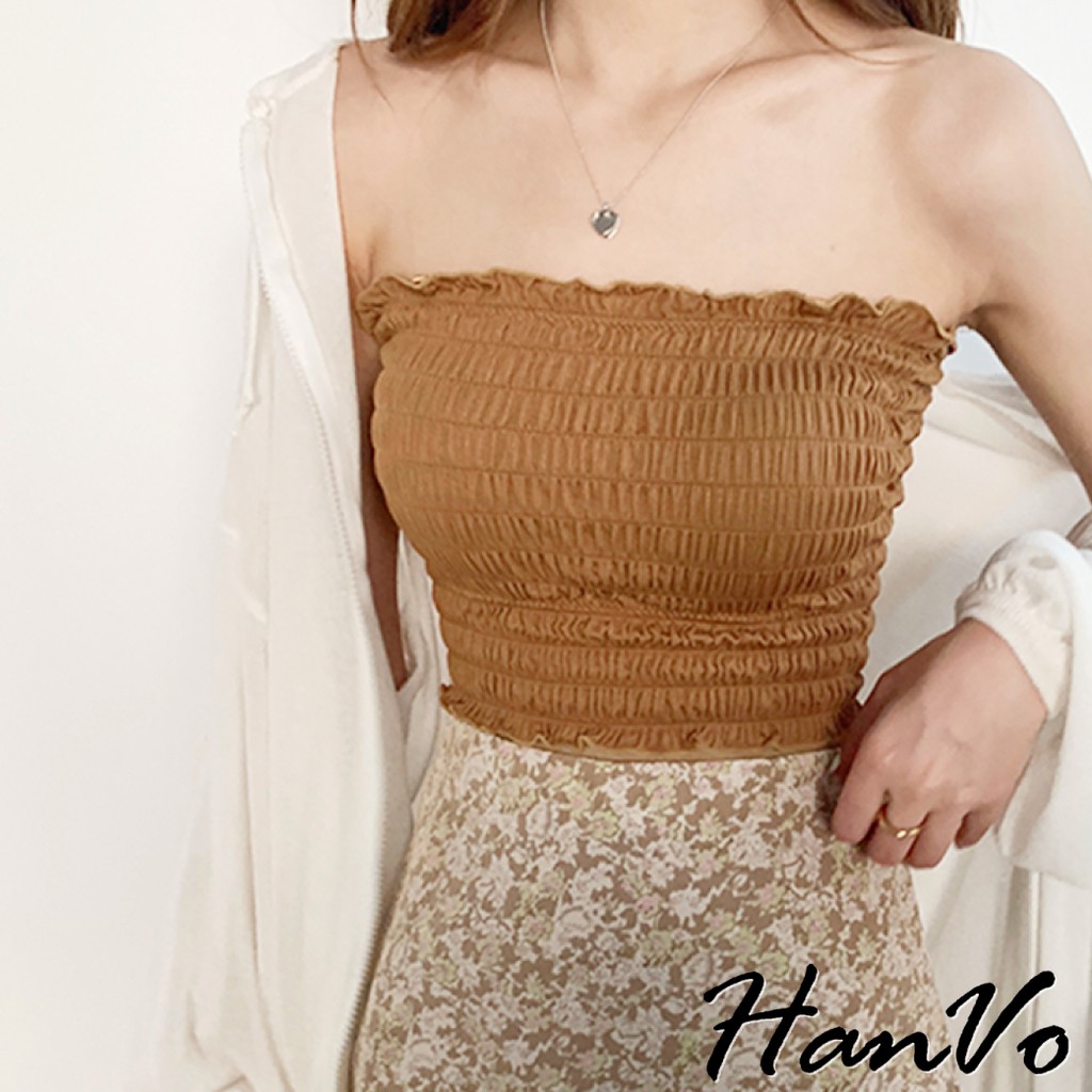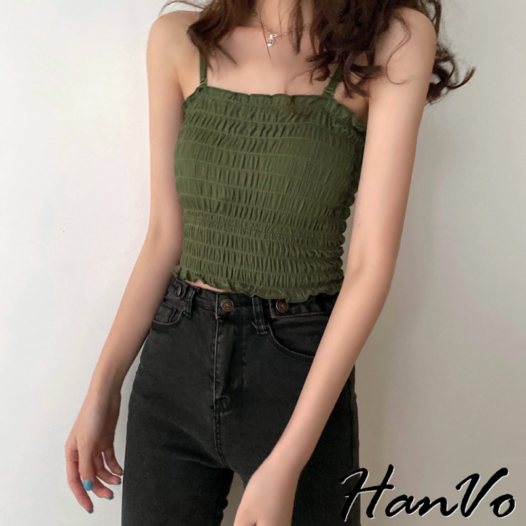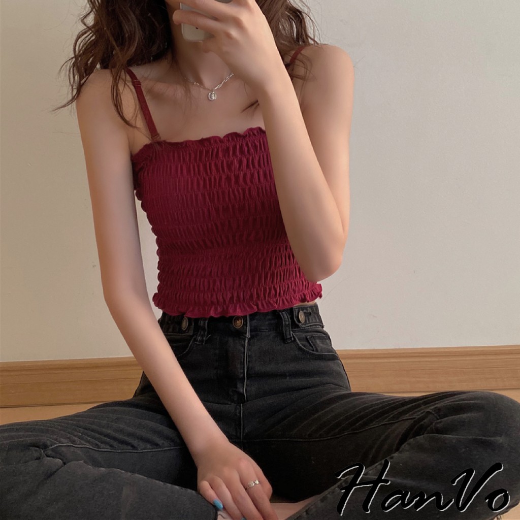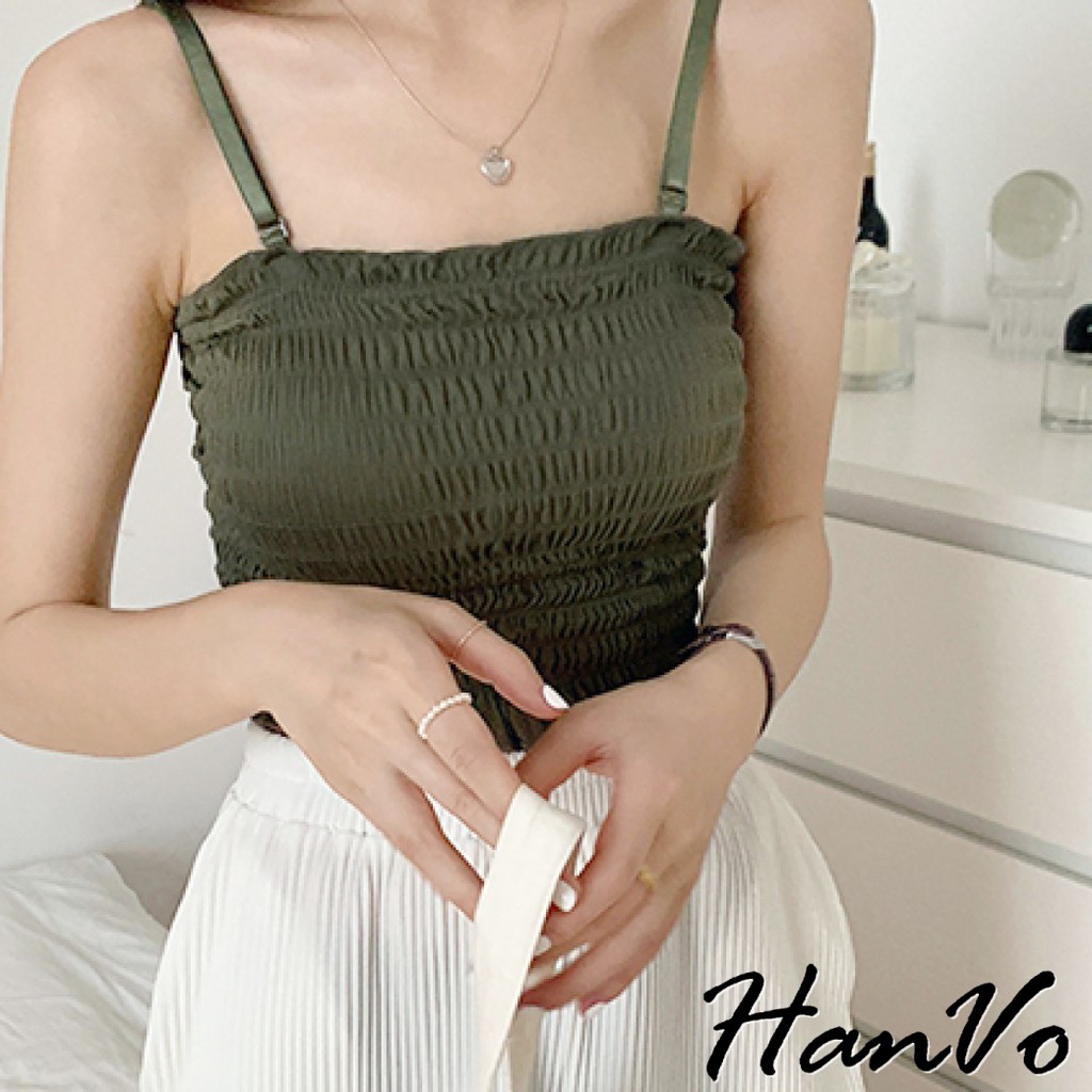 【HanVo】純色百搭木耳邊平口背心 多色皺褶細肩帶小可愛 附可拆式胸墊 吊帶平口打底內搭 女生上衣 A09-5030白色|酒紅|卡其|綠色|黑色Tube TopsHanVo Wear Collection