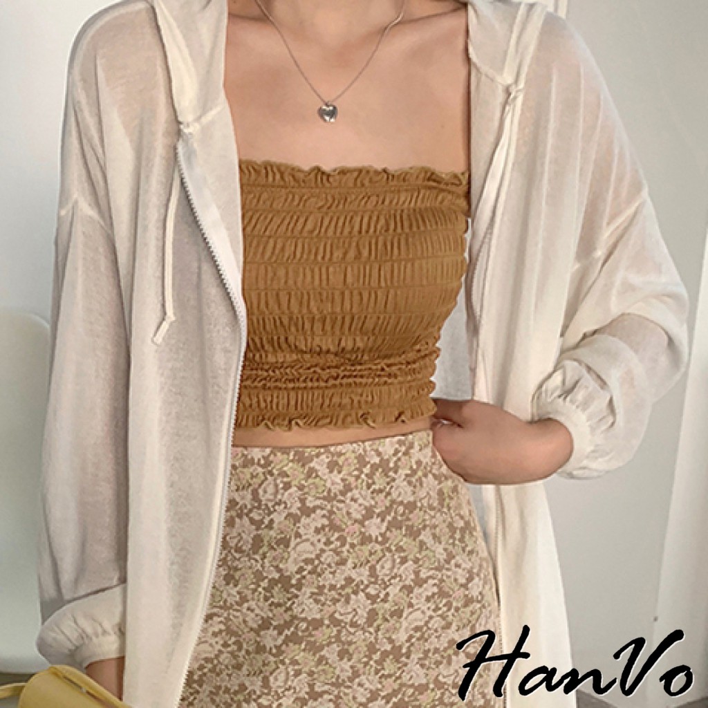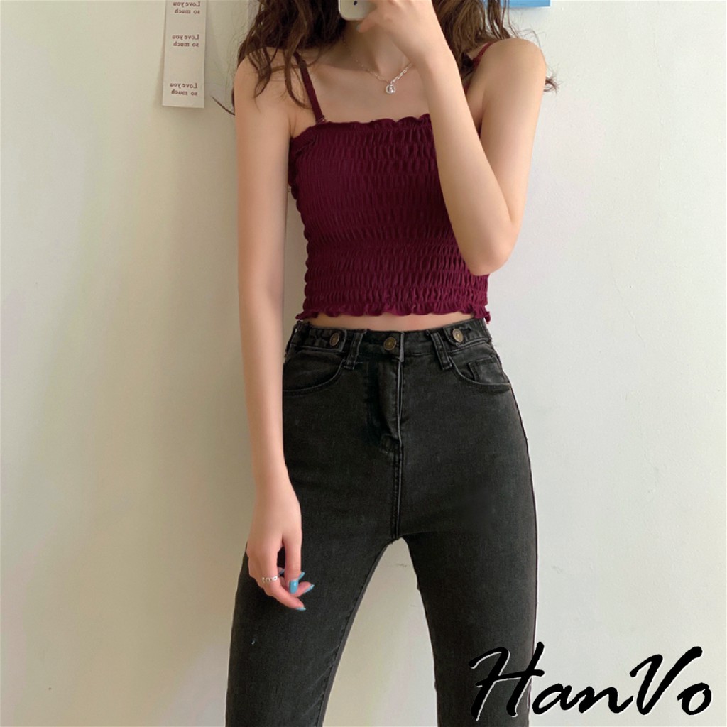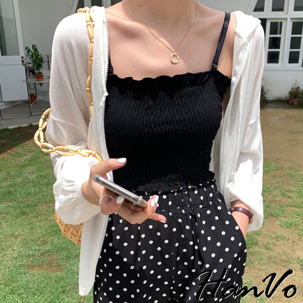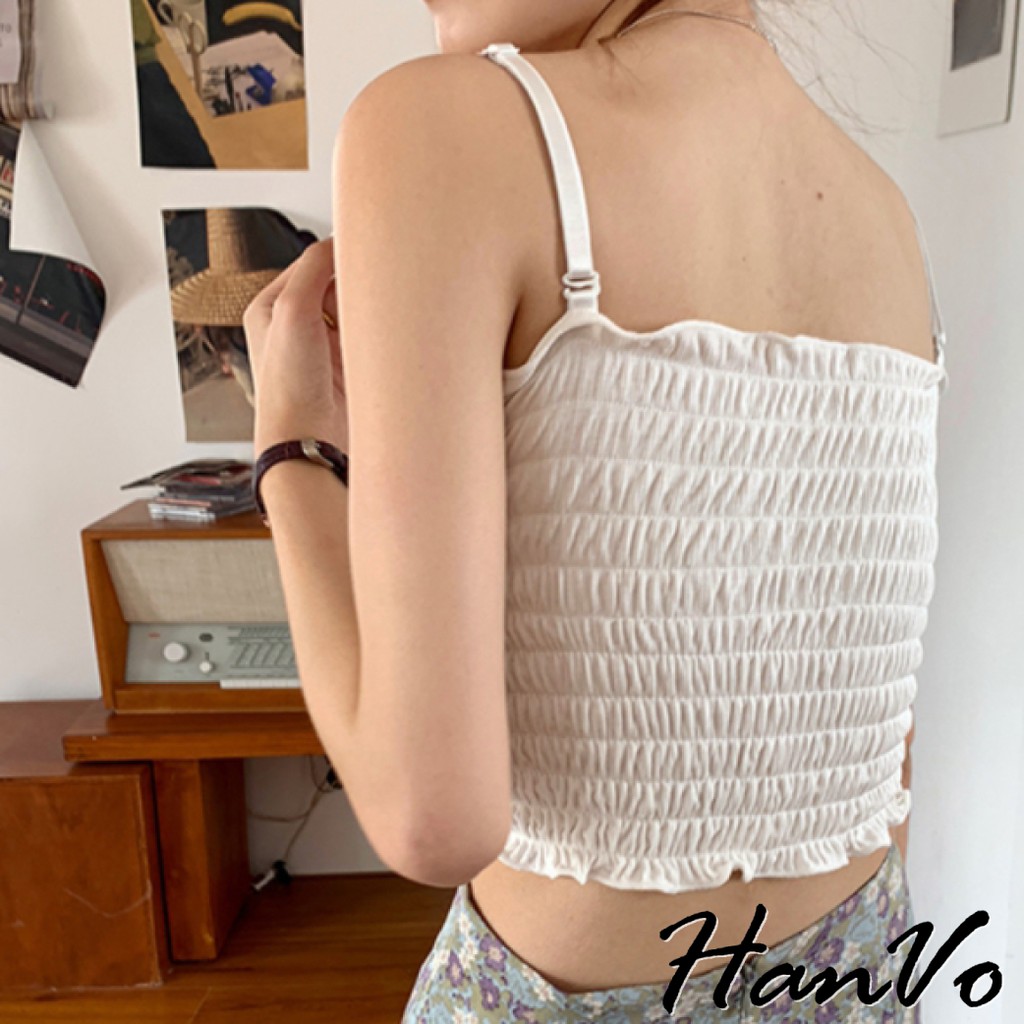 【HanVo】純色百搭木耳邊平口背心 多色皺褶細肩帶小可愛 附可拆式胸墊 吊帶平口打底內搭 女生上衣 A09-5030白色|酒紅|卡其|綠色|黑色Tube TopsHanVo Wear Collection