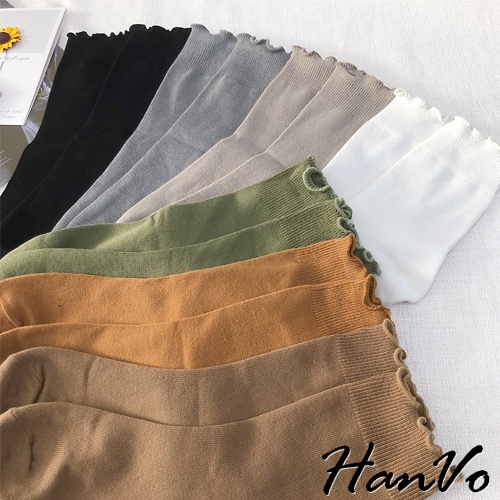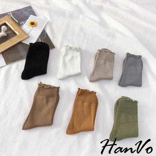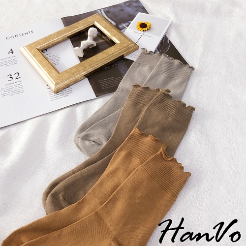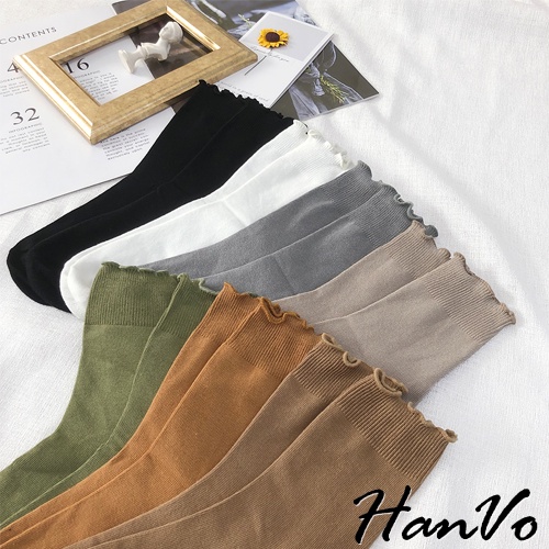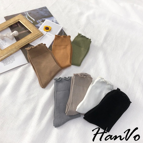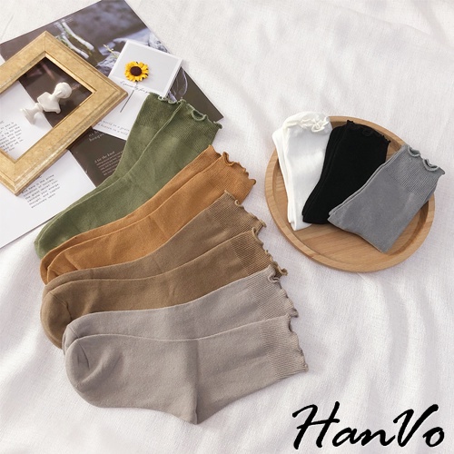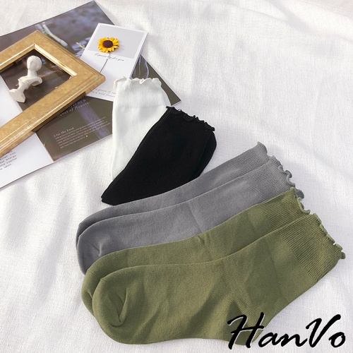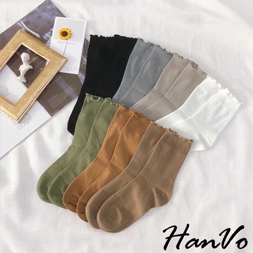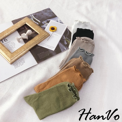【HanVo】純色木耳邊堆堆中筒襪 韓國潮流時尚休閒襪 韓系簡約百搭舒適棉質襪 中筒襪 女襪 女生配件 A12-6082燕麥灰|抹茶綠|霧藍灰|核桃咖|日落橘|黑色|白色SocksHanVo Wear Collection