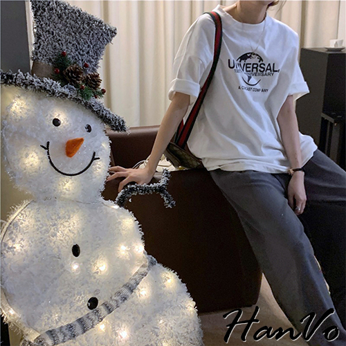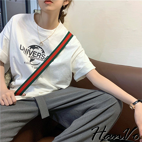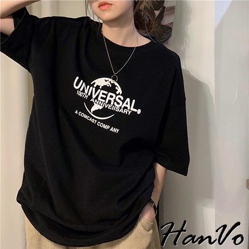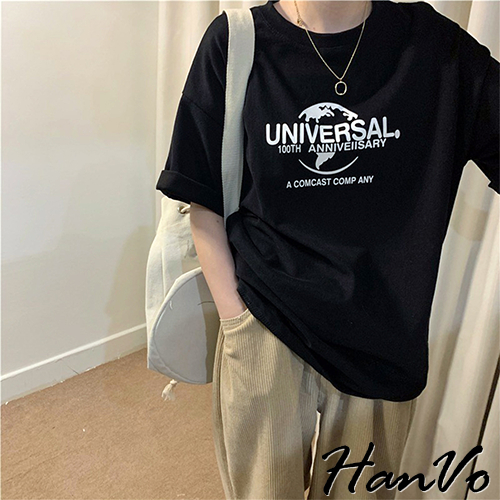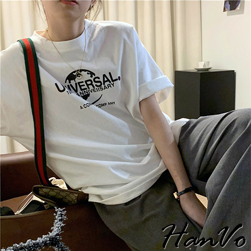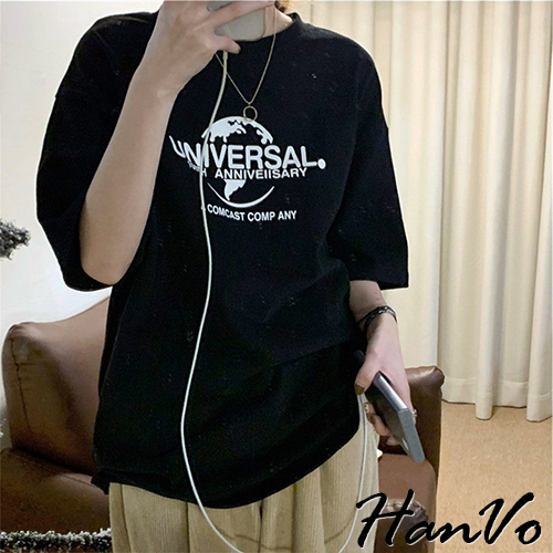 【HanVo】UNIVERSAL.100th印花T恤 韓版短袖上衣 韓系韓國女裝 百搭寬鬆 女生衣著 A01-1443白色|黑色T-shirtsHanVo Wear Collection