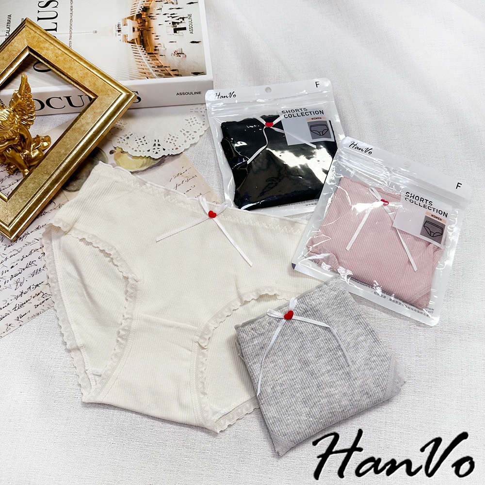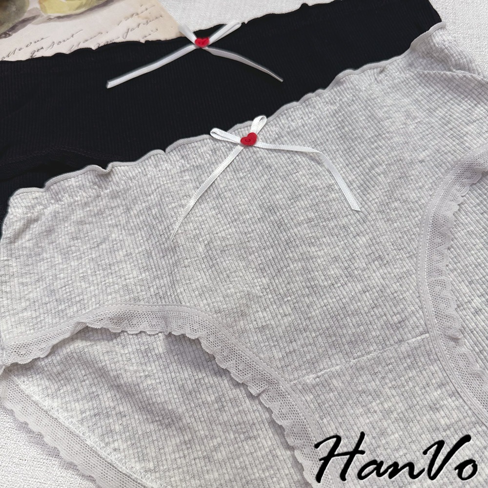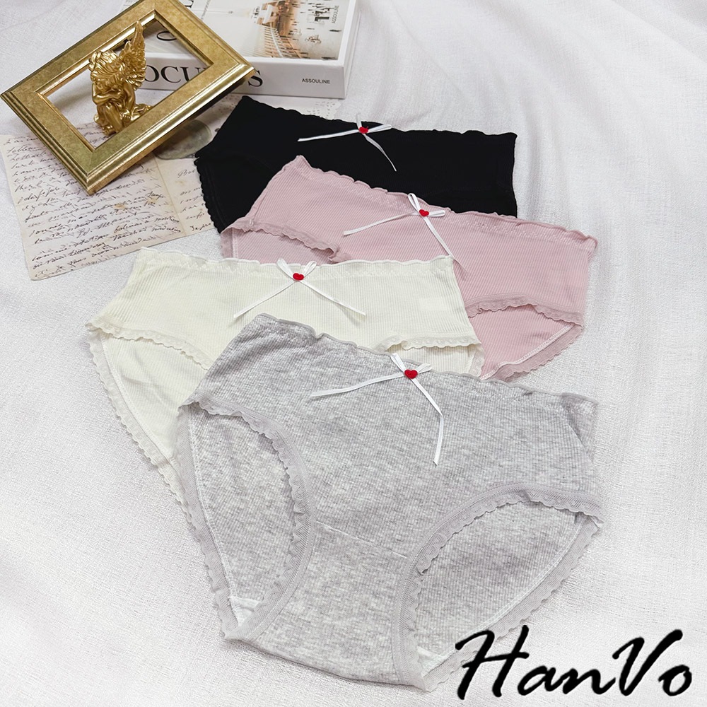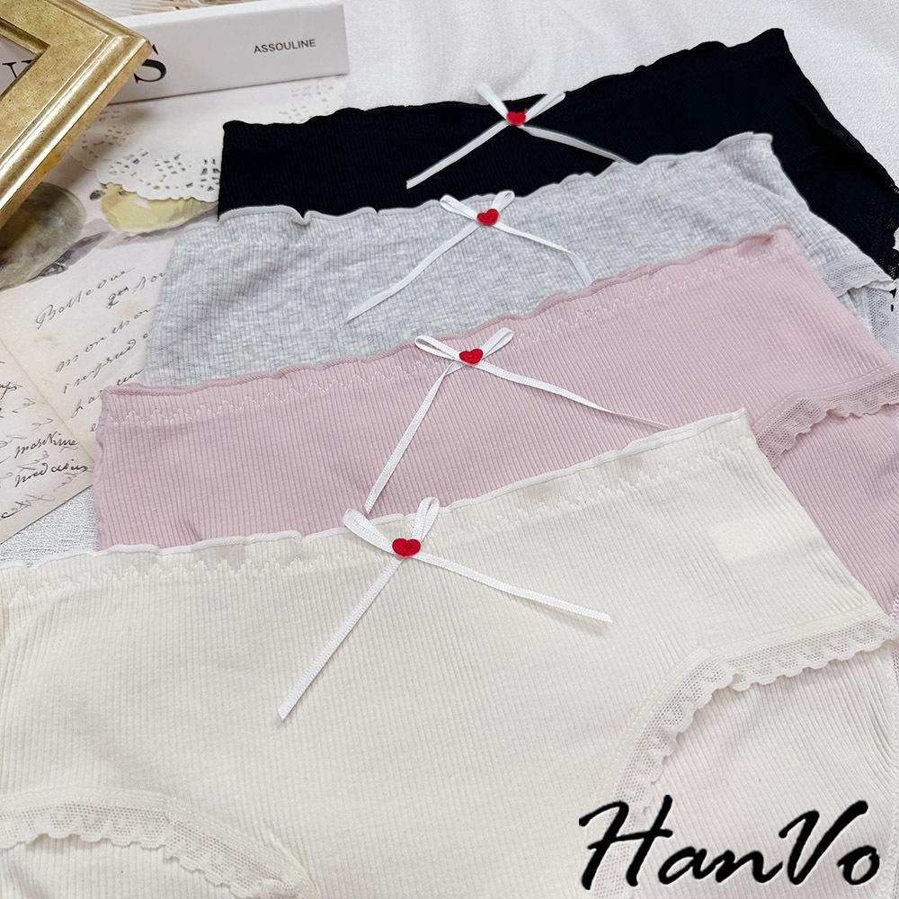 【HanVo】小紅愛心蝴蝶結螺紋內褲 柔軟透氣純棉中腰 舒適親膚三角褲 獨立包裝 流行少女內褲 內著 A11-5727奶油杏|夜幕黑|少女粉|雲霧灰PantiesHanVo Wear Collection