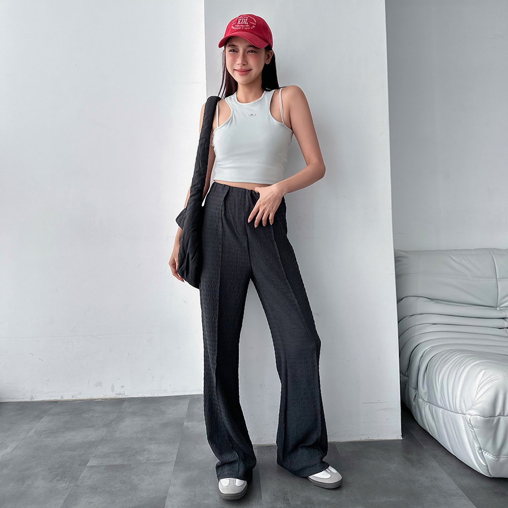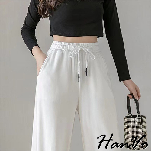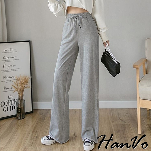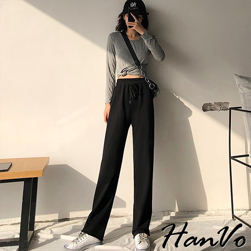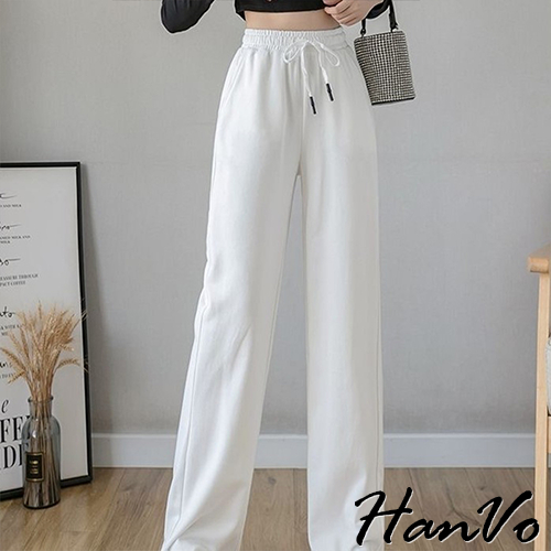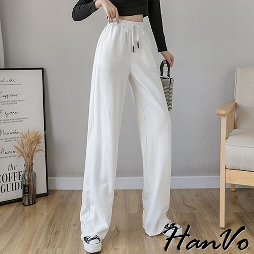 【HanVo】高腰垂墜感拖地抽繩休閒寬褲 高挑顯瘦鬆緊 直筒褲 休閒時尚百搭 長褲 女生衣著 A04-2602黑色|白色|灰色PantsHanVo Wear Collection