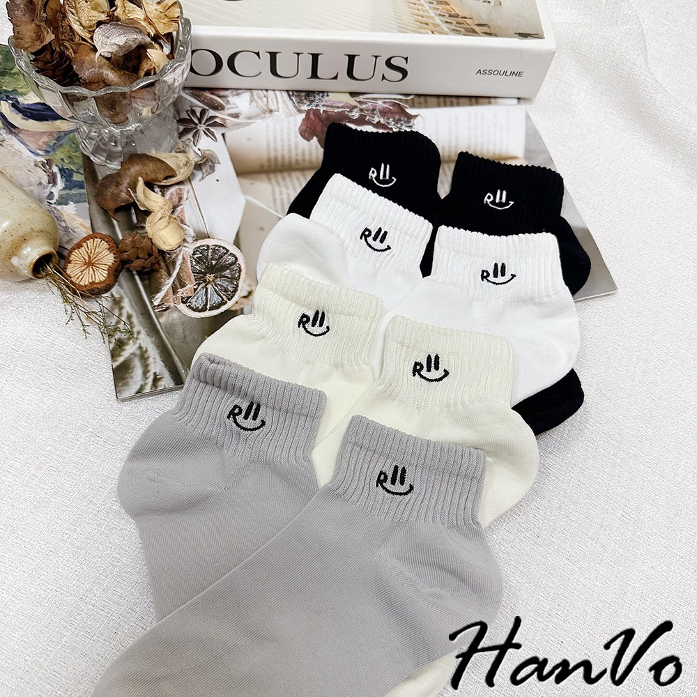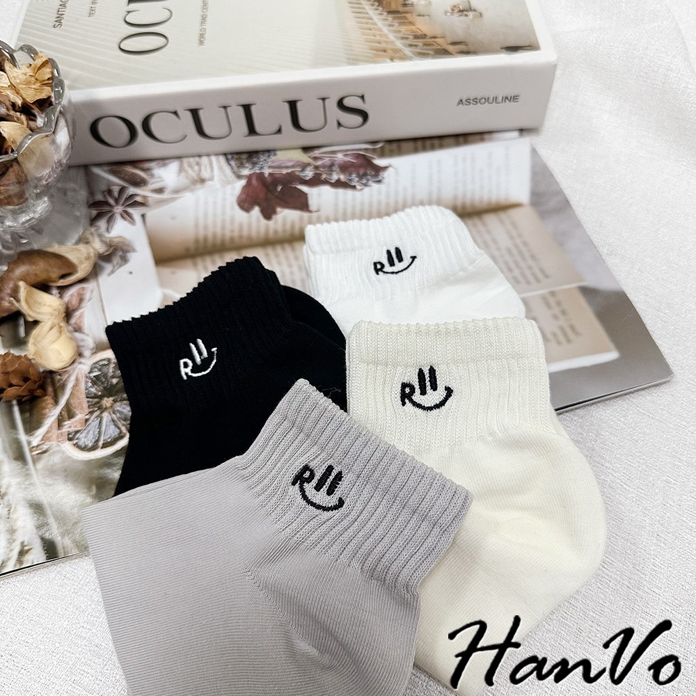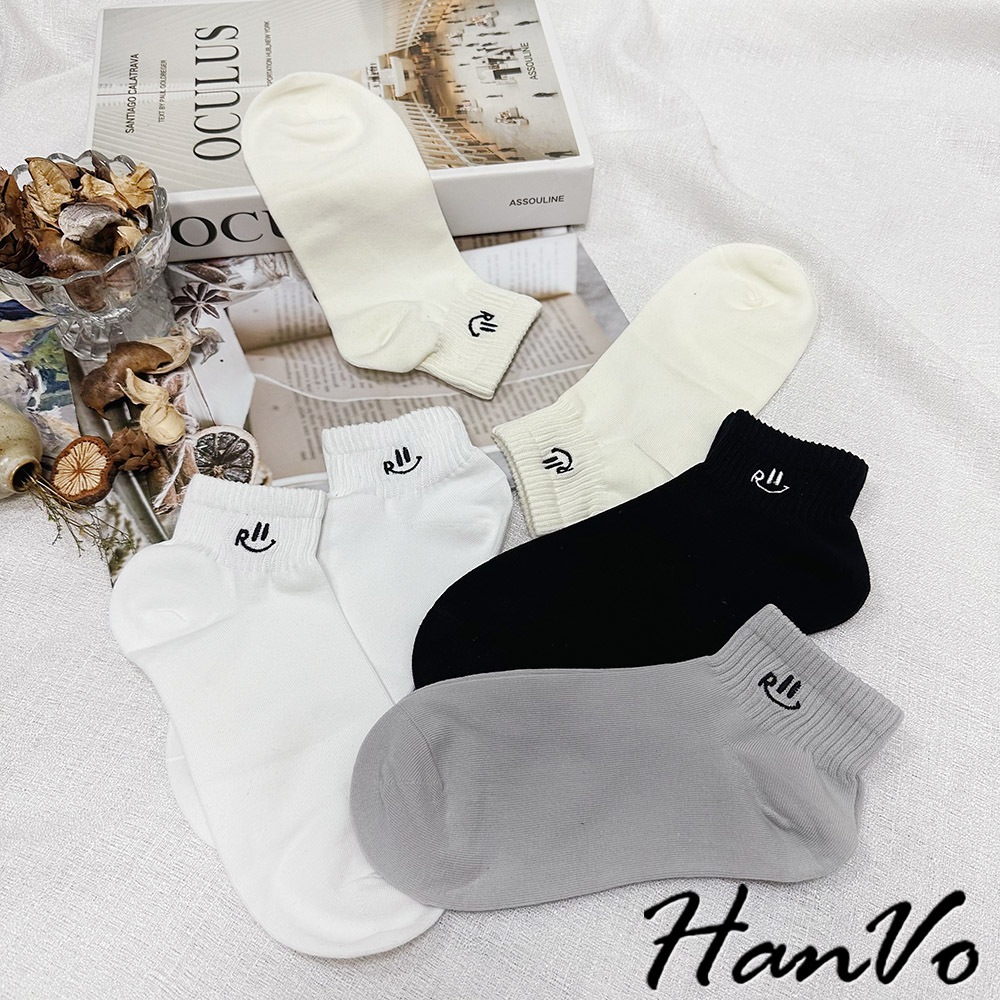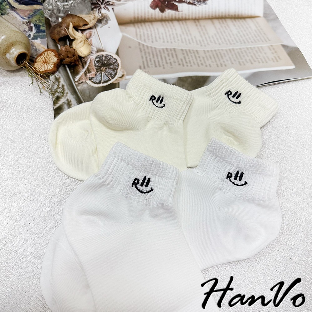 【HanVo】可愛笑臉刺繡棉質短襪 舒適透氣親膚百搭棉質襪 韓系襪子 襪子 白襪 女襪 女生配件 A12-6316夜幕黑|雲朵白|冰川灰|奶油白SocksHanVo Wear Collection