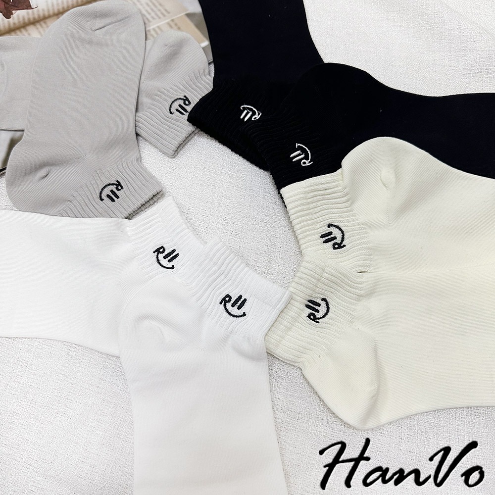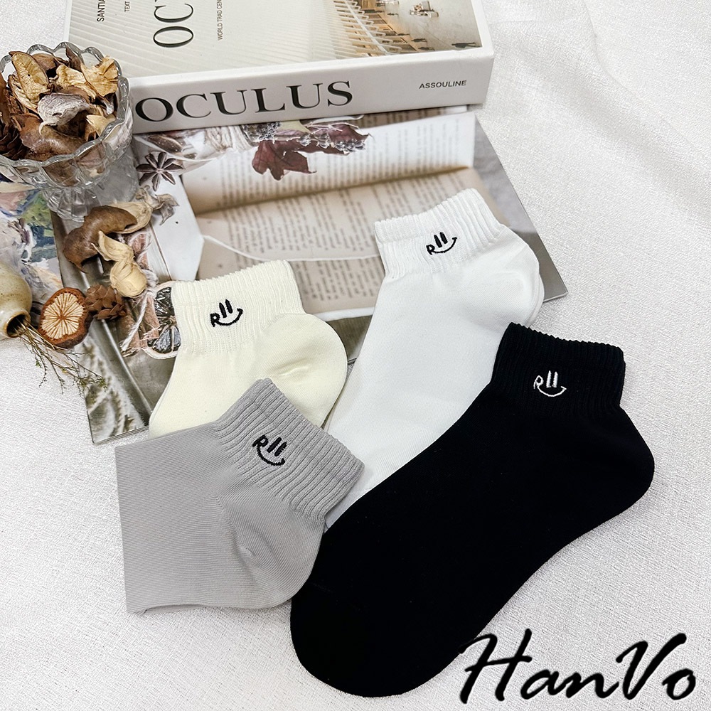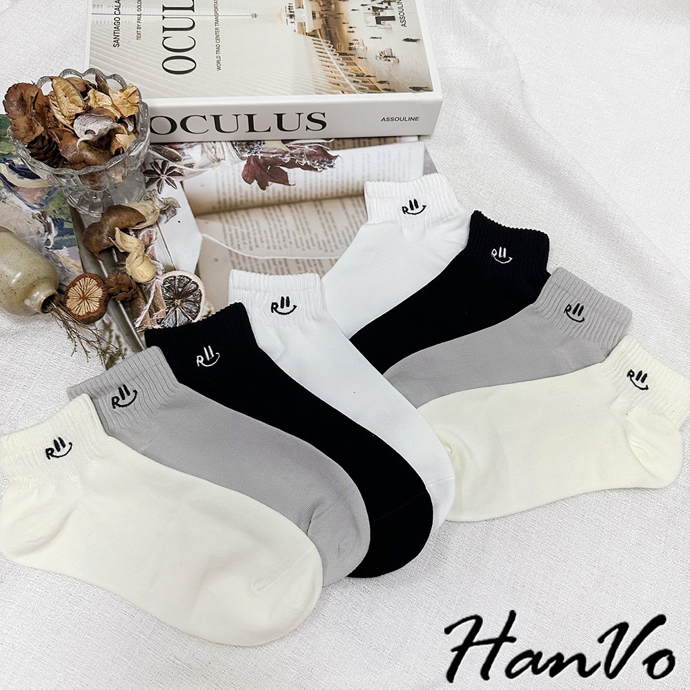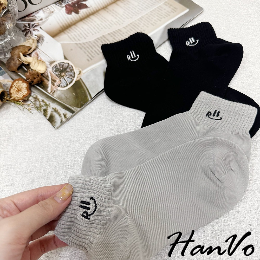 【HanVo】可愛笑臉刺繡棉質短襪 舒適透氣親膚百搭棉質襪 韓系襪子 襪子 白襪 女襪 女生配件 A12-6316夜幕黑|雲朵白|冰川灰|奶油白SocksHanVo Wear Collection