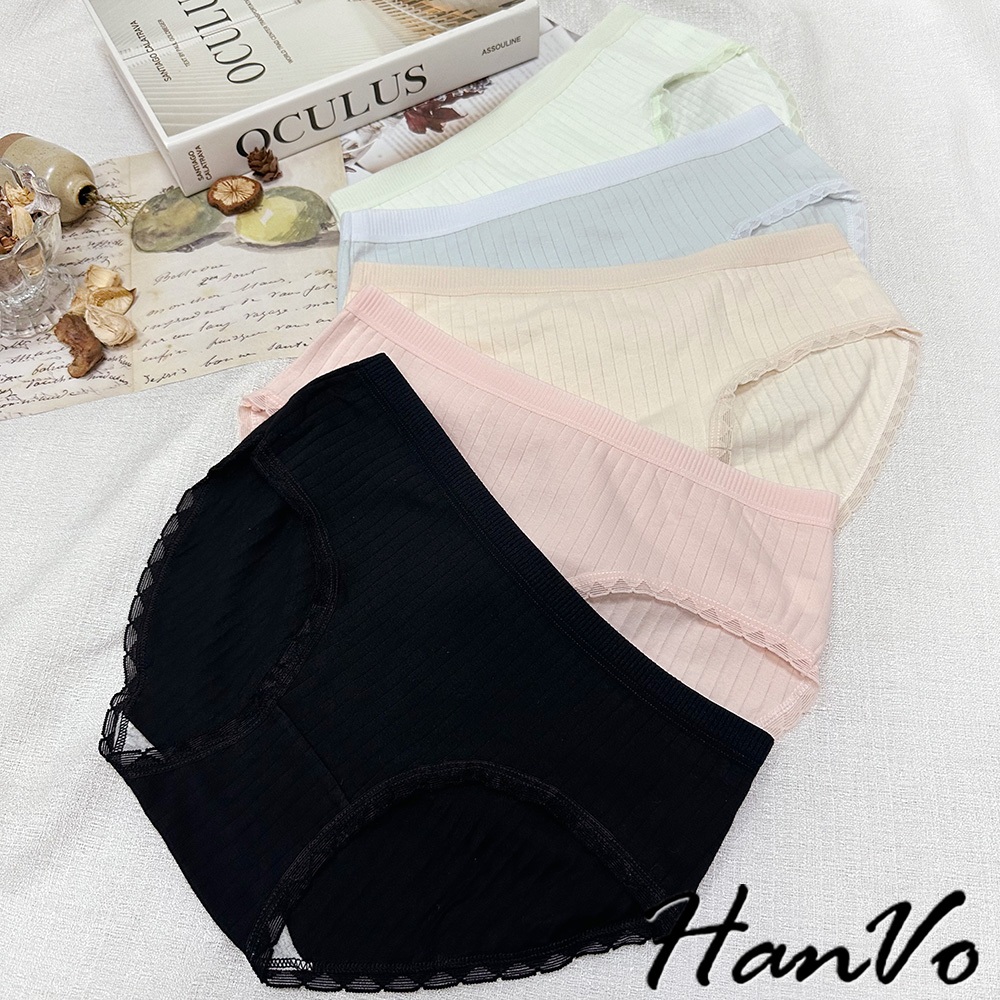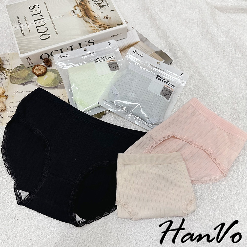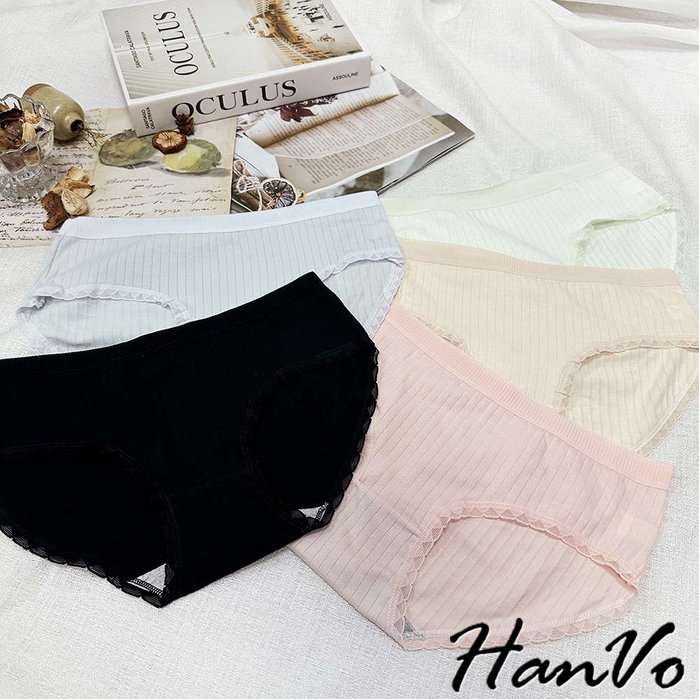 【HanVo】小清新直紋蕾絲花邊內褲 獨立包裝 中腰 吸濕排汗透氣純棉 透氣內褲 女內褲 內褲 A11-5866森林黑|花瓣粉|柔粉膚|果漾綠|寶貝藍PantiesHanVo Wear Collection