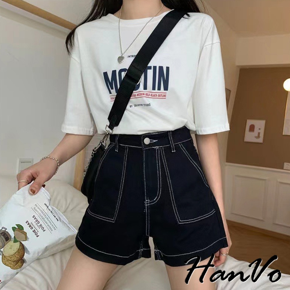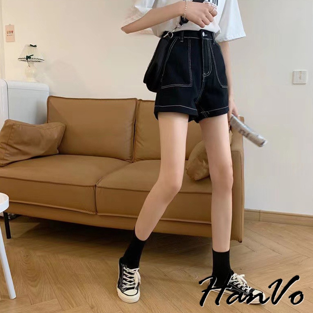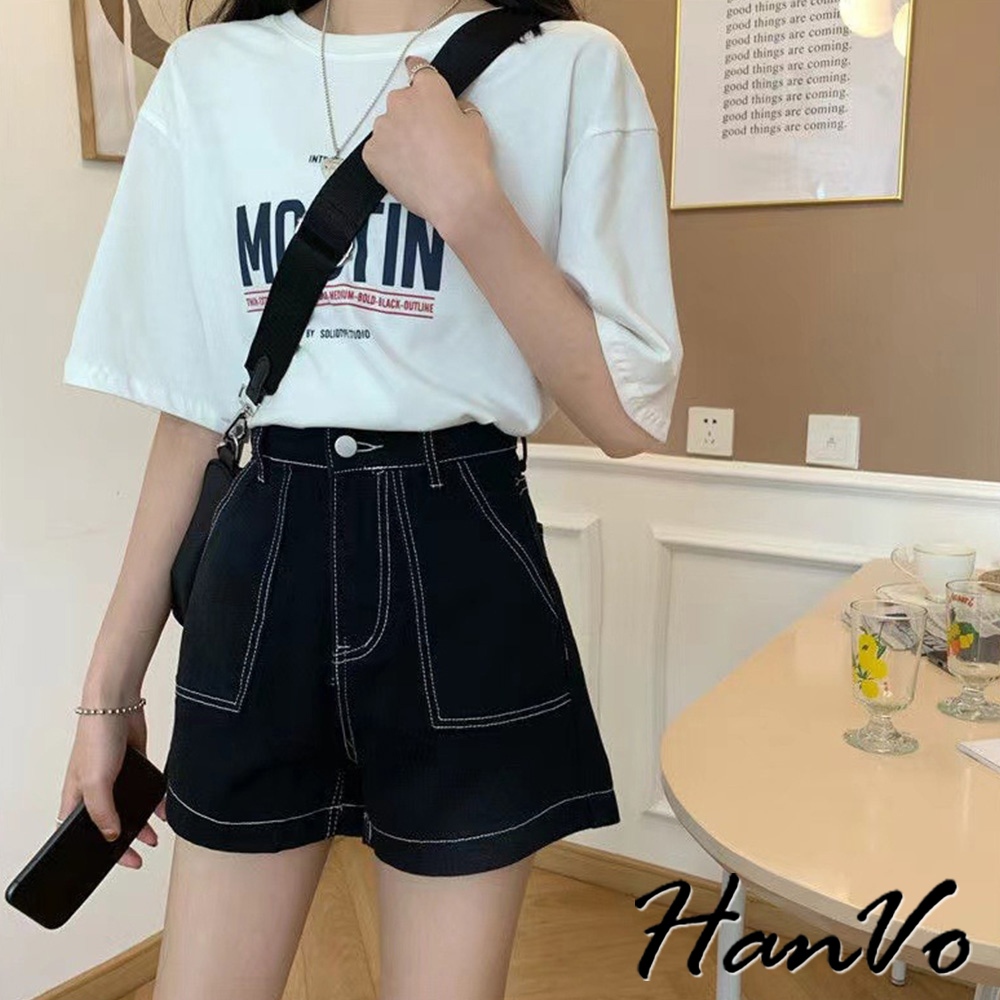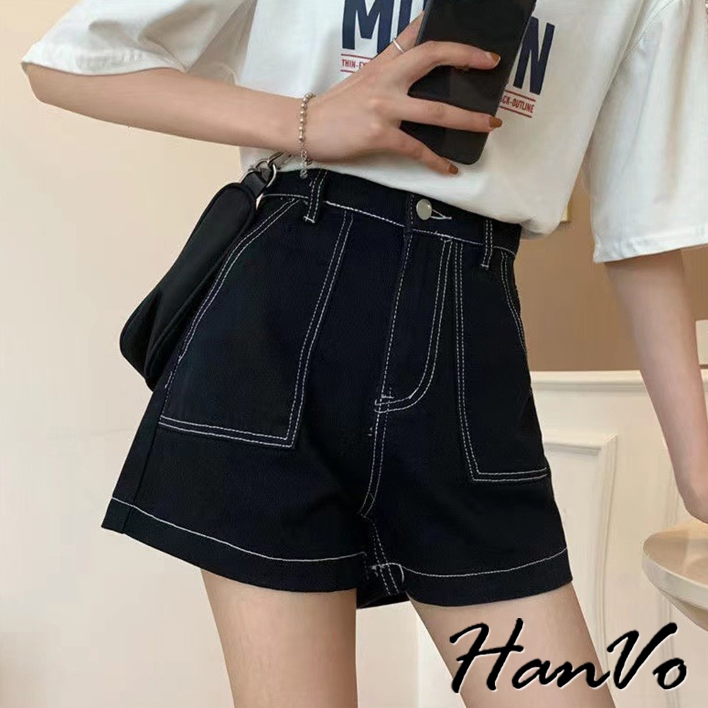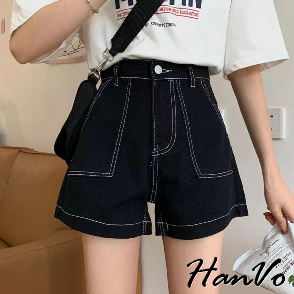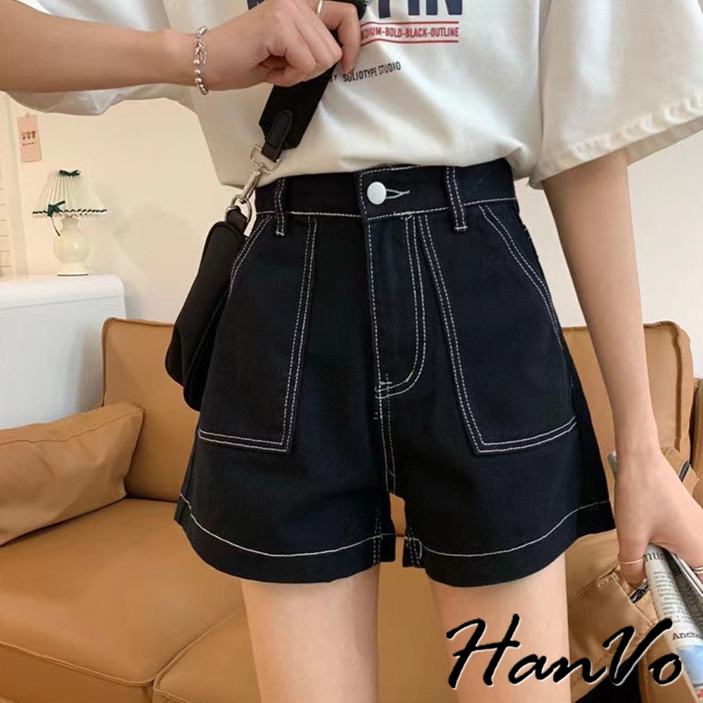 【HanVo】個性外車線高腰A字牛仔短褲 遮腹顯瘦設計感 闊腿褲 韓系女裝 顯瘦褲 女生下著 A03-2089黑色S|黑色M|黑色L|黑色XLShortsHanVo Wear Collection