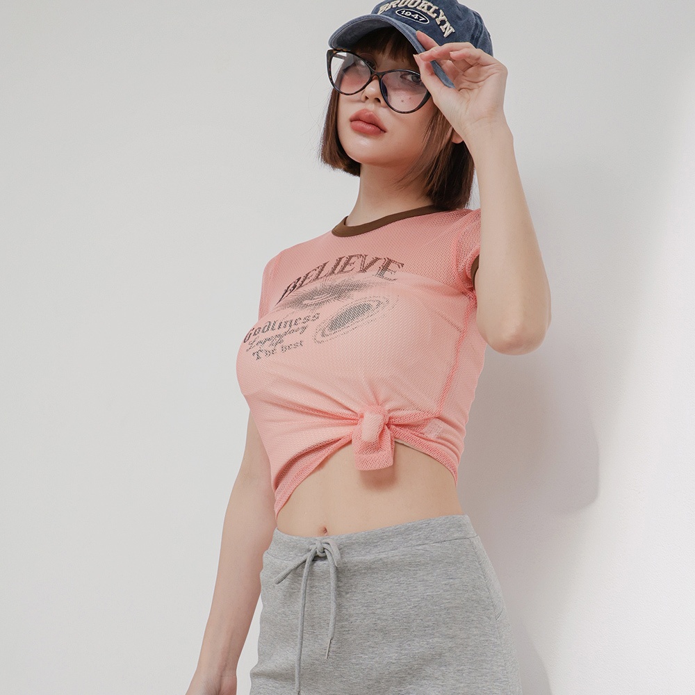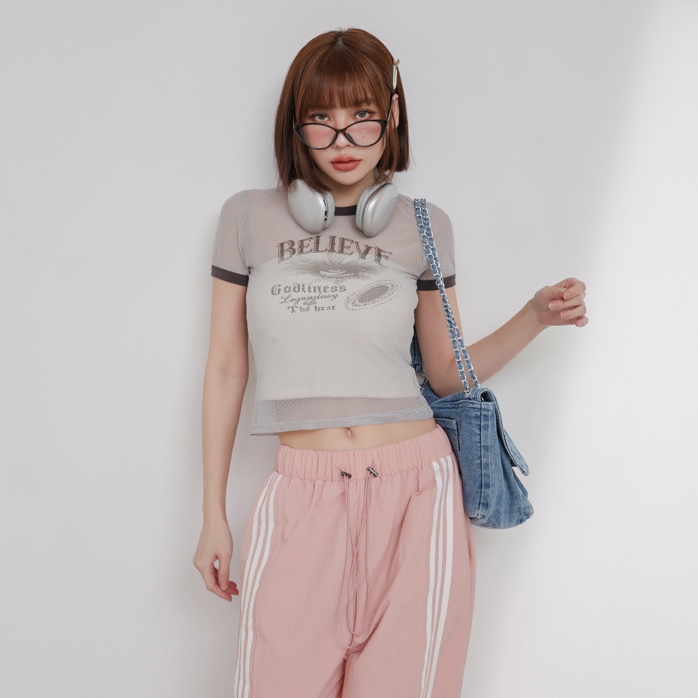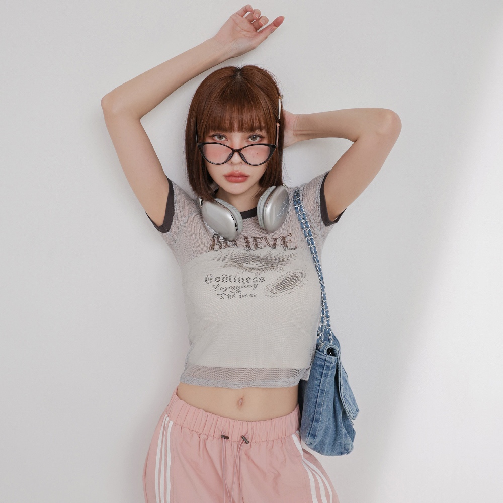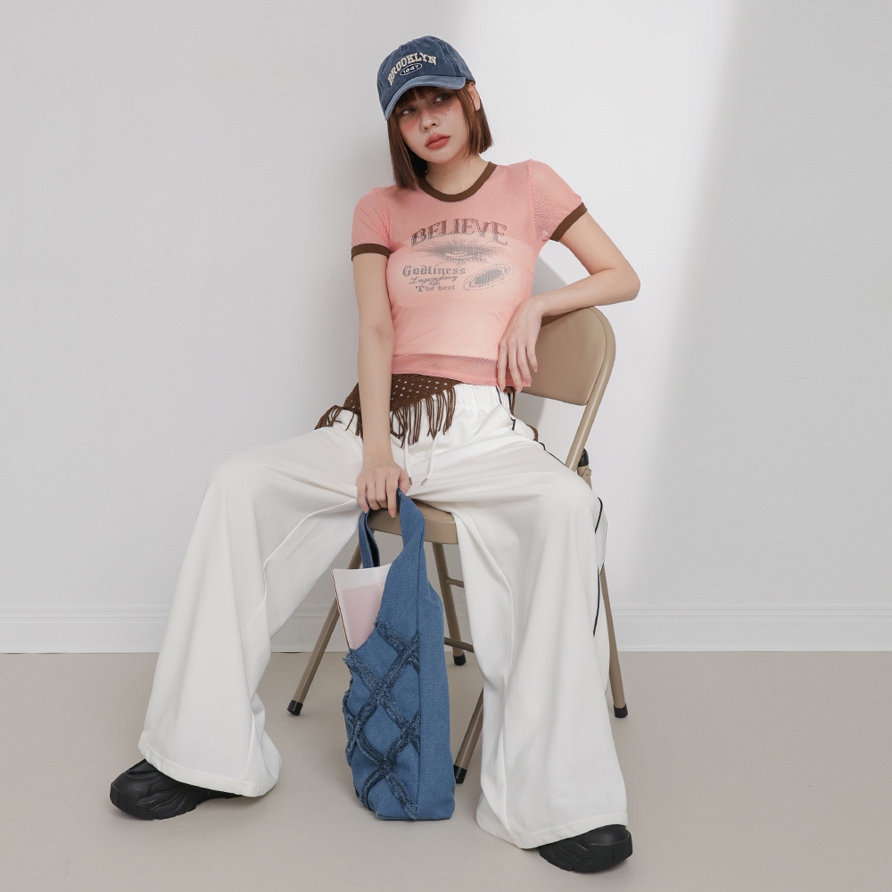 IN SHOP 美式滾邊透視網層T-共3色【KT224446】粉|灰|藍T-shirtsIN’ SHOP 旗艦店