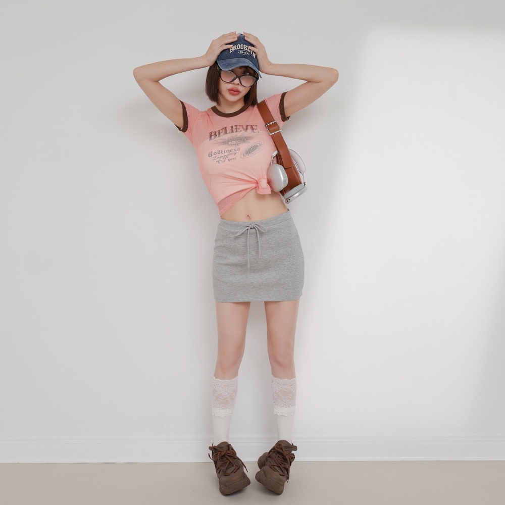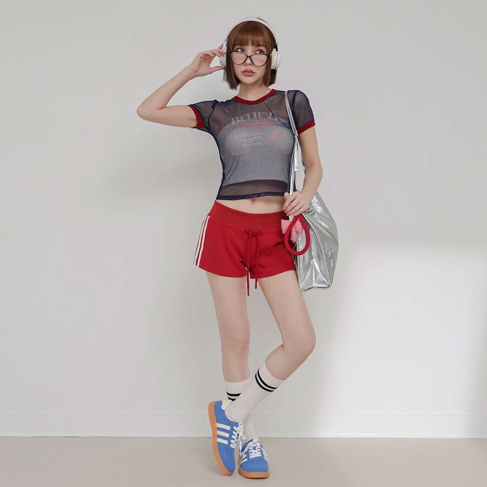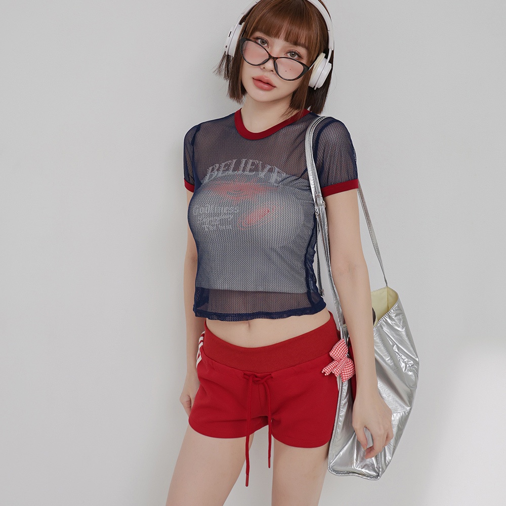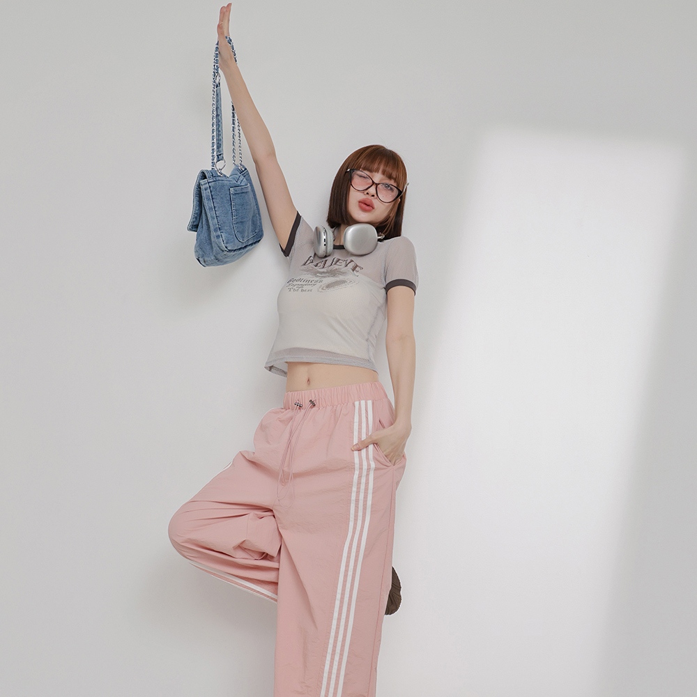 IN SHOP 美式滾邊透視網層T-共3色【KT224446】粉|灰|藍T-shirtsIN’ SHOP 旗艦店