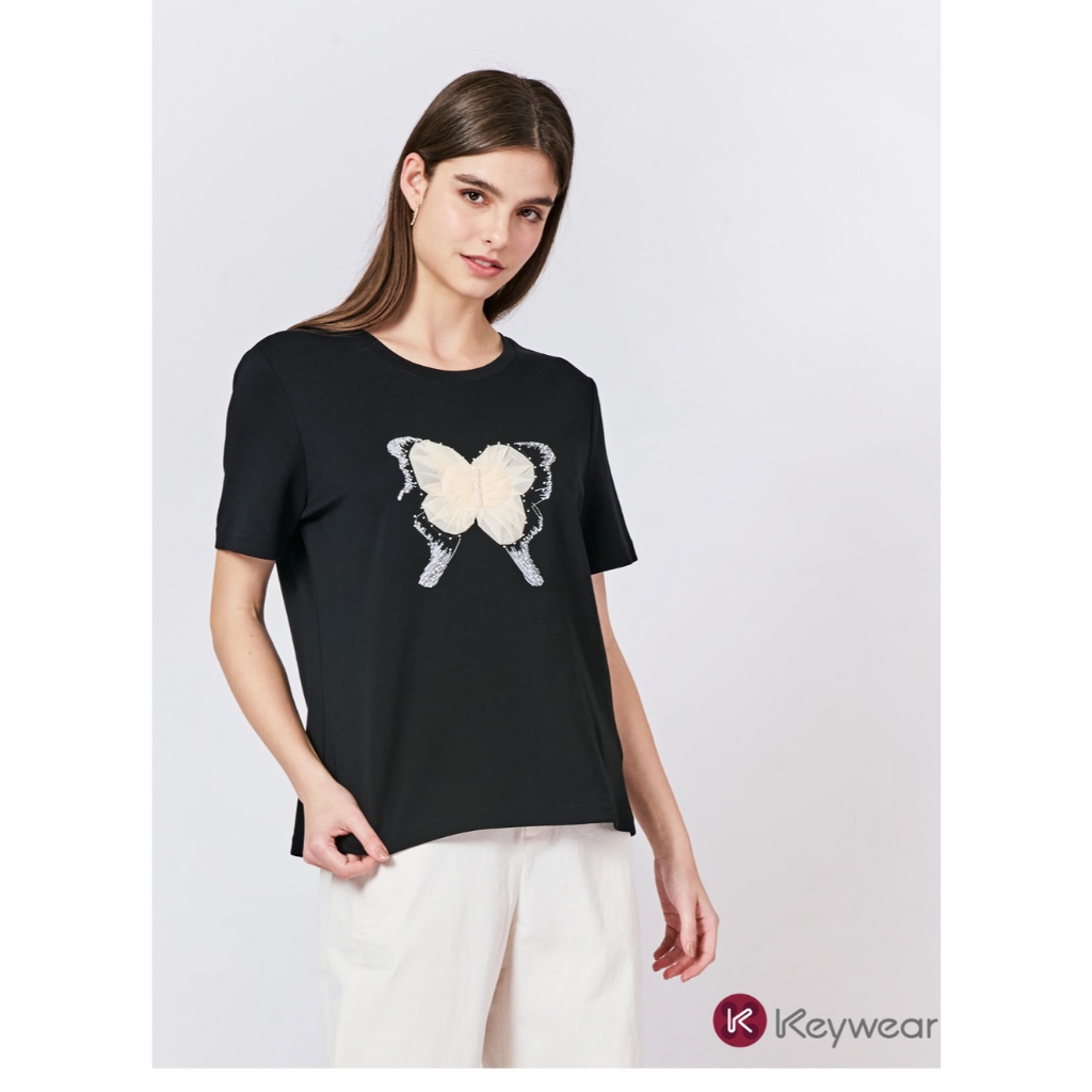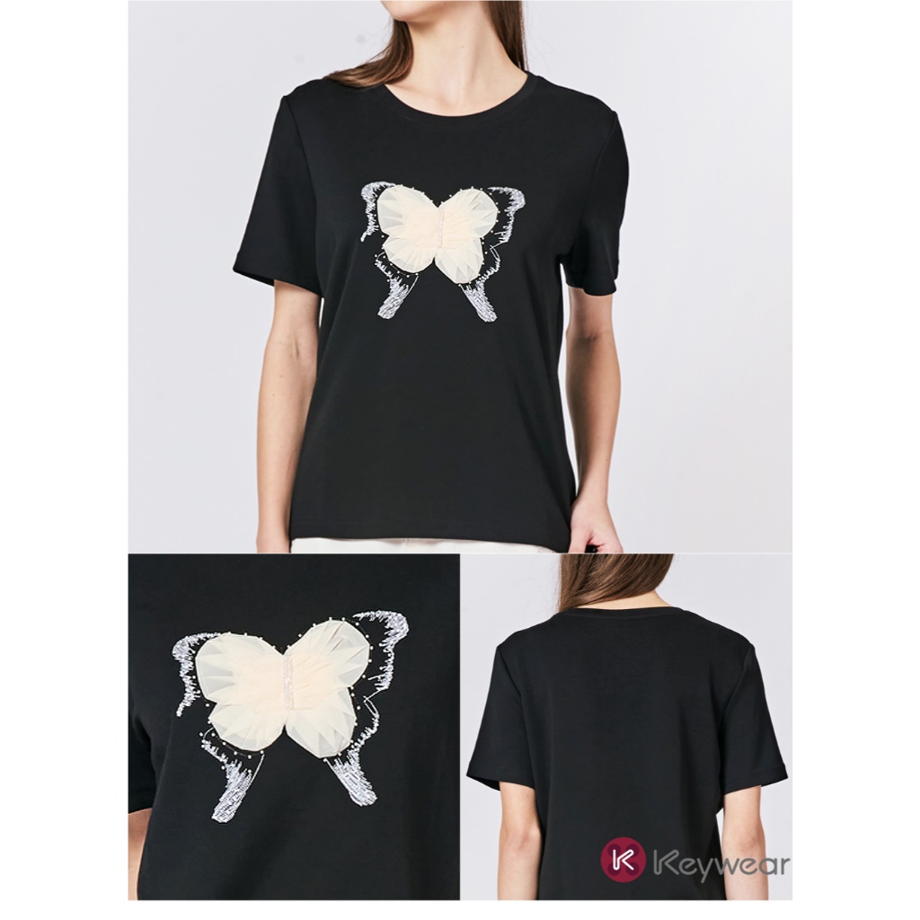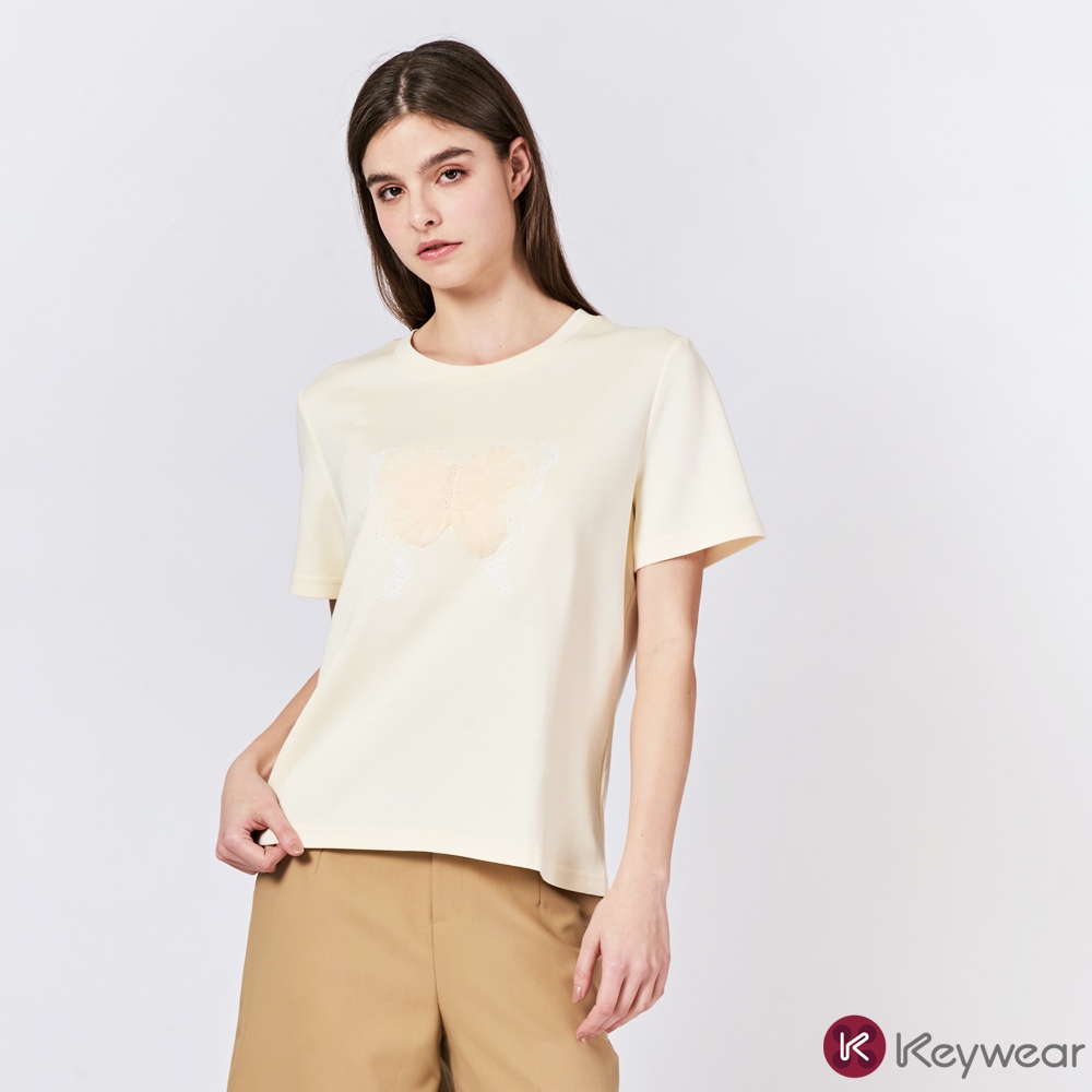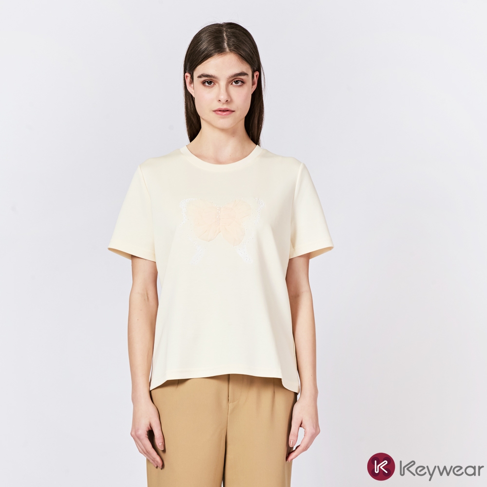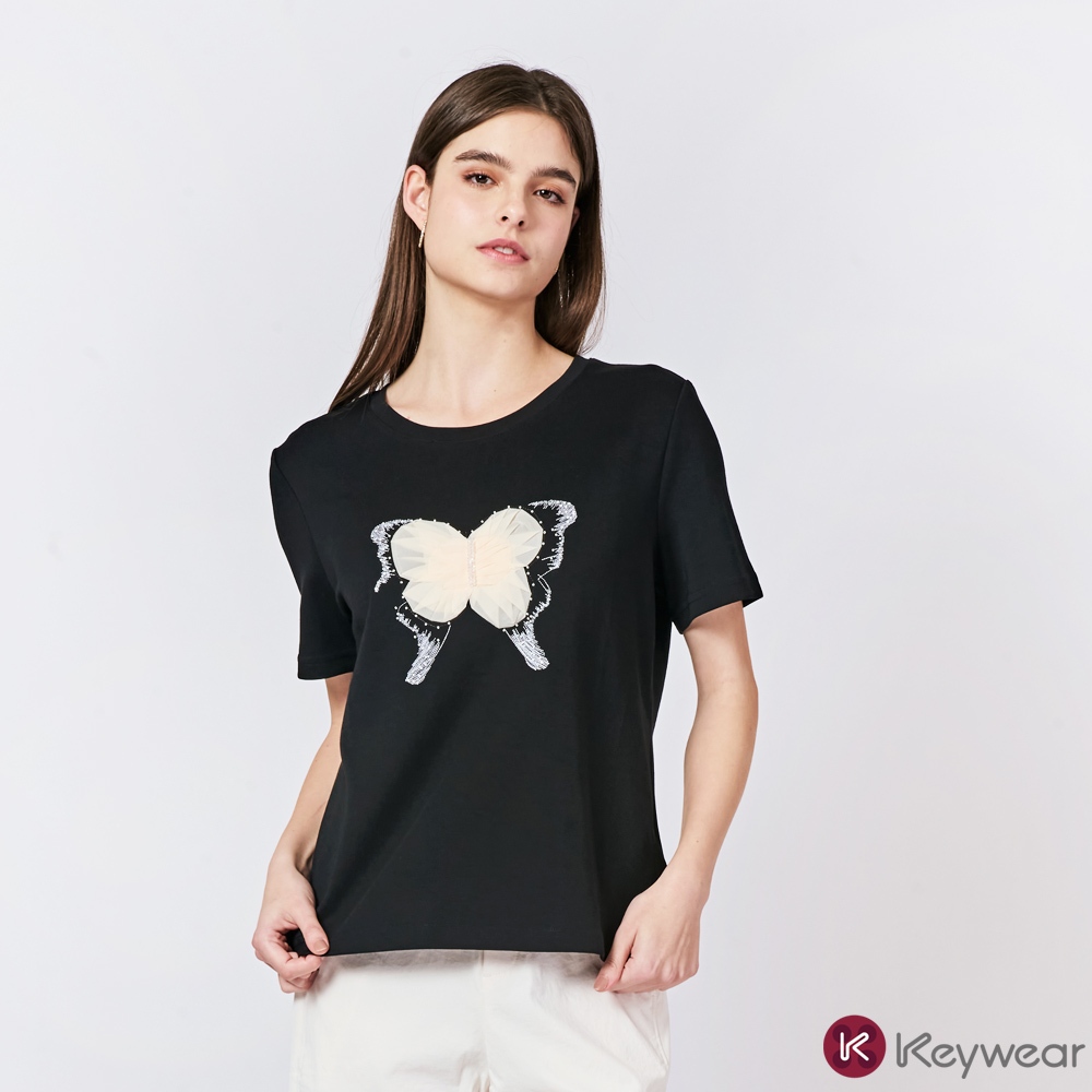 【KeyWear 奇威名品】立體蕾絲蝴蝶造型親膚舒適莫代爾百搭短袖上衣T恤 共2色黑,M|黑,L|黑,XL|米,M|米,L|米,XLT-shirtsKeywear奇威官方旗艦店