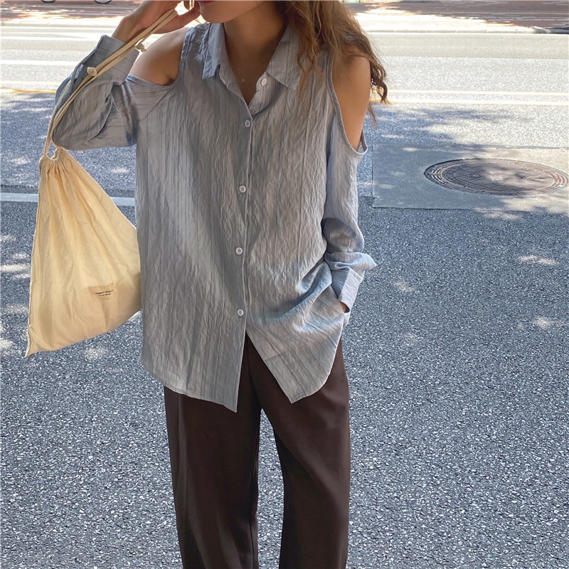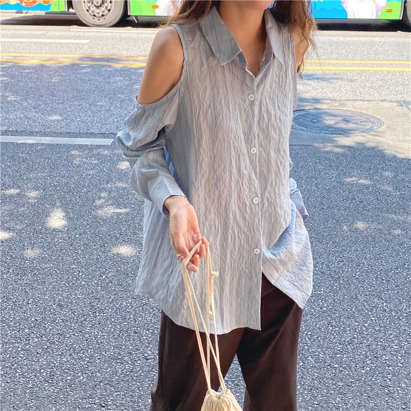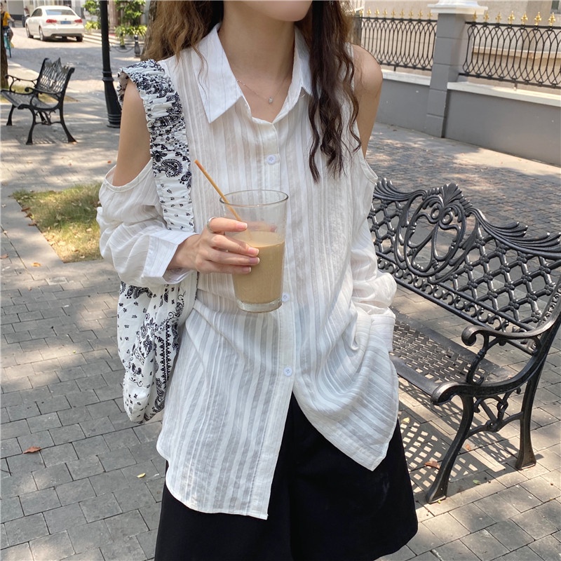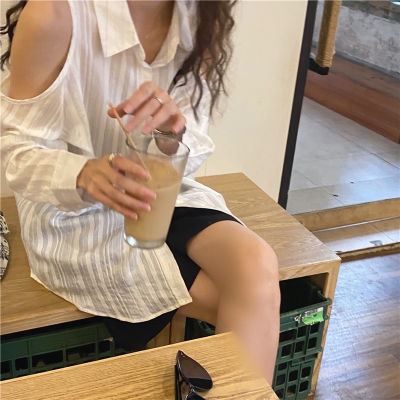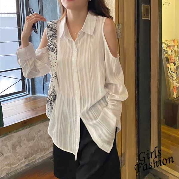 GOFO 長袖襯衫 韓系穿搭 顯瘦 性感小心機露肩 條紋襯衫 女生襯衫 女裝衣著 夏天 夏季服飾白色|淺藍Shirts & BlousesGOFO 台灣賣家 台灣出貨 台灣現貨
