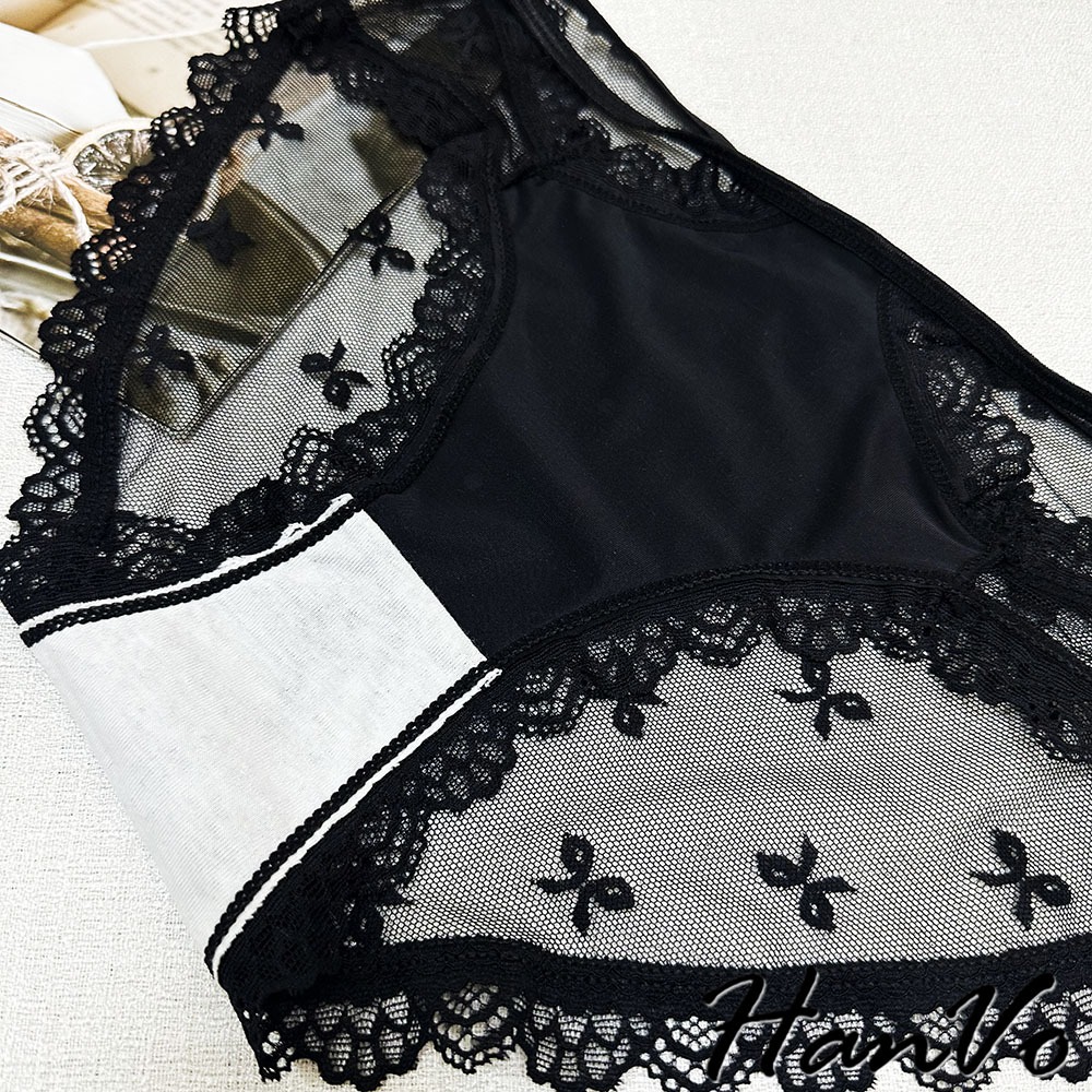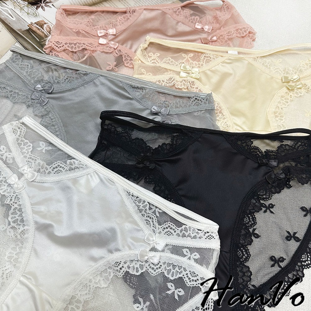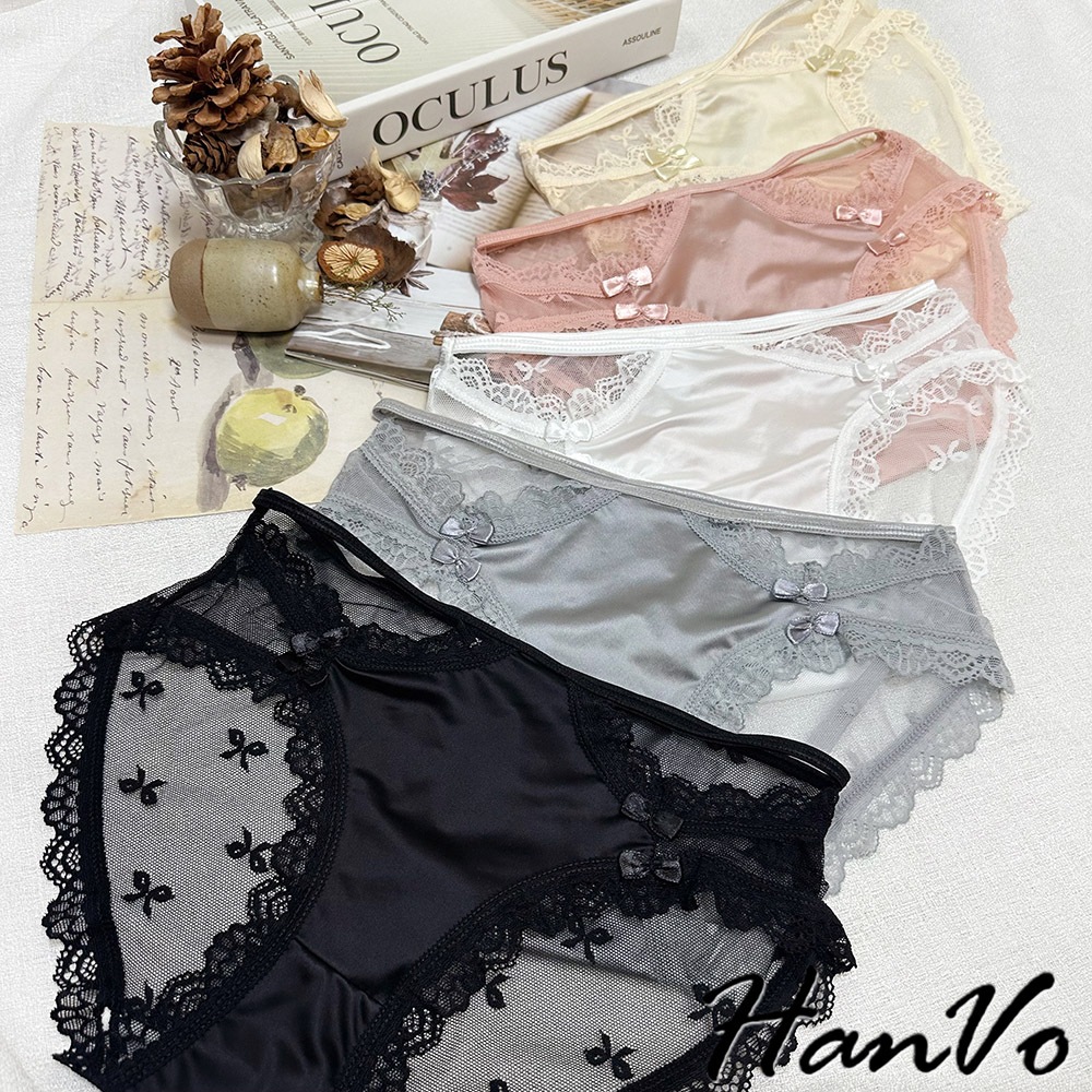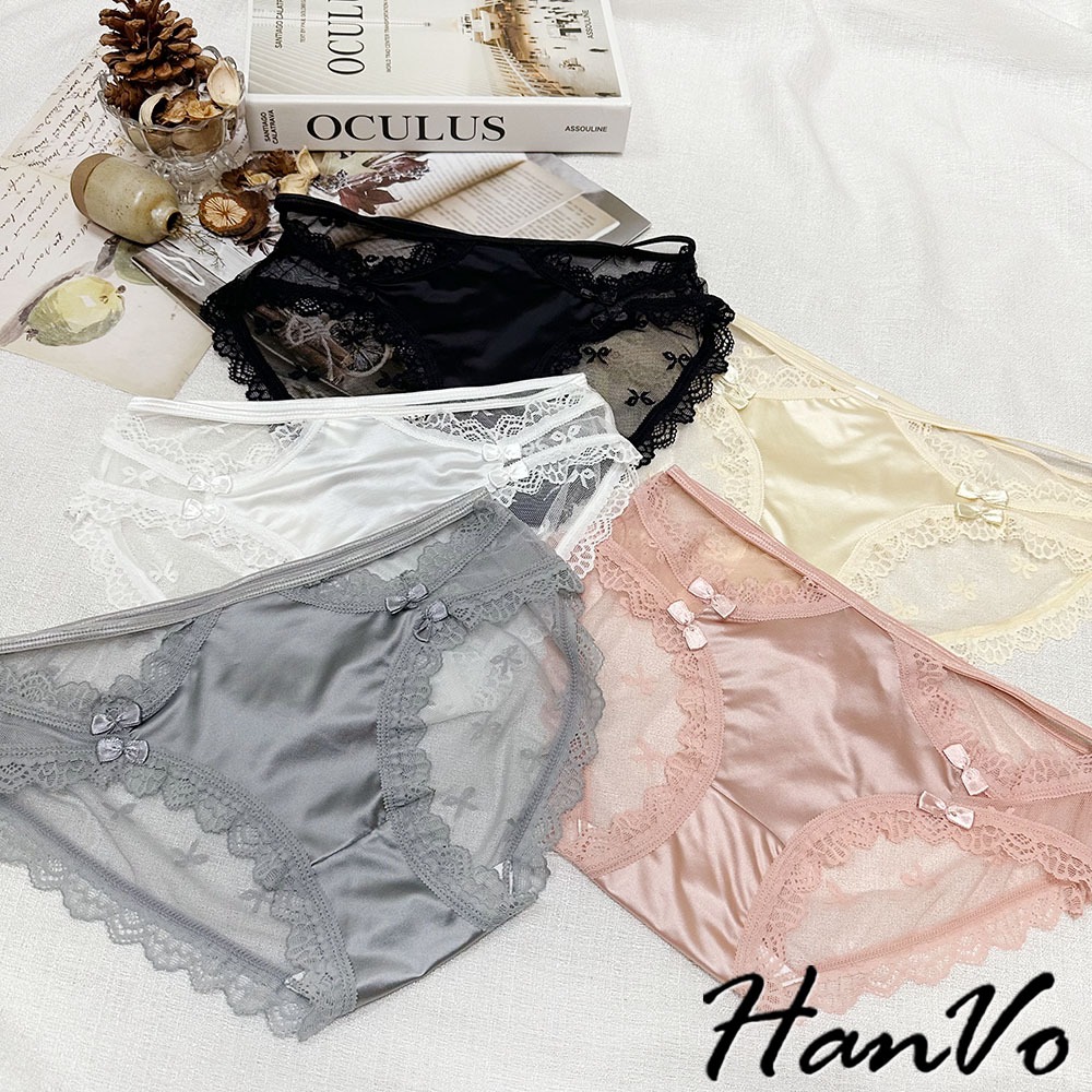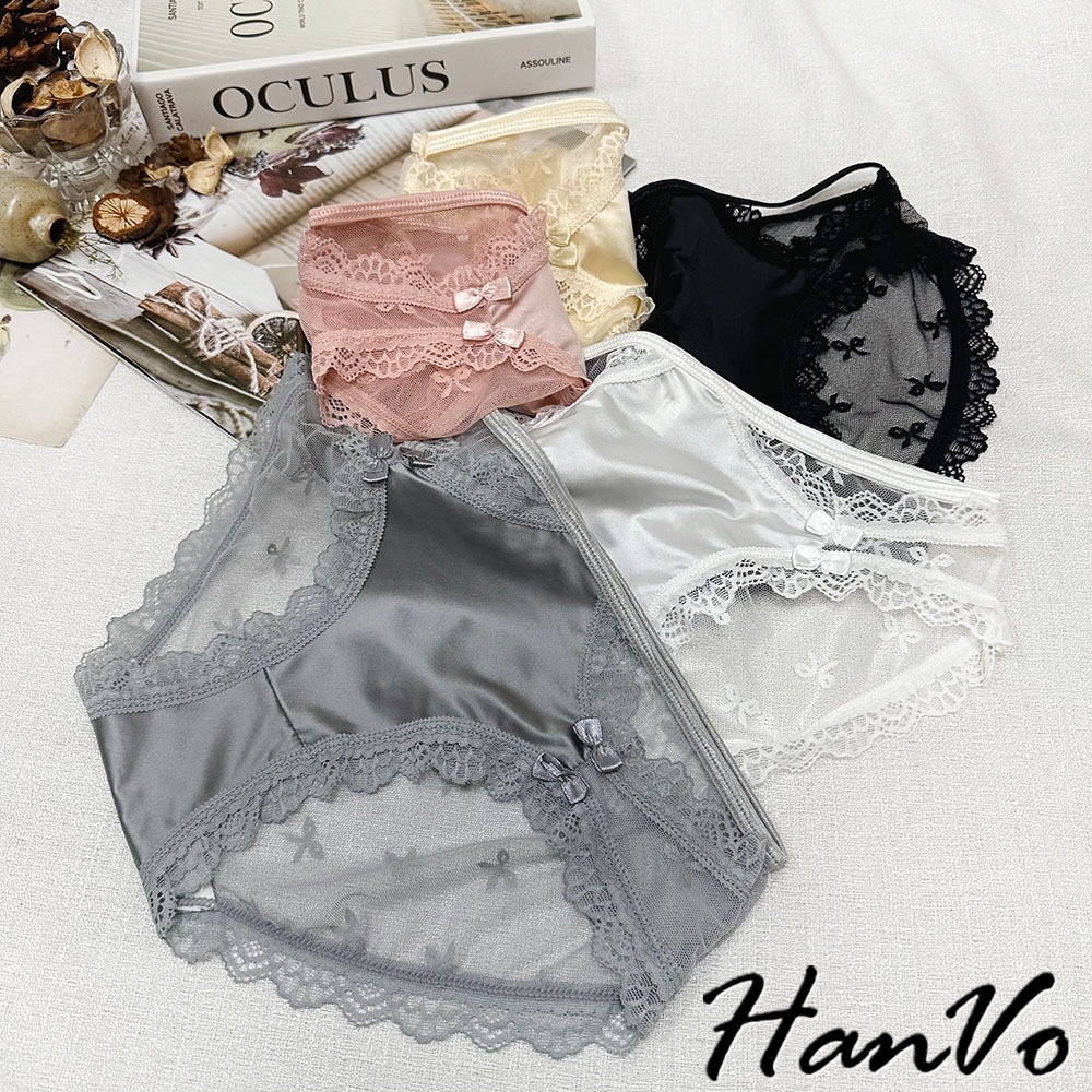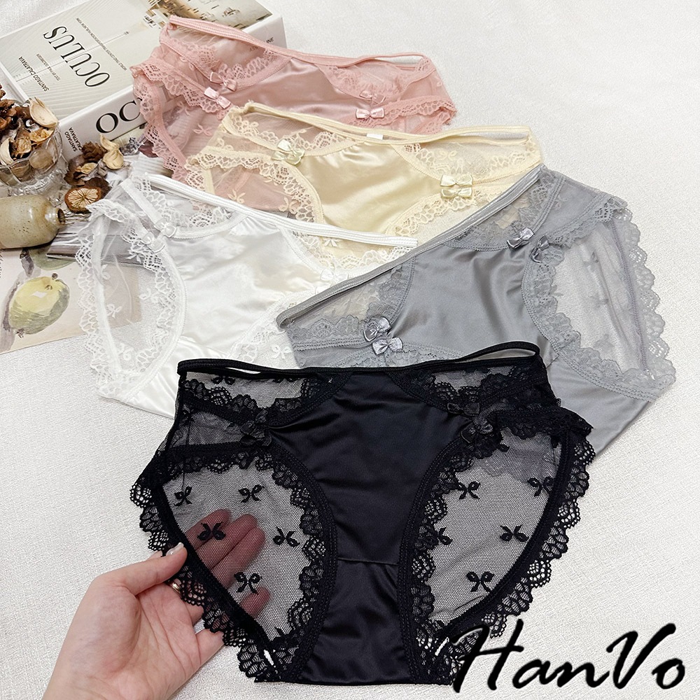 【HanVo】升級款! 蝶結蕾絲網紗鏤空內褲 中腰 薄款性感優美三角褲 透氣內褲 女生內褲 內褲 A11-5205冷調灰|靜謐黑|貴妃粉|絲滑膚|月光白PantiesHanVo Wear Collection