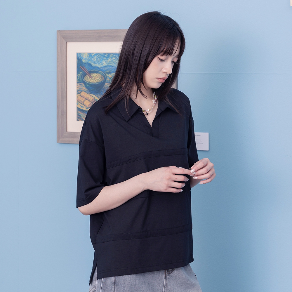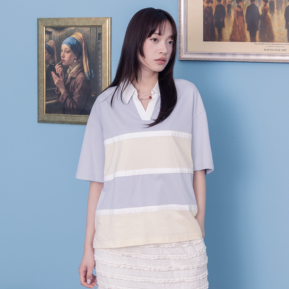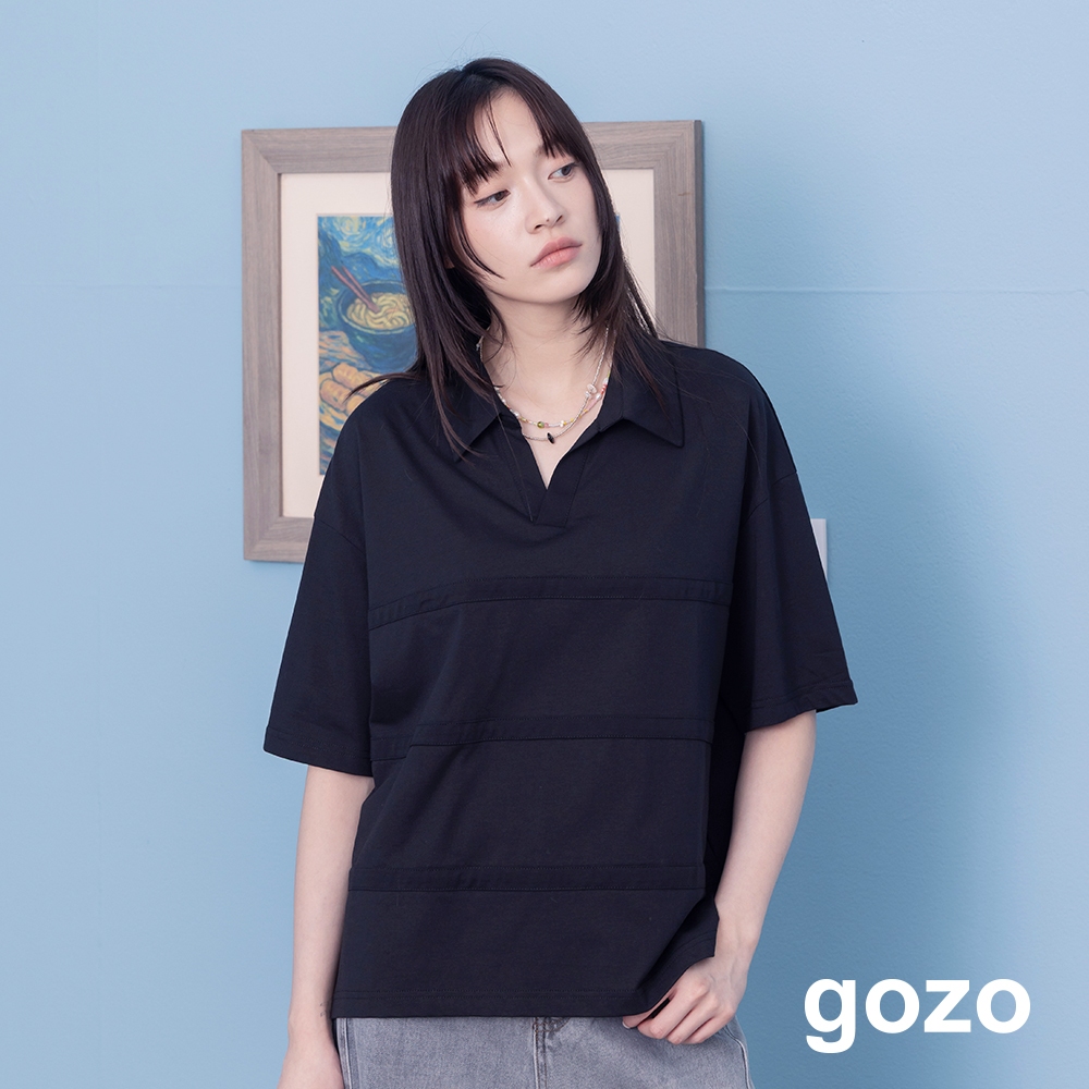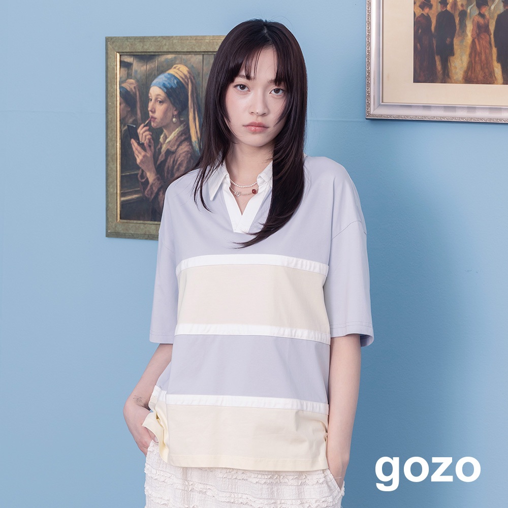【gozo】寬條紋針織polo領上衣(淺藍/黑色_F) | 女裝 V領 百搭淺藍,F|黑色,FPolo Shirtsgozo 品牌旗艦店