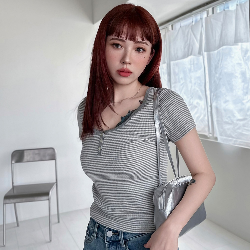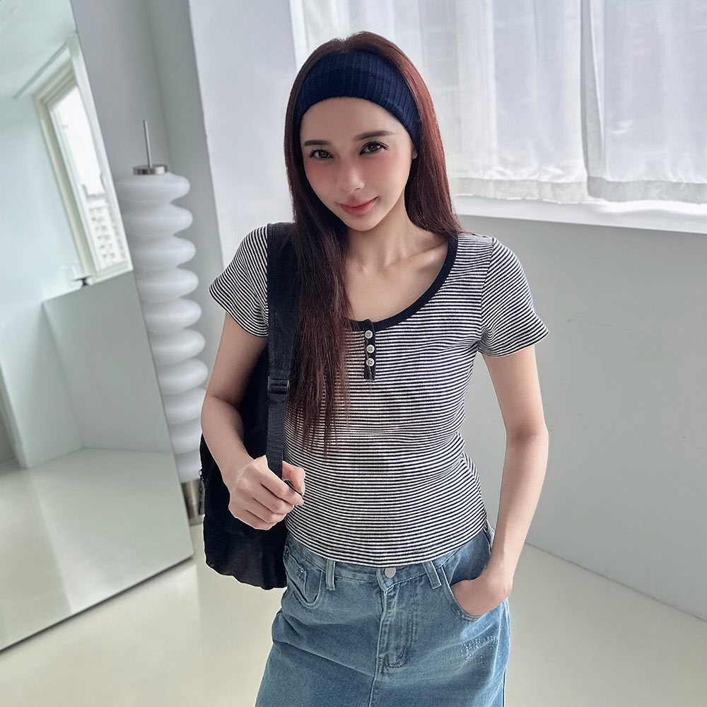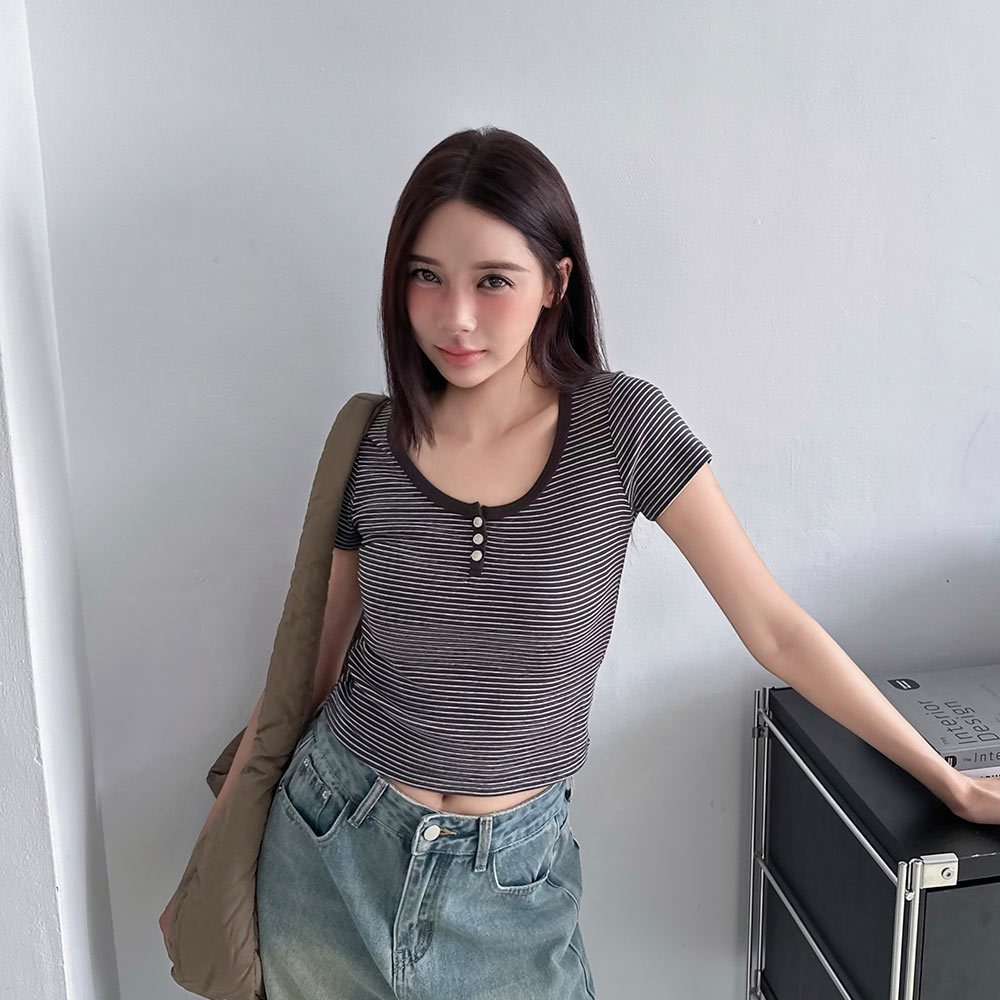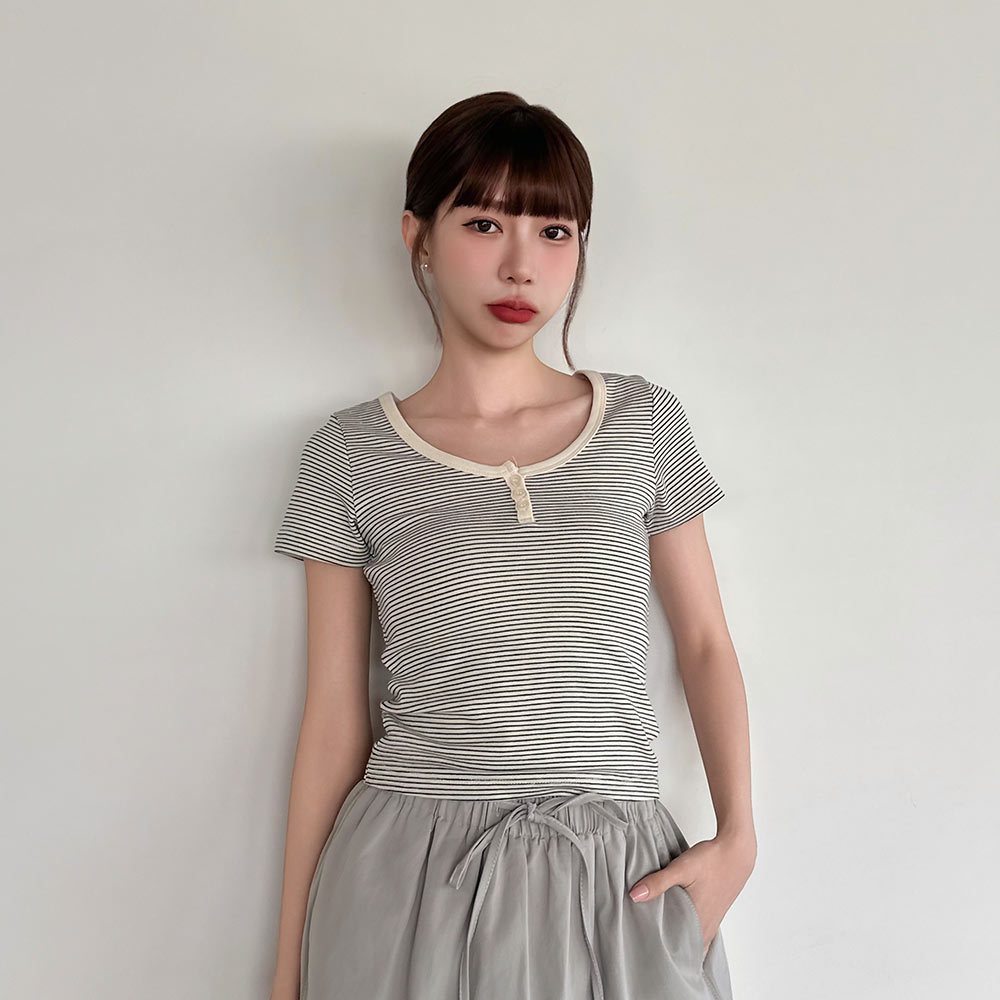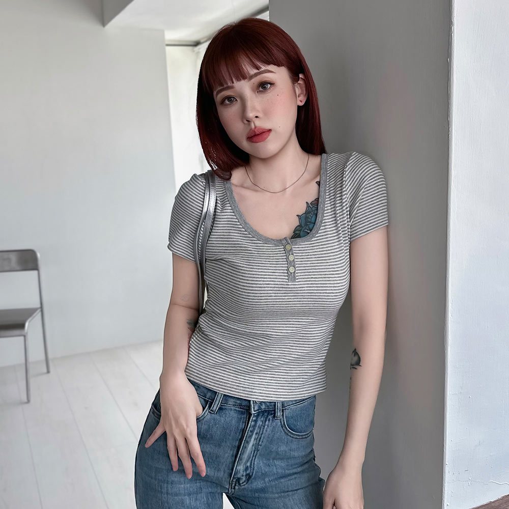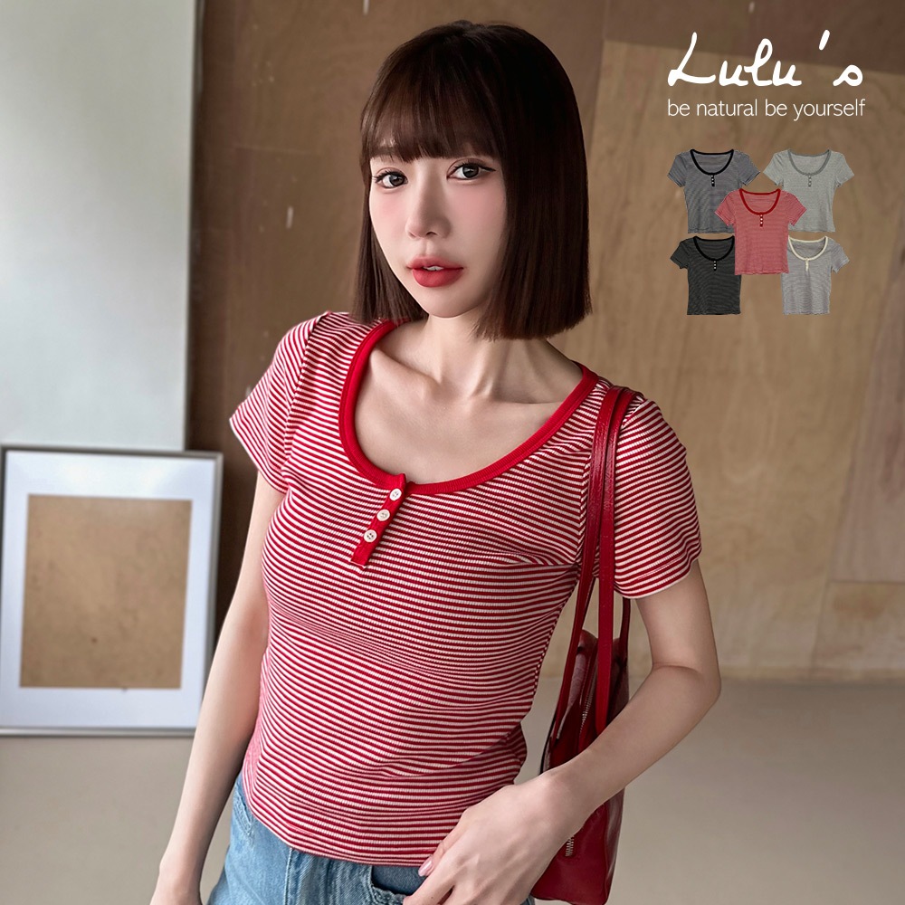 LULUS/現貨/加州辣妹細橫紋三釦修身上衣5色【A01250455】短版 合身 250702花灰|紅|深灰|條-白|條-藍T-shirtsLULUS