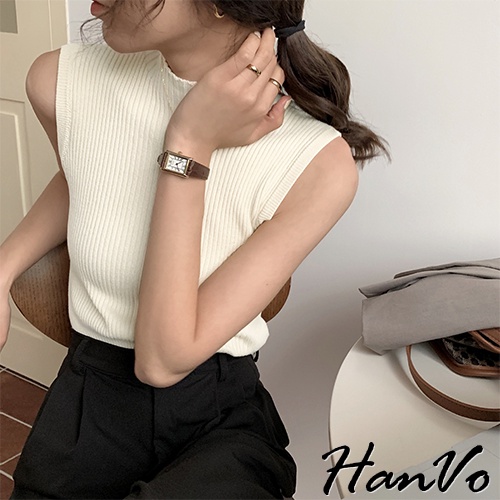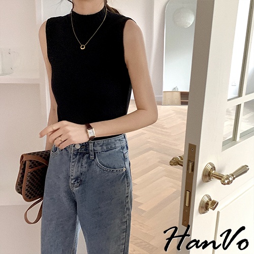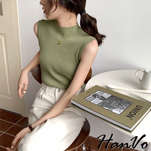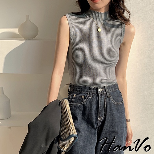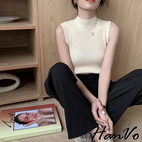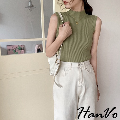 【HanVo】高領羅紋針織背心 韓系休閒百搭合身針織背心上衣 韓系女裝 女生上衣 女生衣著 A01-1389黑色|白色|霧灰|霧綠|杏色Tanks & CamisolesHanVo Wear Collection