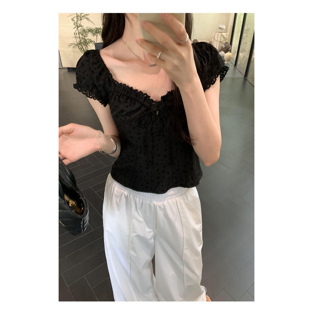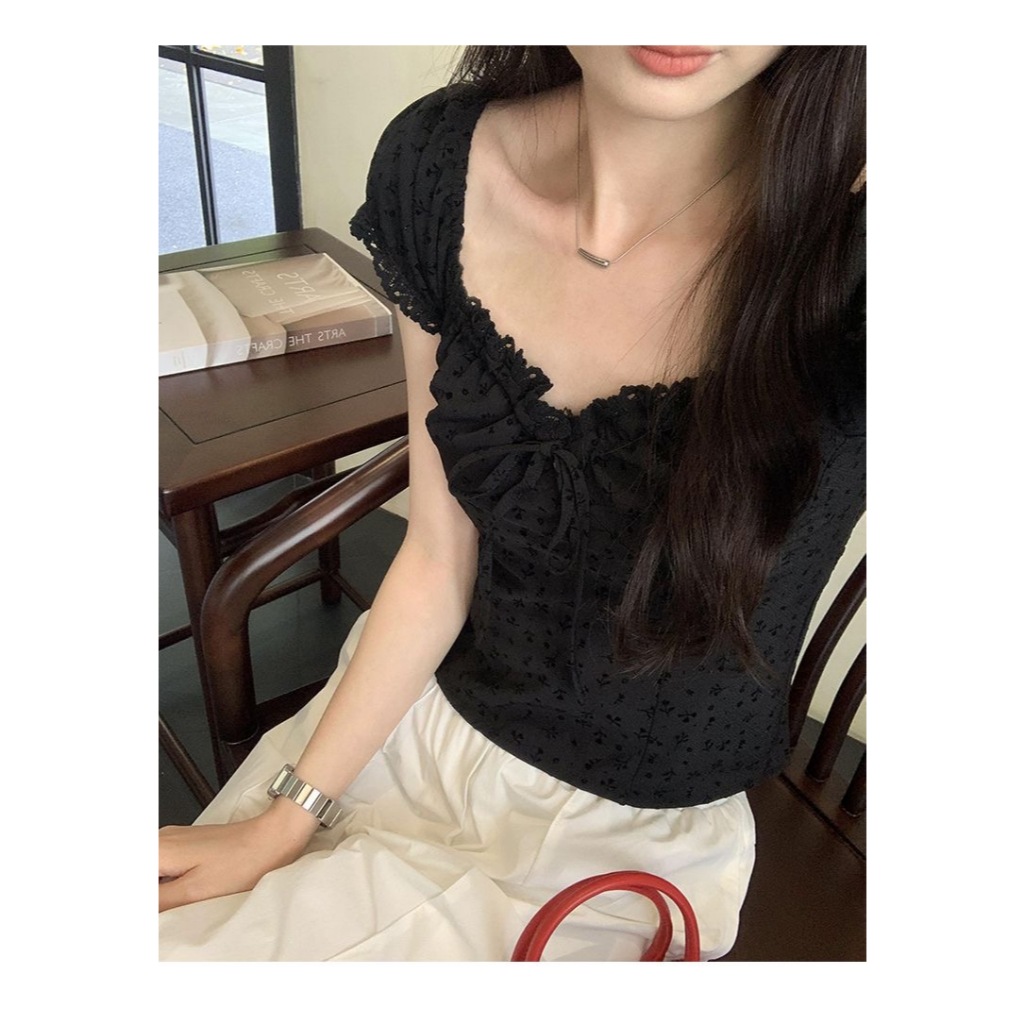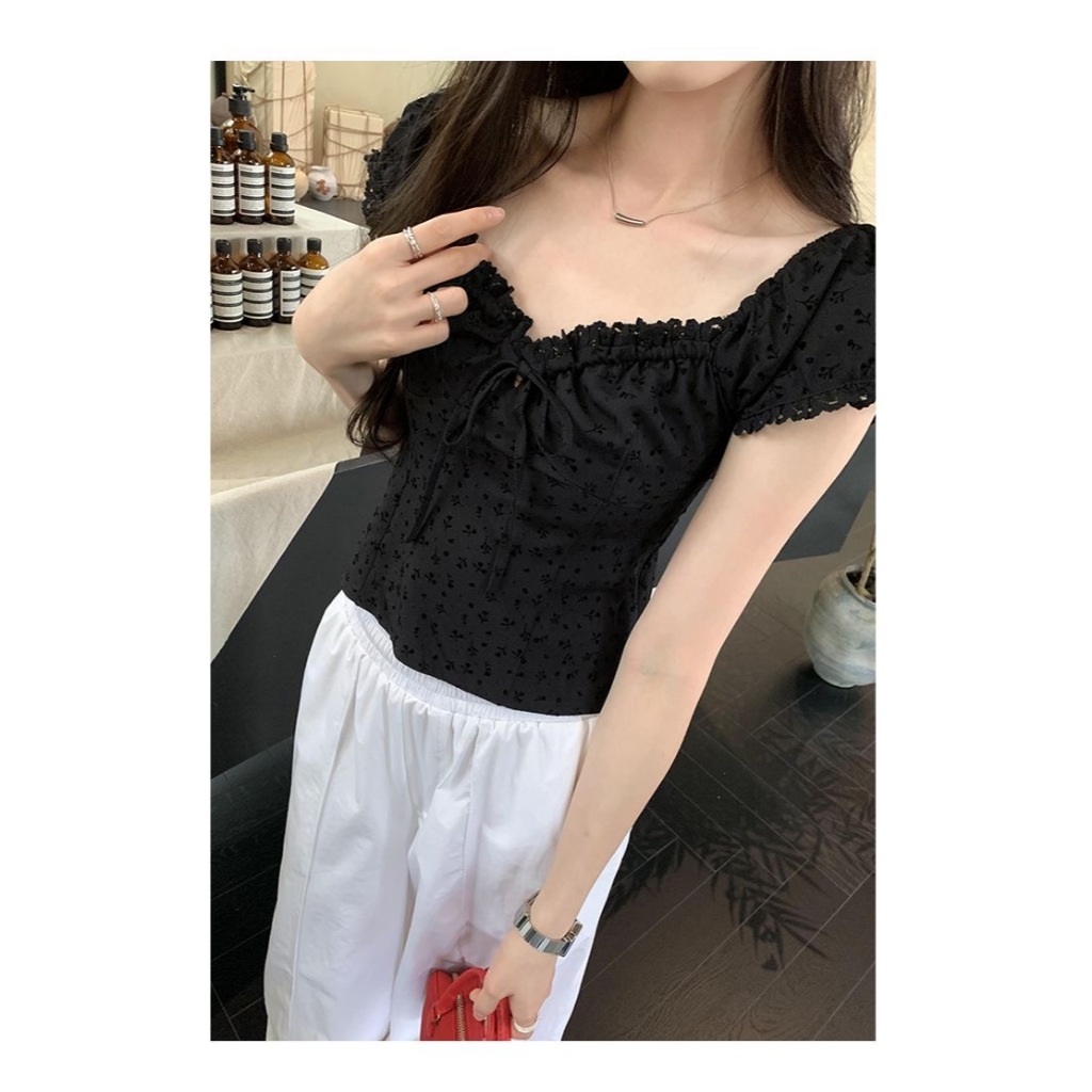 FUXI 法式碎花蕾絲花邊上衣女 泡泡袖上衣 短袖上衣 短板上衣 抽褶繫帶收腰顯瘦上衣 女裝 衣服黑色,S 40-48公斤|黑色,M 48-54公斤|黑色,L 55-60公斤|黑色,XL 60-65公斤Shirts & BlousesFUXI 服喜行