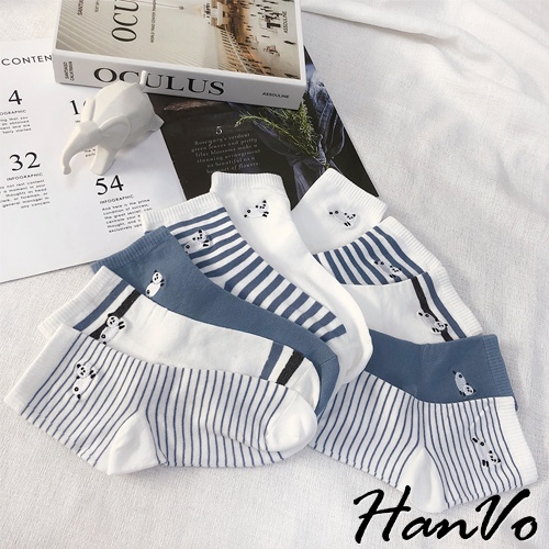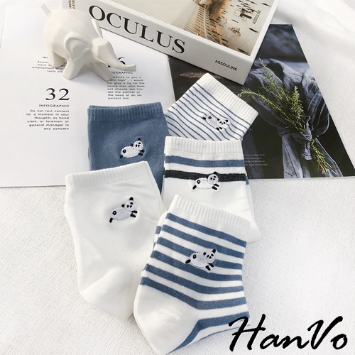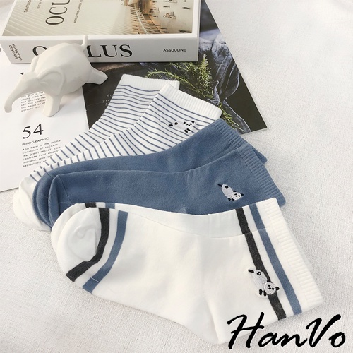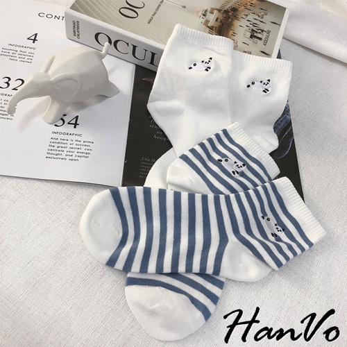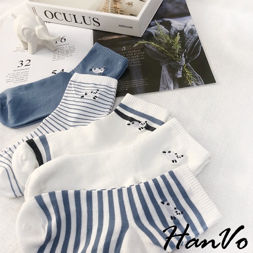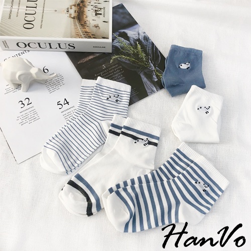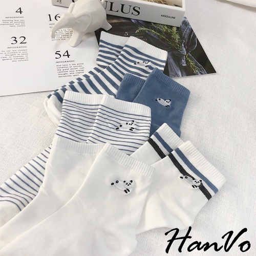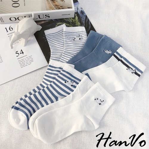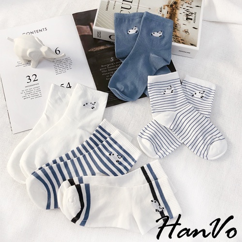 【HanVo】天空中奔跑的熊貓中筒襪 韓國潮流時尚休閒襪 韓系簡約百搭舒適棉質襪 女生配件 A12-6092純白雲朵|清新細紋|藍灰雙條紋|藍白粗條紋|晴空霧藍SocksHanVo Wear Collection