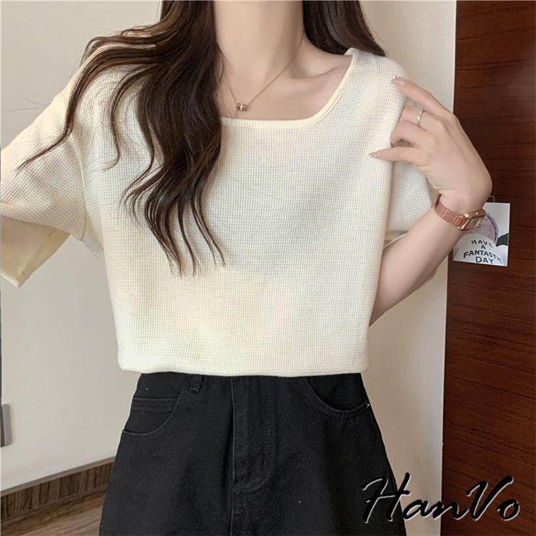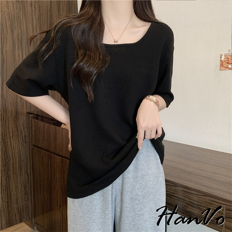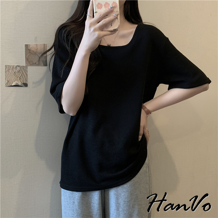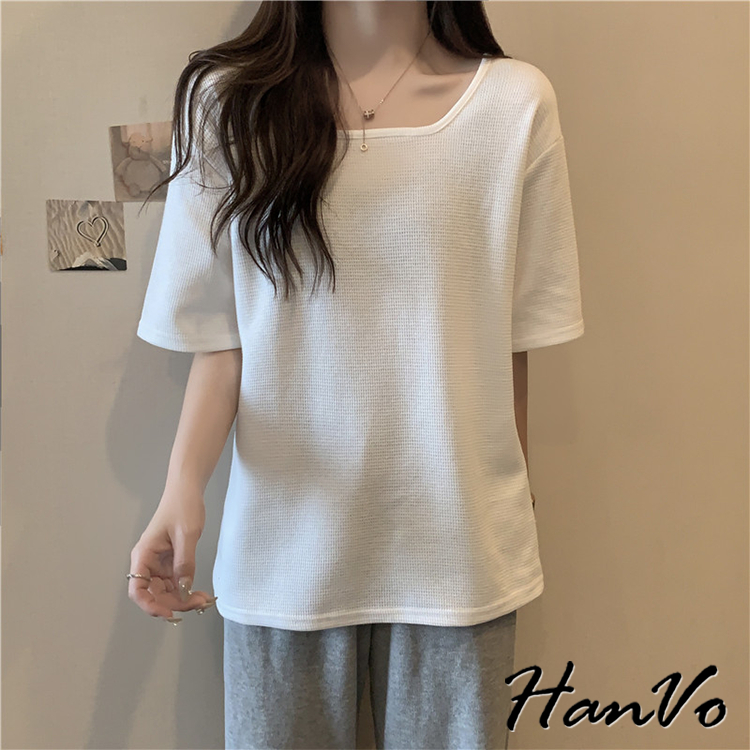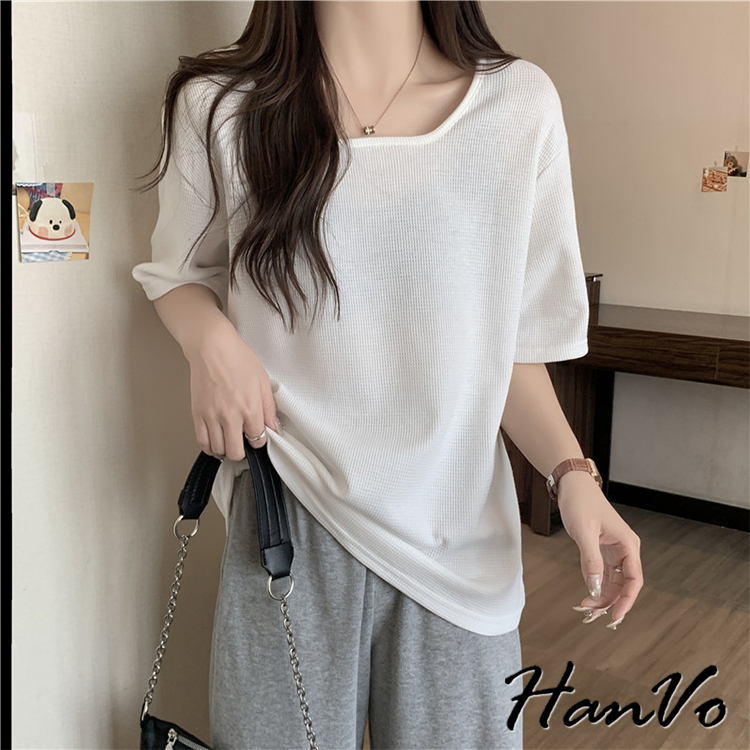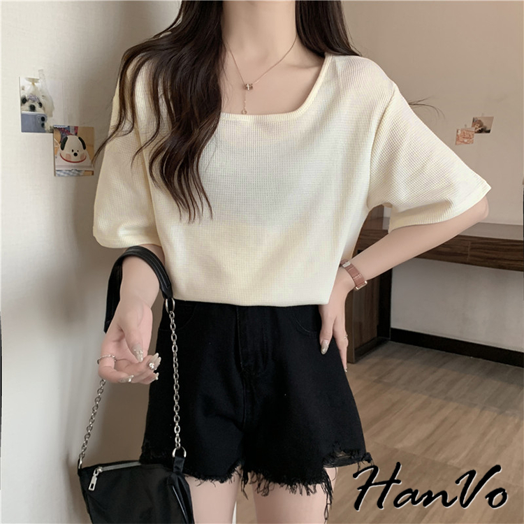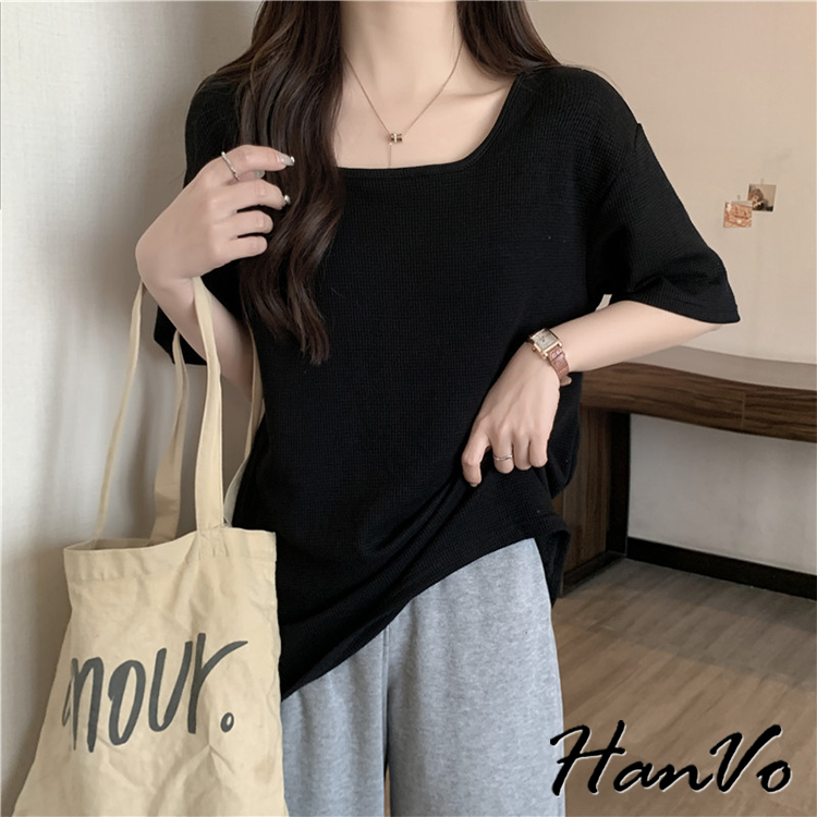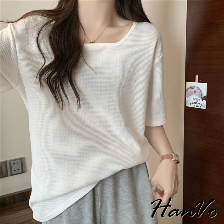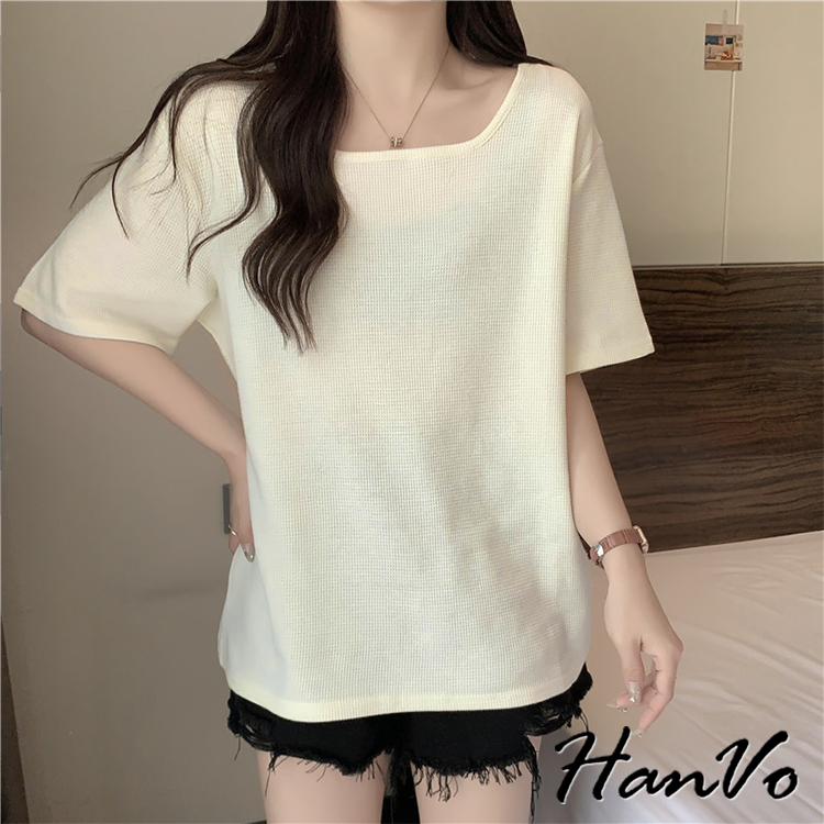 【HanVo】素色大U領華夫格棉質T恤 韓國寬鬆短袖上衣 韓版簡約日常T 韓系女裝 女生衣著 A01-0027杏色|黑色|白色|綠色T-shirtsHanVo Wear Collection