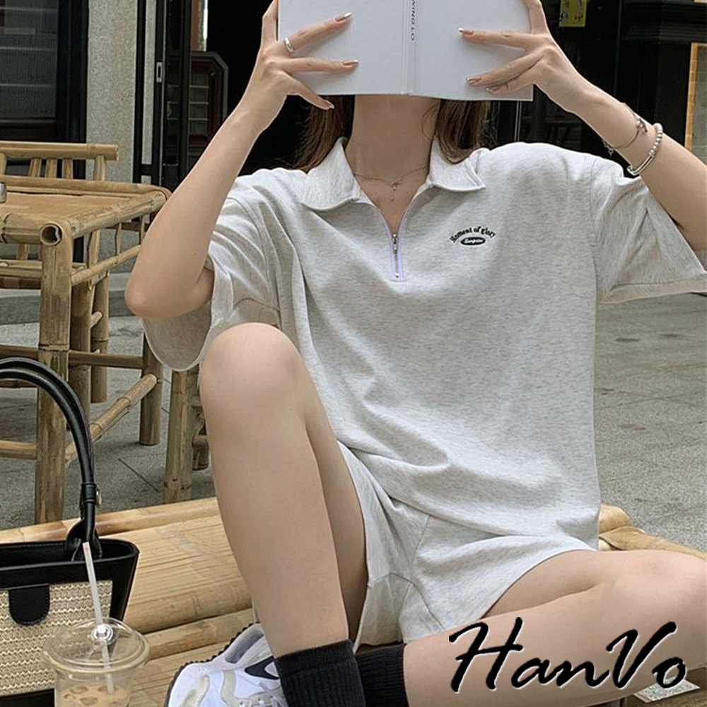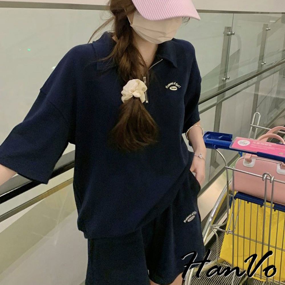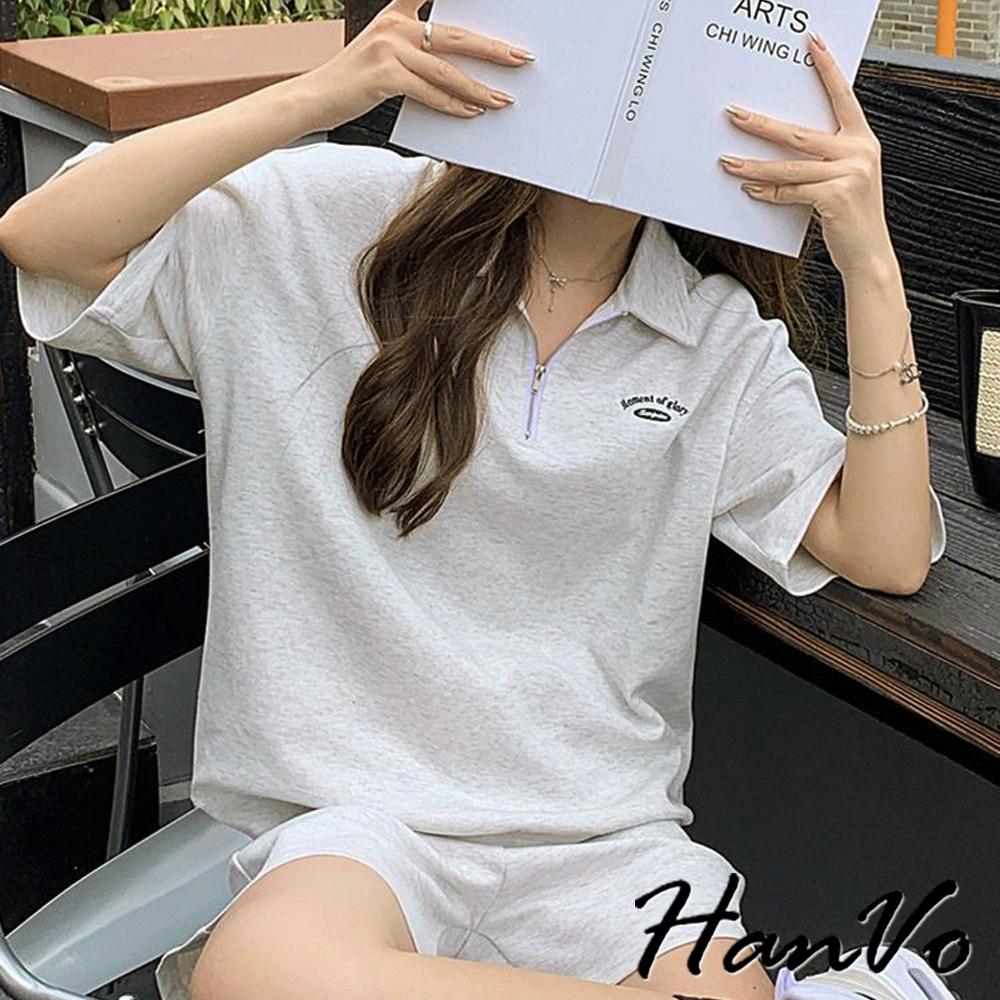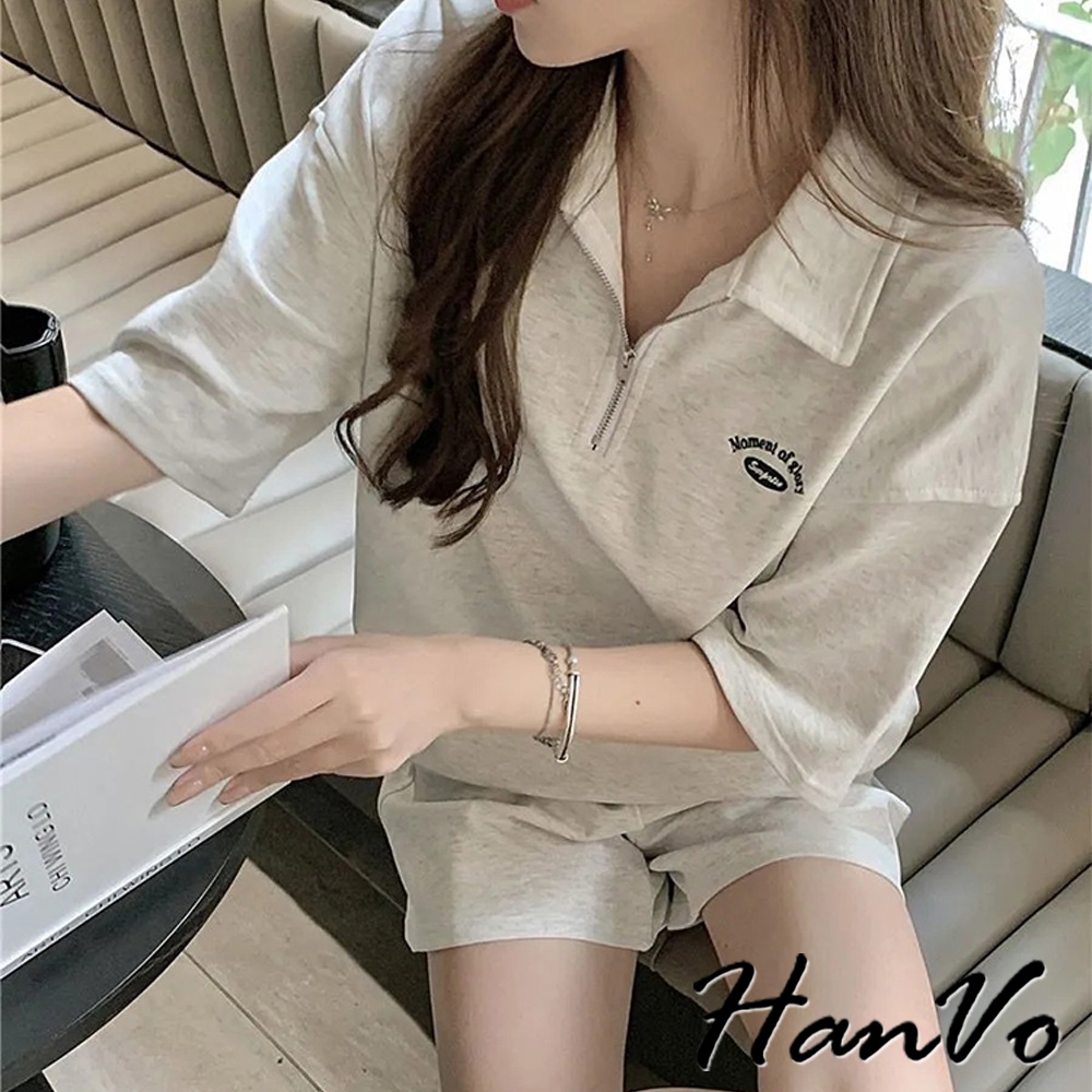 【HanVo】POLO翻領拉鍊休閒套裝 寬鬆舒適簡約百搭 日常韓系女裝 女生衣著 A08-5990灰色|深藍Individual SetsHanVo Wear Collection