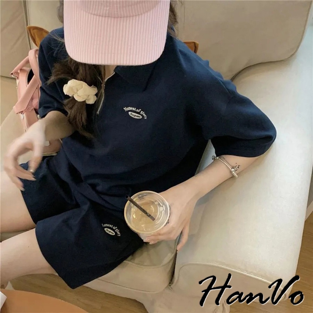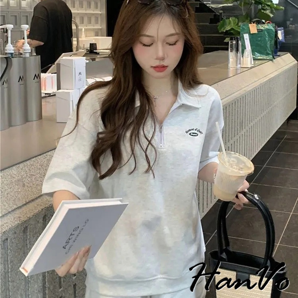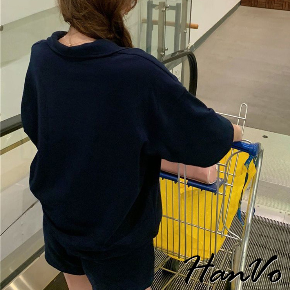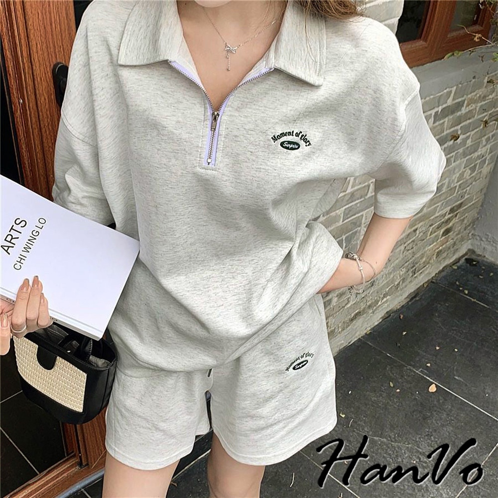 【HanVo】POLO翻領拉鍊休閒套裝 寬鬆舒適簡約百搭 日常韓系女裝 女生衣著 A08-5990灰色|深藍Individual SetsHanVo Wear Collection