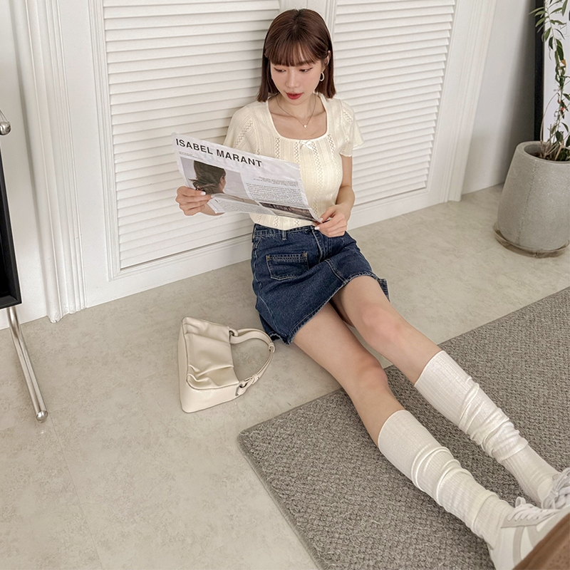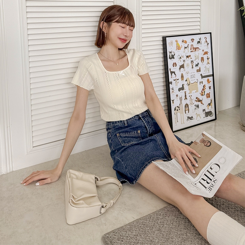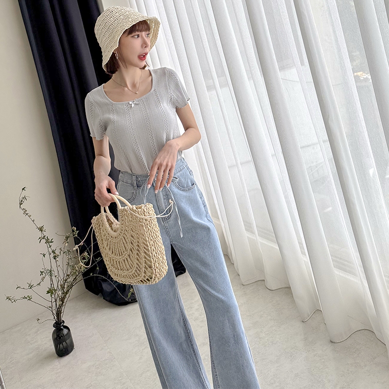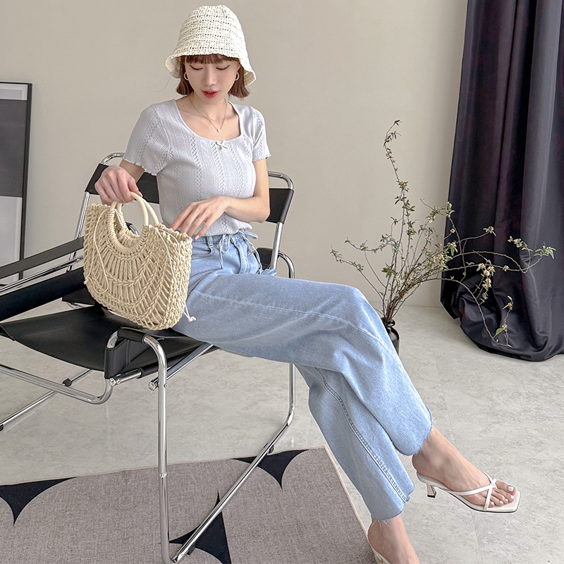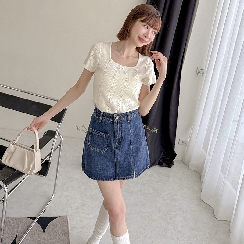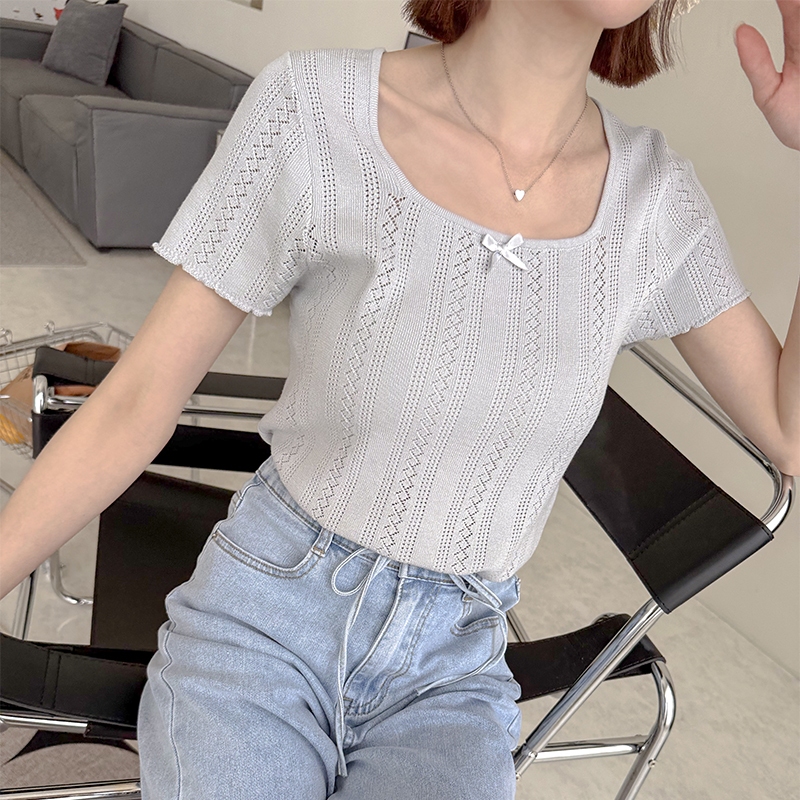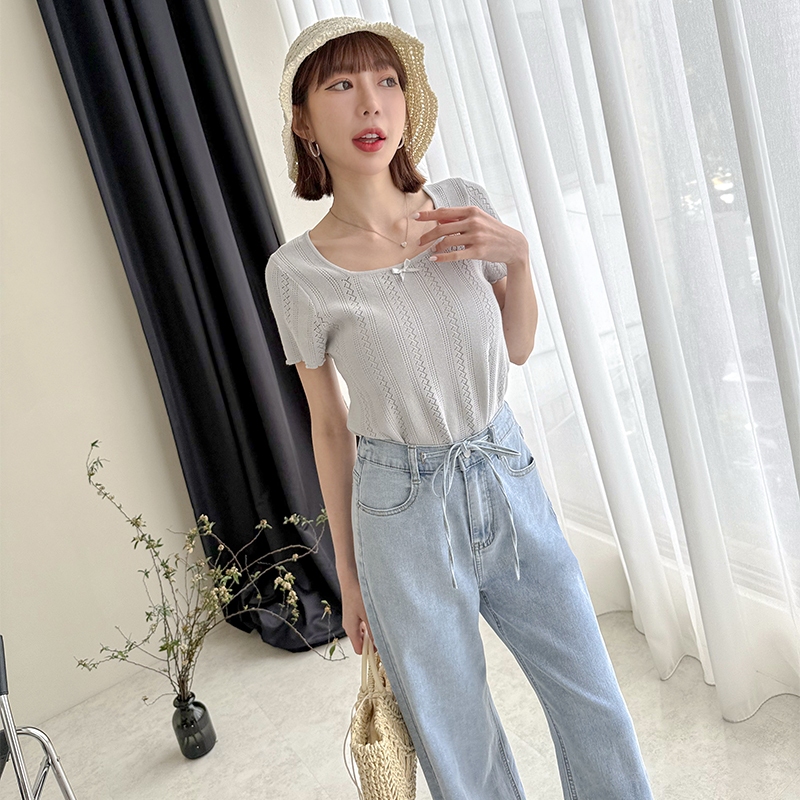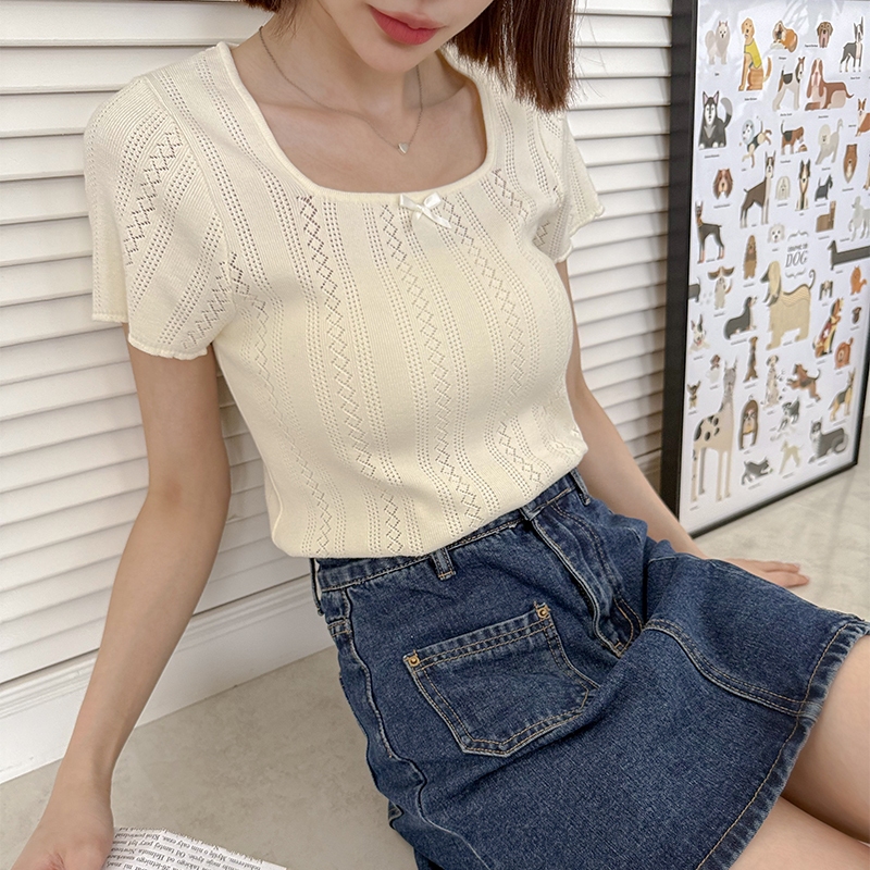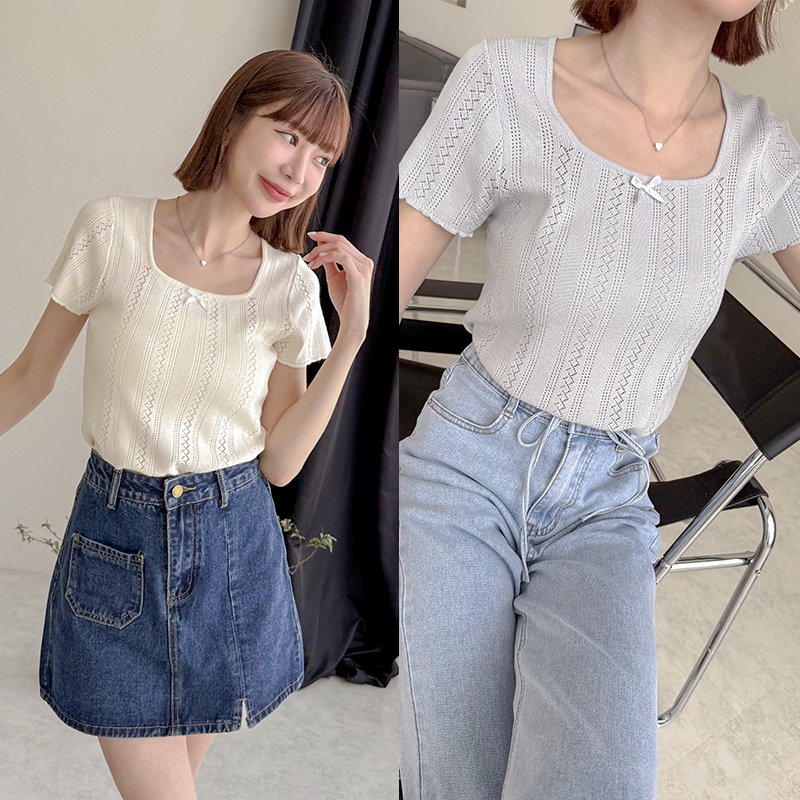 【HARPER】蝴蝶結簍空針織上衣 | 現貨 蝴蝶結 上衣 短袖【CLE37920J】米杏,F|藍,FHARPER