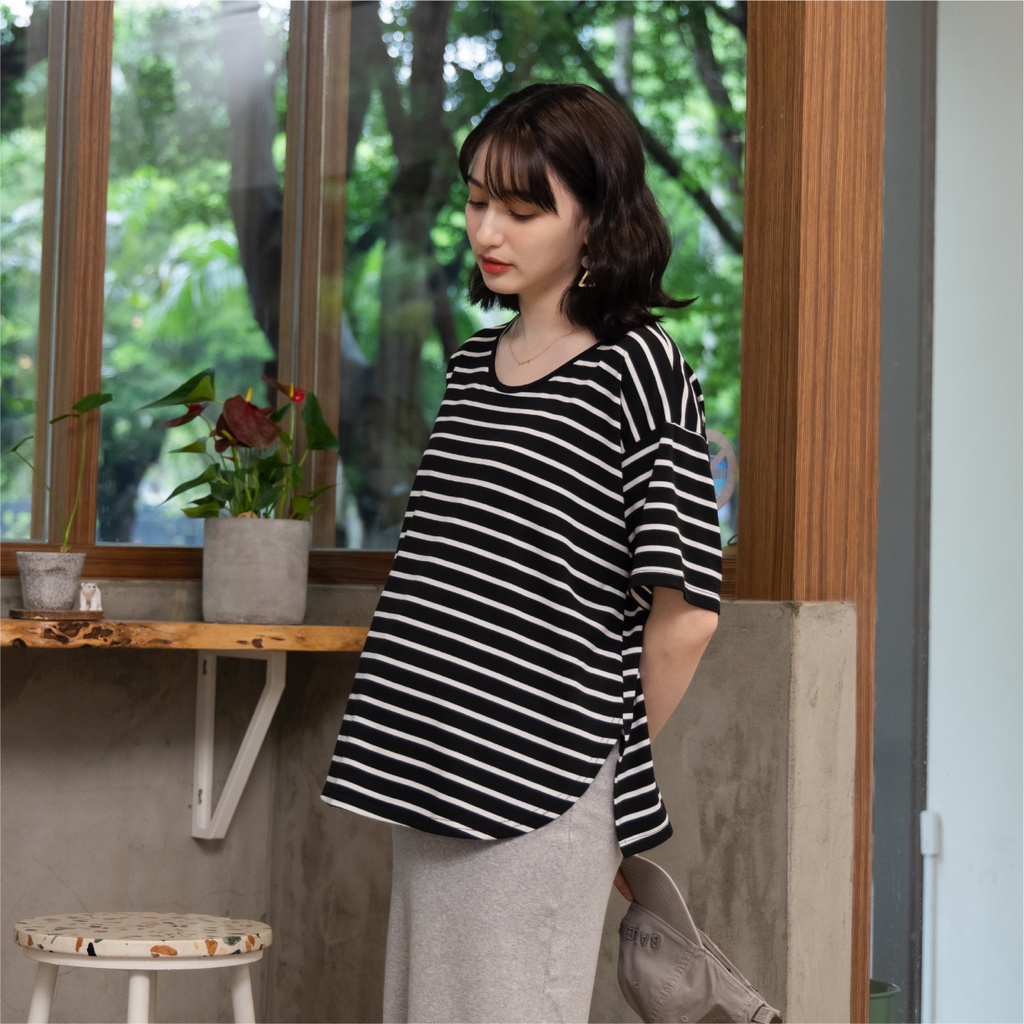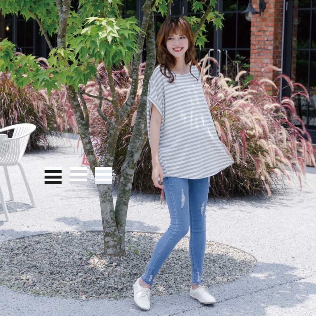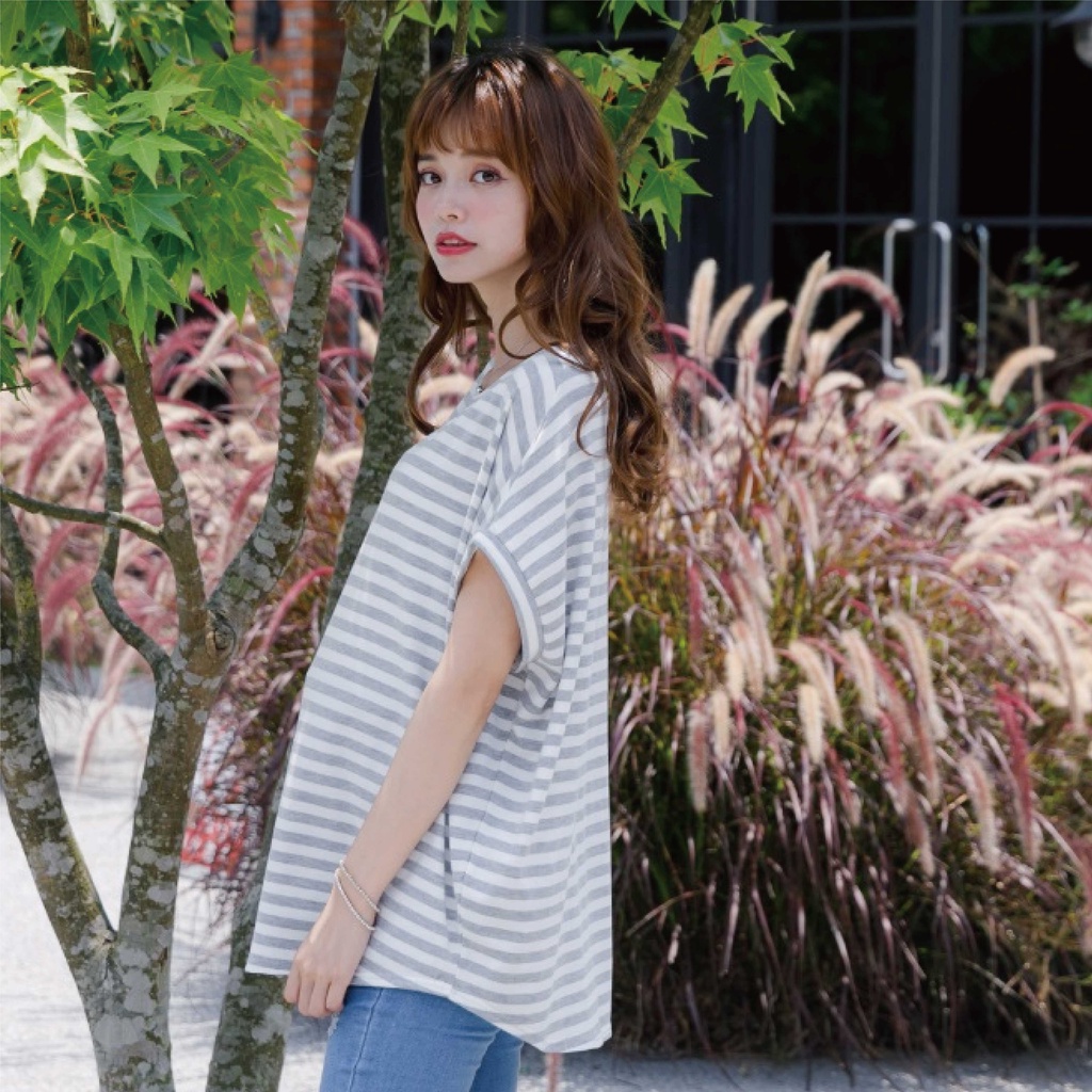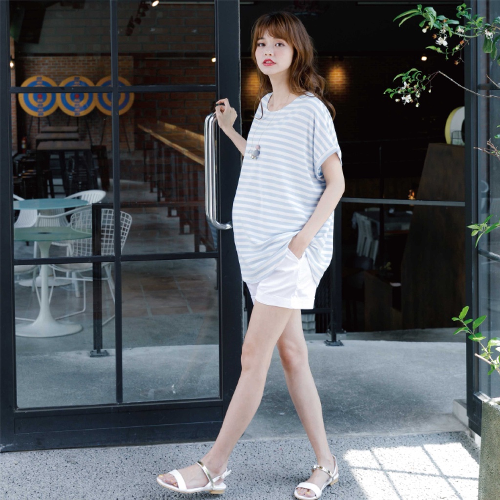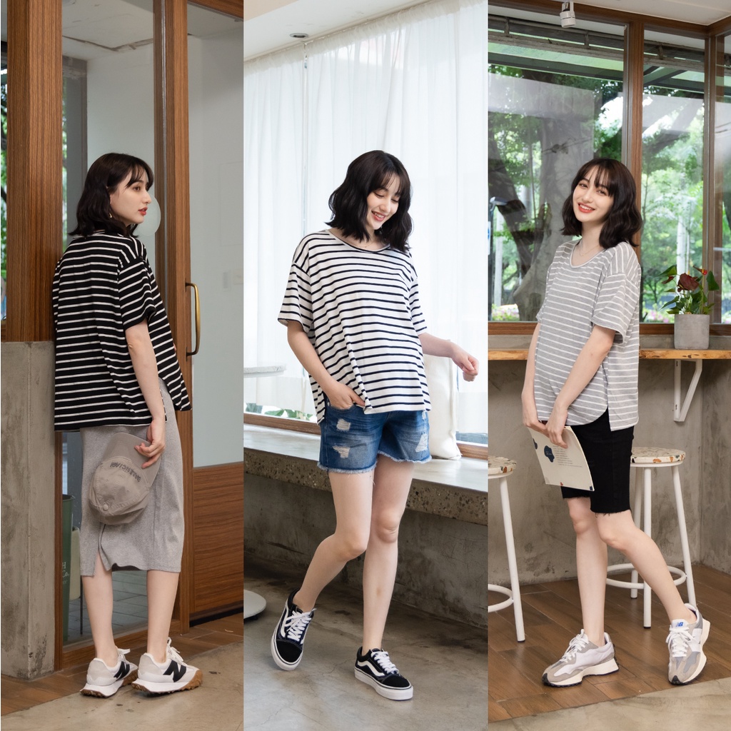Mamamia孕婦裝 休閒條紋側開岔孕婦裝 正韓製 短袖 孕婦上衣 寬T 百搭T T恤 [A1727]黑|灰|白Maternity TopsMamamia孕婦裝