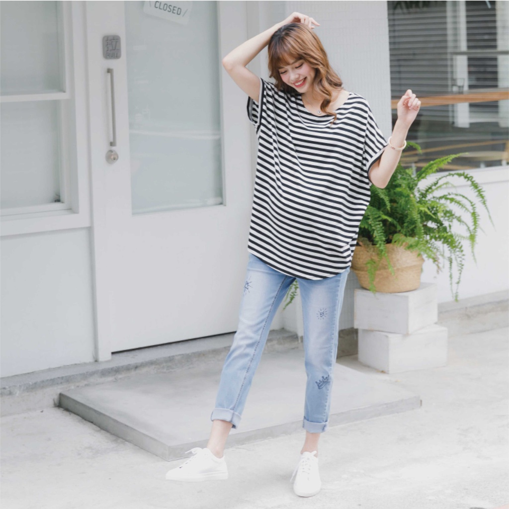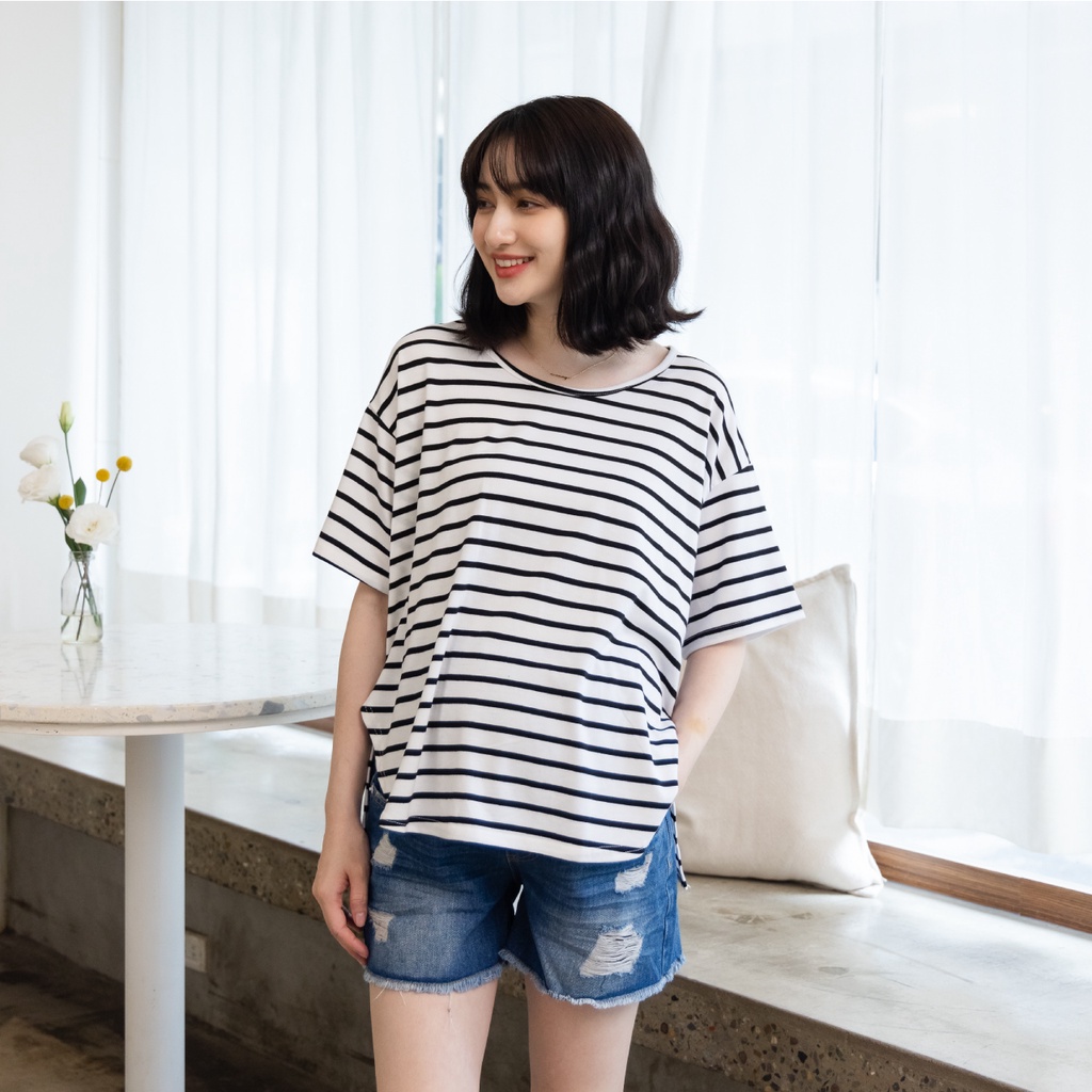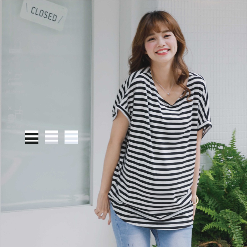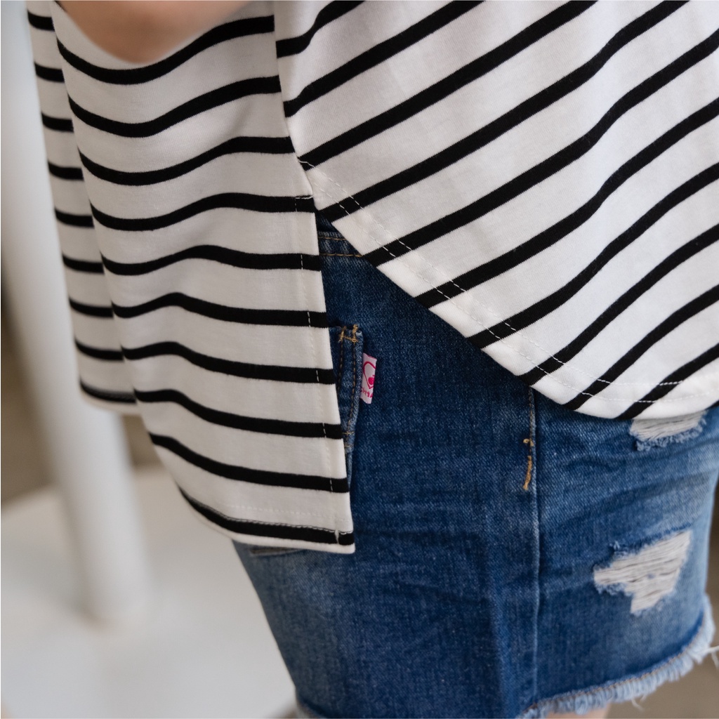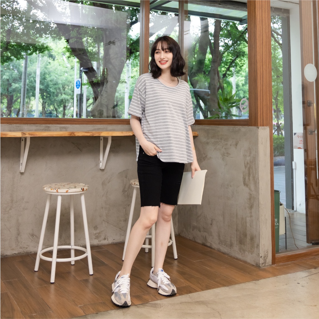 Mamamia孕婦裝 休閒條紋側開岔孕婦裝 正韓製 短袖 孕婦上衣 寬T 百搭T T恤 [A1727]黑|灰|白Maternity TopsMamamia孕婦裝
